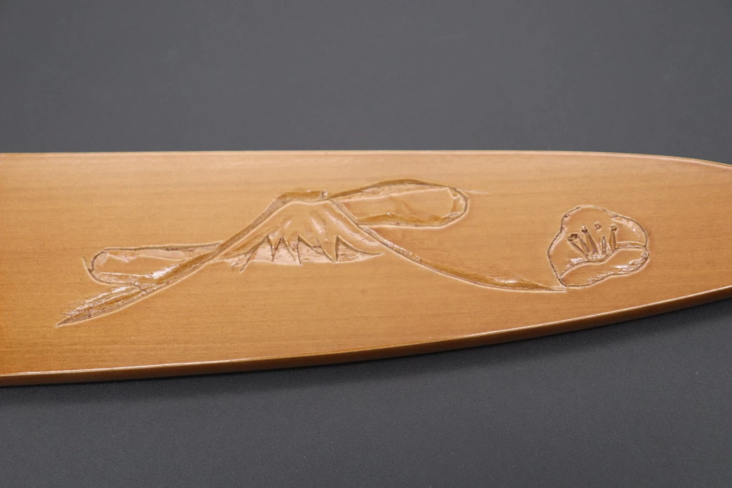 Each Special Edition Wooden Saya has been custom hand carved with a design motif inspired by Japan’s beautiful scenery, nature or culture. This one, is the “Mt. Fuji Special Edition Hand Carved Saya”.
