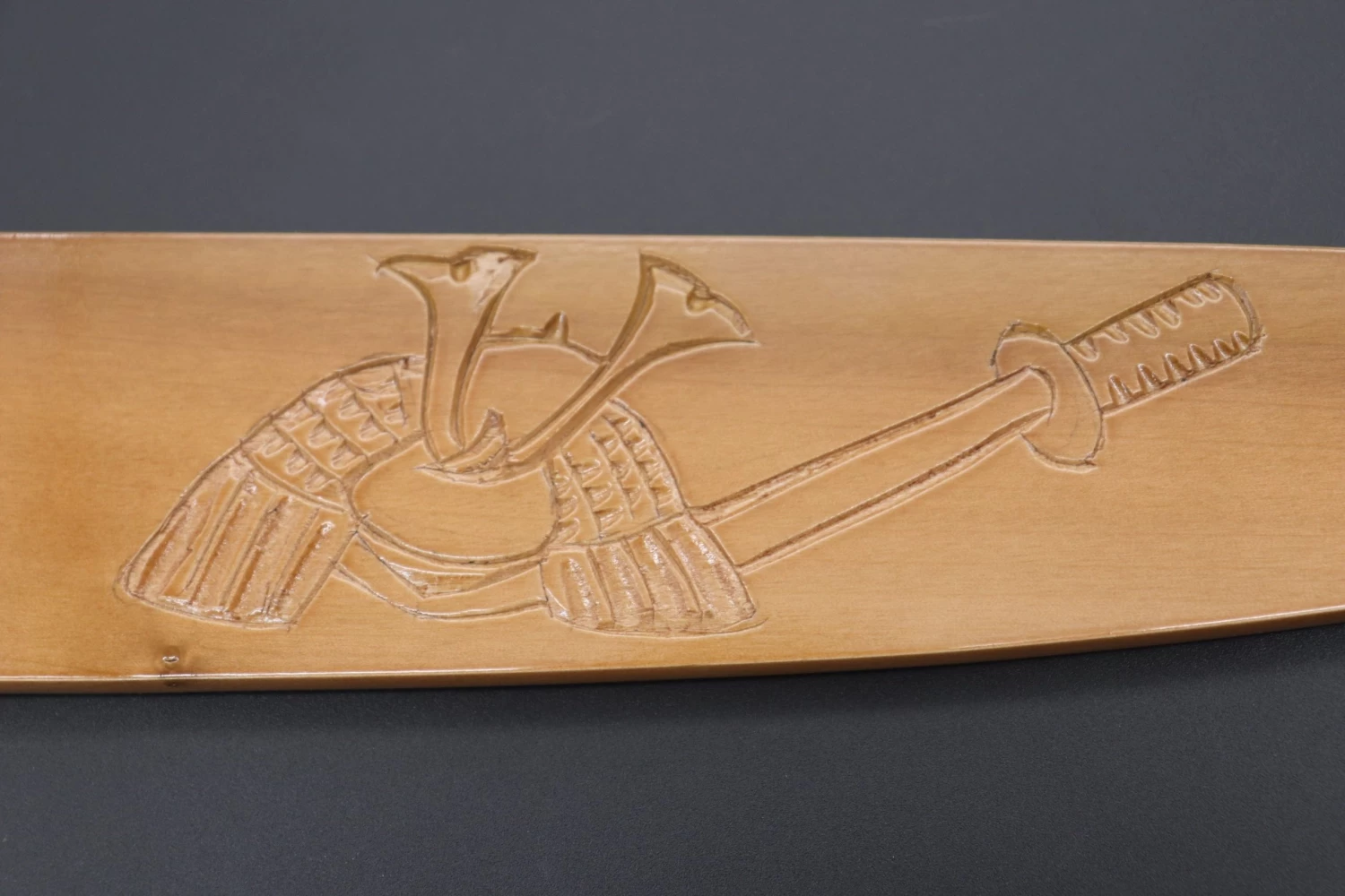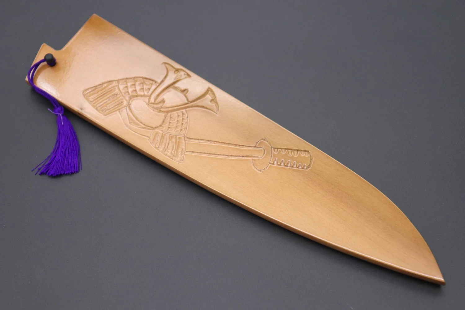 Each Special Edition Wooden Saya has been custom hand carved with a design motif inspired by Japan’s beautiful scenery, nature or culture. This one, is the “Kabuto Special Edition Hand Carved Saya” (Kabuto are a type of helmet historically worn by Samurai).
