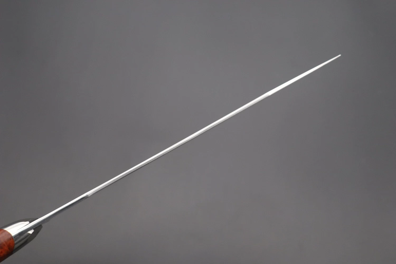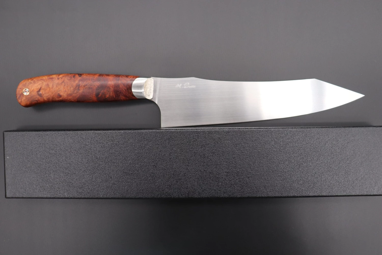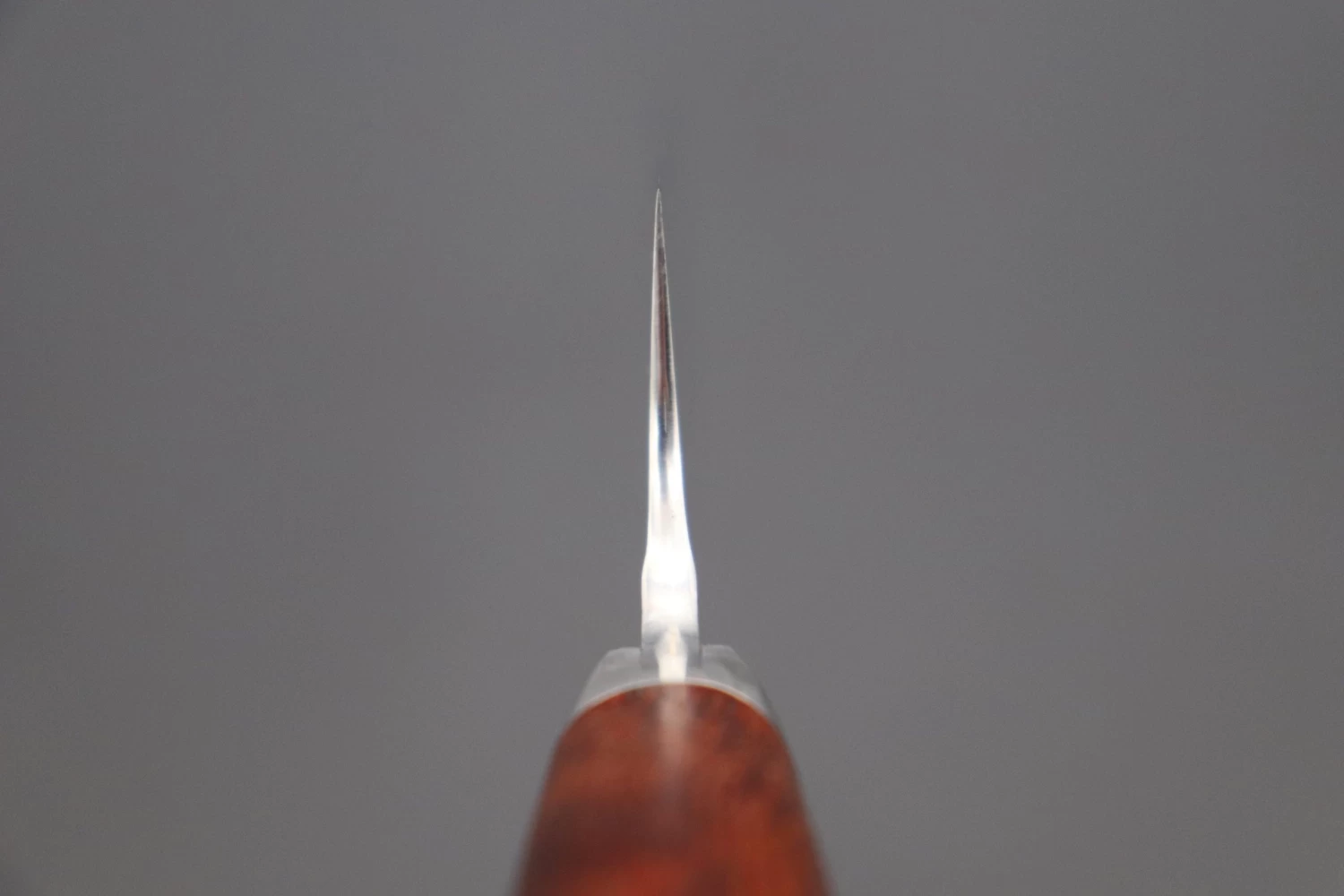 The slightly rounded curved shape of handmade Quince Burl Wood Handle and stainless bolster are designed to match the beautifully hand-polished, hair lined finished VG-10 Up-Swept blade shape and to fit the so-called ‘pinch grip’, the way many numbers of users hold a knife. Designed to be easy to grip, the handle is hand contoured and finished for universal use.