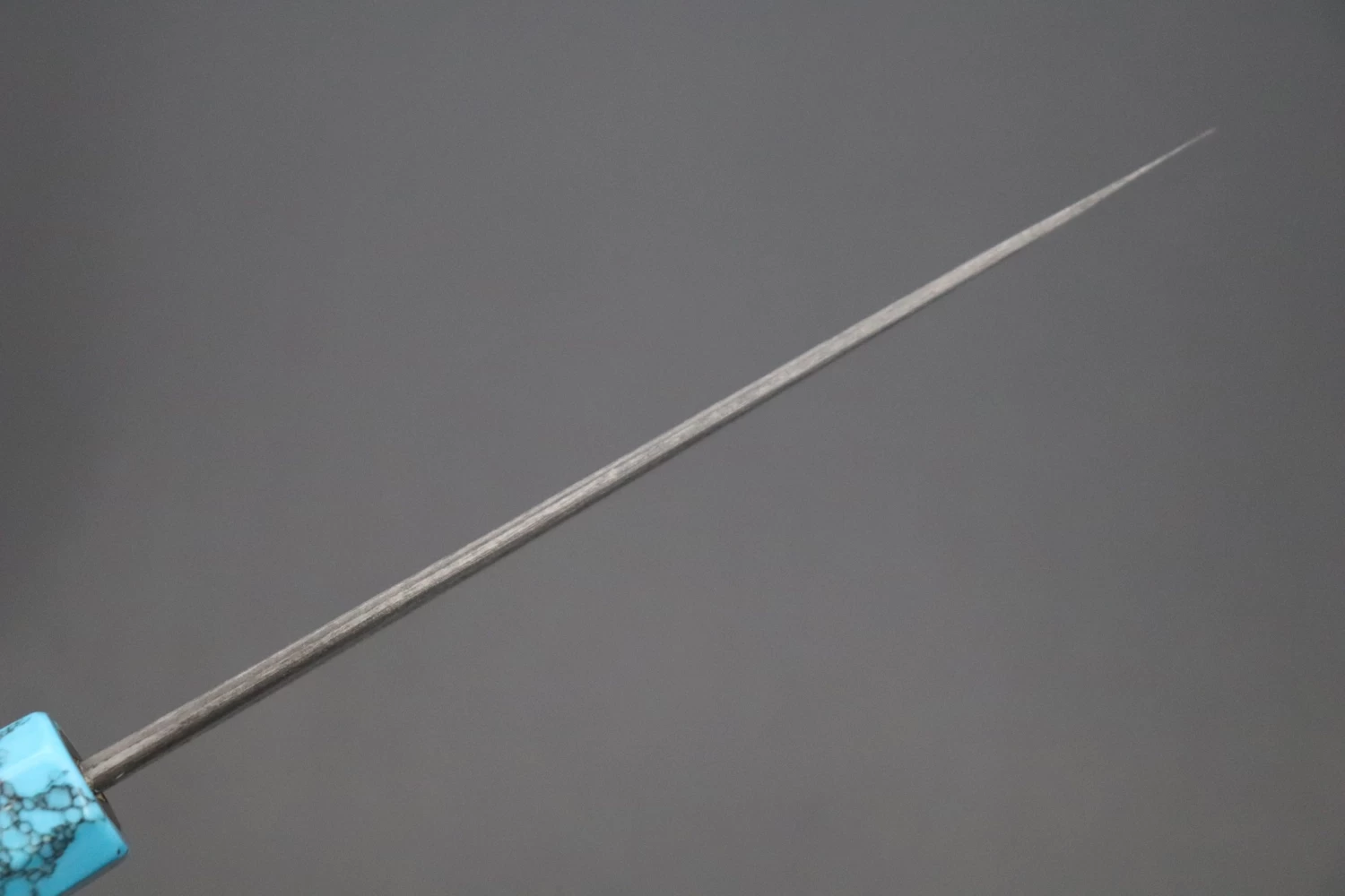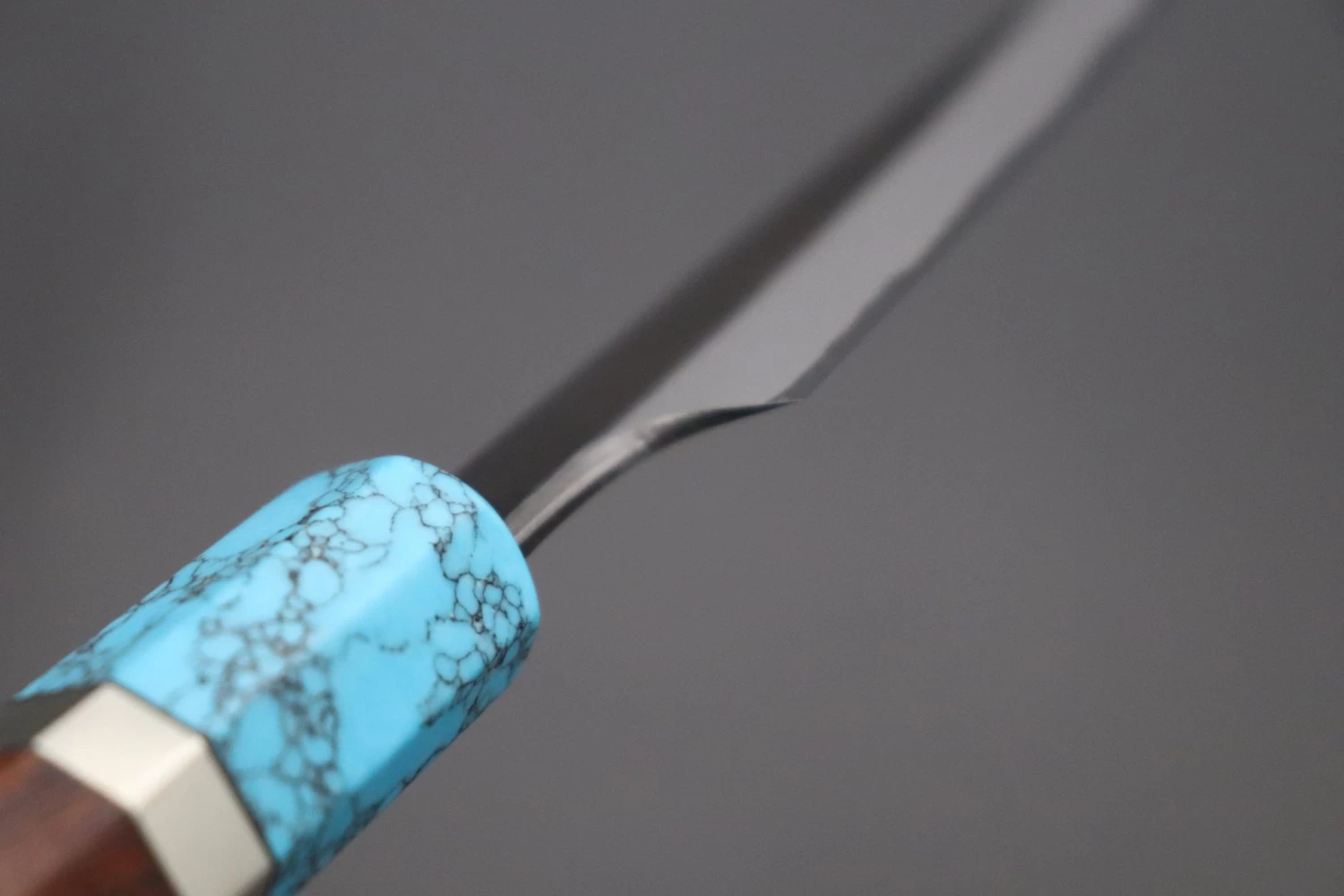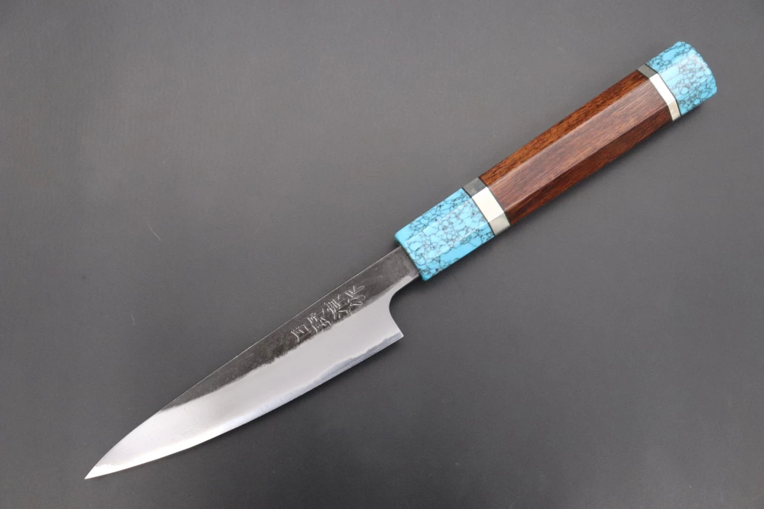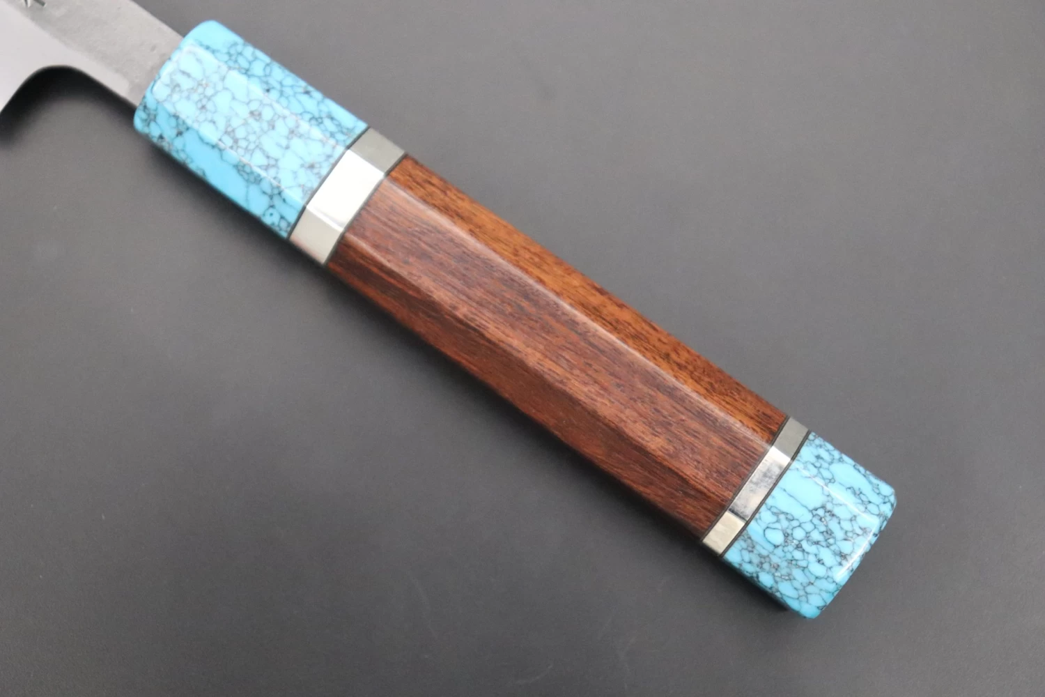 This is the Custom Limited Edition Special Knife Collection. Beautifully polished and finished, Hinoura’s natural gradation color and taste of the modern & traditional Kurouchi Wa Petty Knife is fitted with a Innovative Octagonal Desert Ironwood handle with a Turquoise Composite Stone Ferrule & Butt with Nickel Silver Spacers. Please feel the harmony of the traditional historical art and modern, high-sense design, quality.