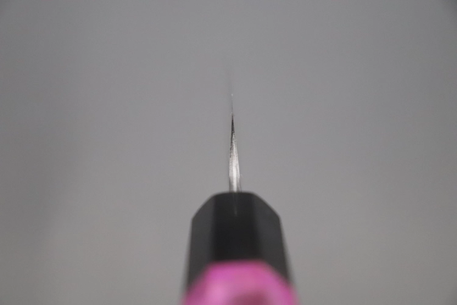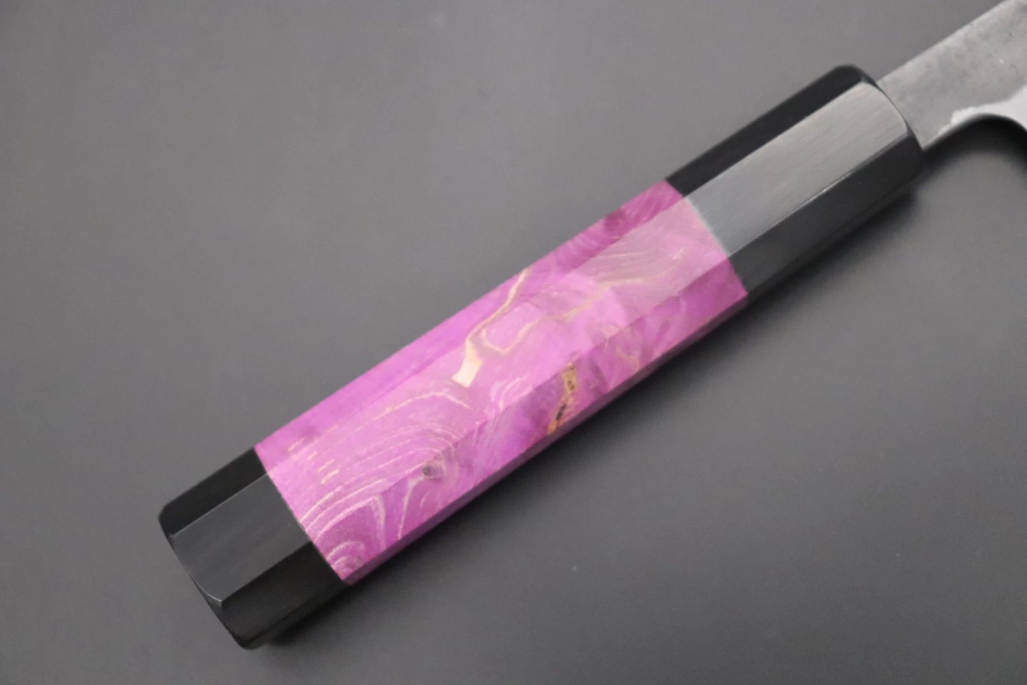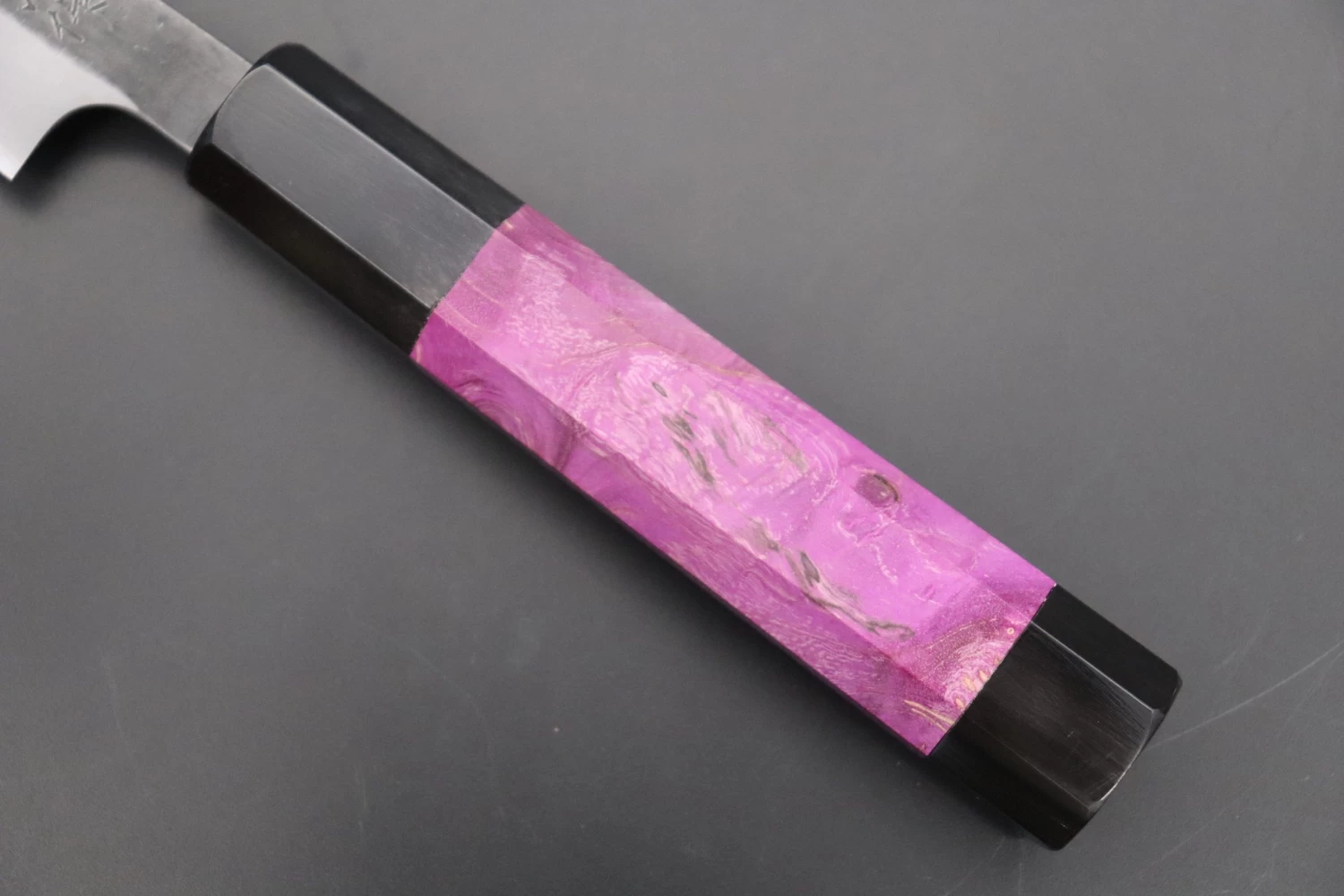 This is the Custom Limited Edition Special Knife Collection. Beautifully polished and finished, Hinoura’s natural gradation color and taste of the modern & traditional Kurouchi Wa Petty Knife is fitted with a Innovative Royal Purple Color of Octagonal Handle, which is made from Stabilized Maple Burl Wood and has a Water Buffalo Horn Ferrule & Butt. Please feel the harmony of the traditional historical art and modern, high-sense design, quality.