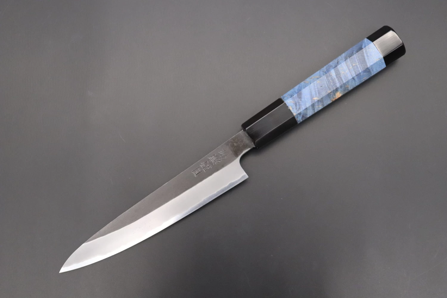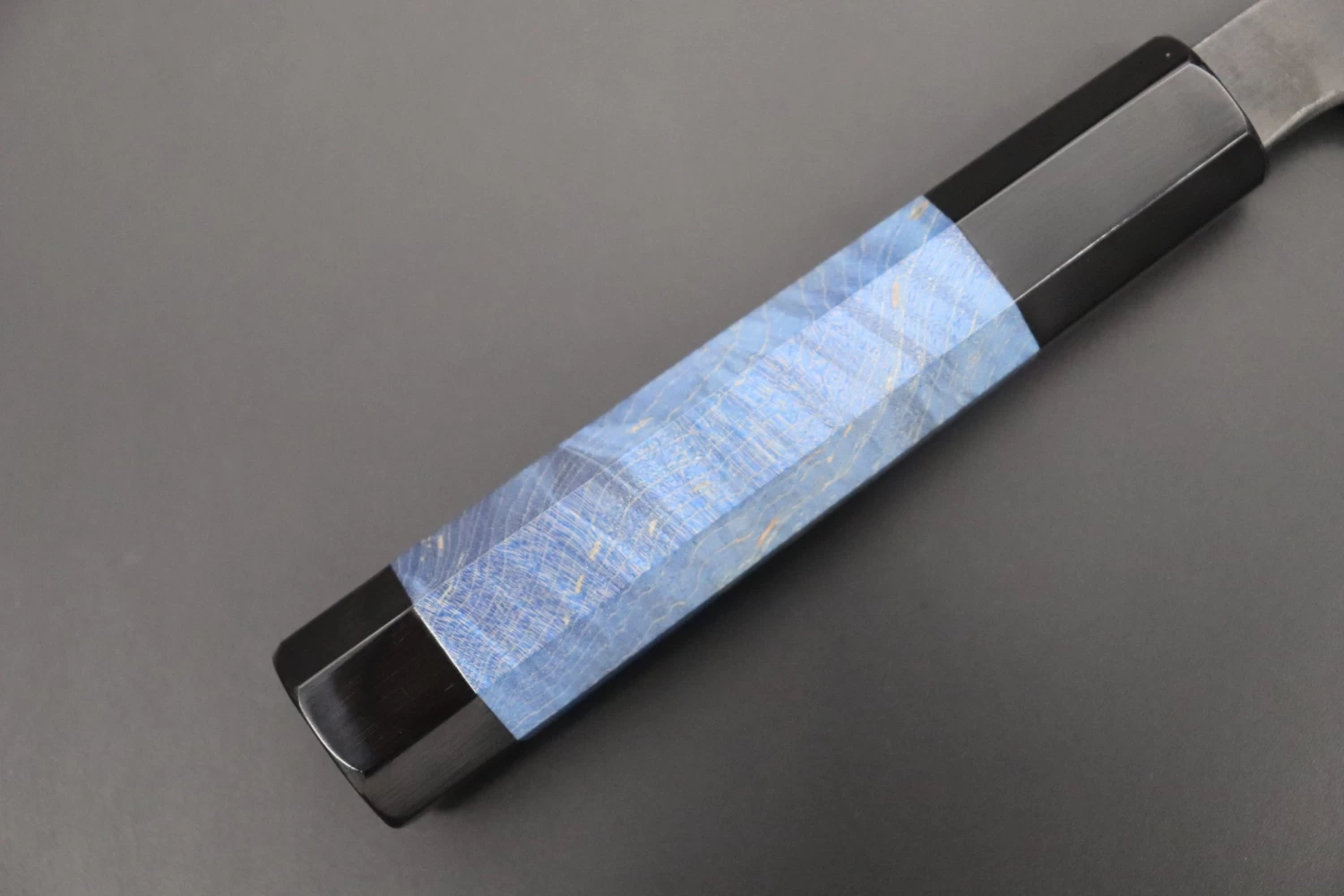 This is the Custom Limited Edition Special Knife Collection. Beautifully polished and finished, Hinoura’s natural gradation color and taste of the modern & traditional Kurouchi Wa Petty Knife is fitted with a Innovative Ocean Blue Color of Octagonal Handle, which is made from Stabilized Maple Burl Wood and has a Water Buffalo Horn Ferrule & Butt. Please feel the harmony of the traditional historical art and modern, high-sense design, quality.