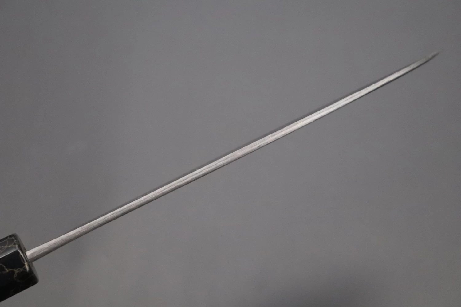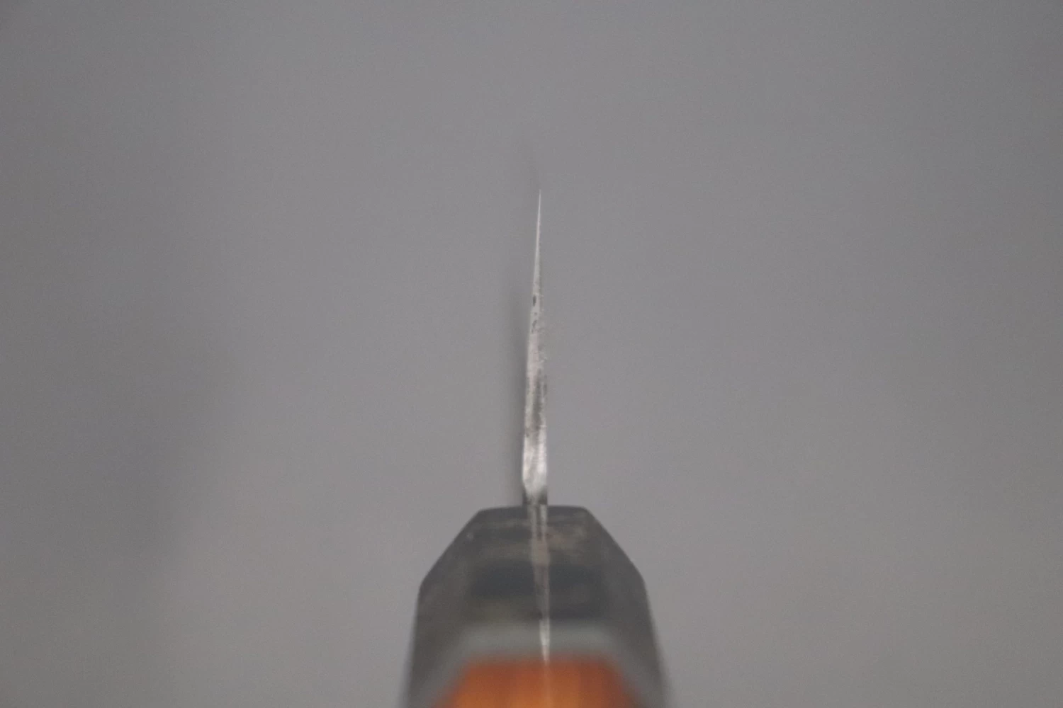 More Information: Unlike many traditionally forged knives, Master Hinoura’s knives have a relatively thick spine at the point where the tang enters the handle (The ‘neck’). In part, this because he forges these laminated knives using a piece of high carbon steel that is much thicker than that commonly used by other forge-smiths. The thick spine and neck makes the knife very strong, very comfortable to hold in a ‘pinch-grip’ and also results in excellent blade balance.