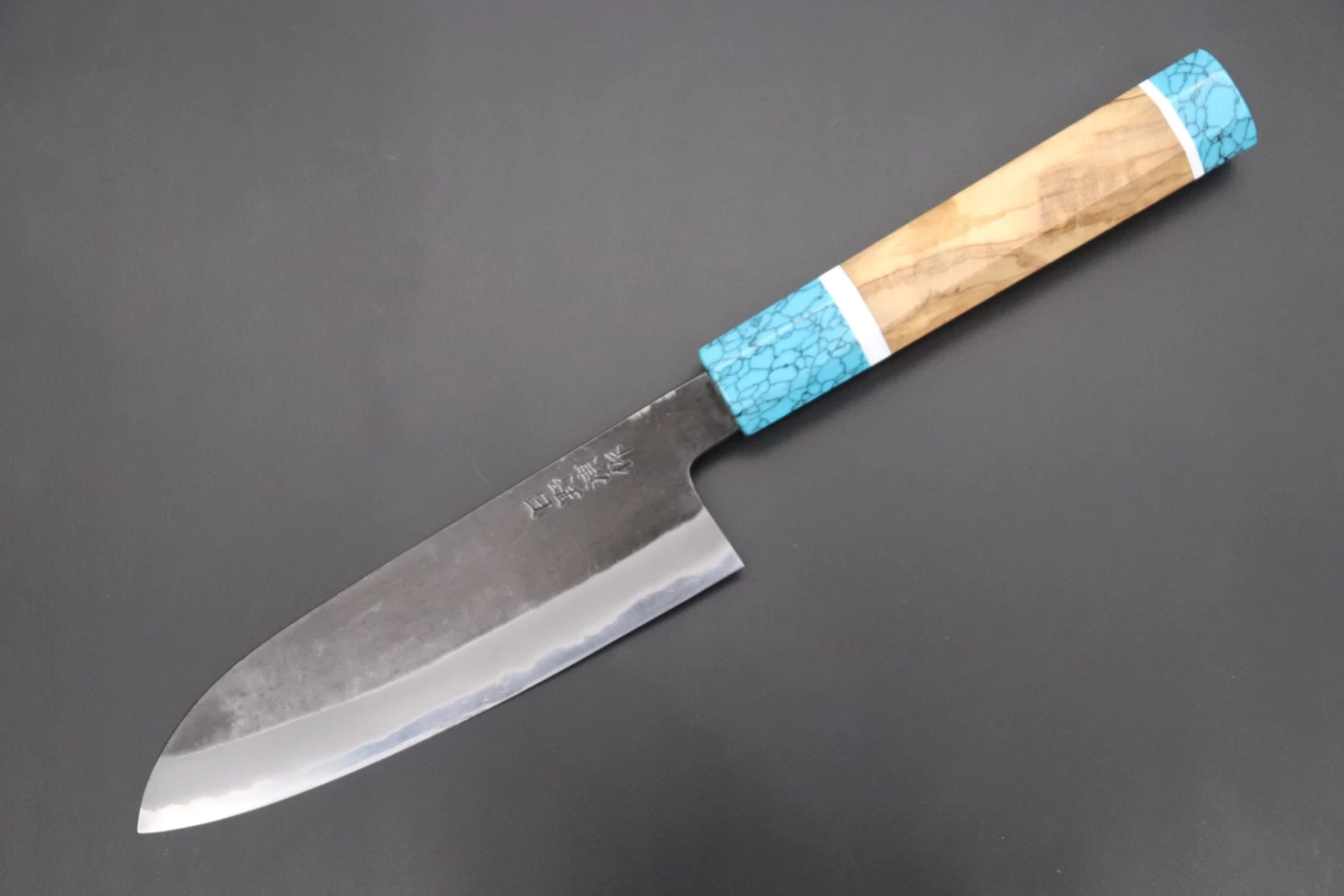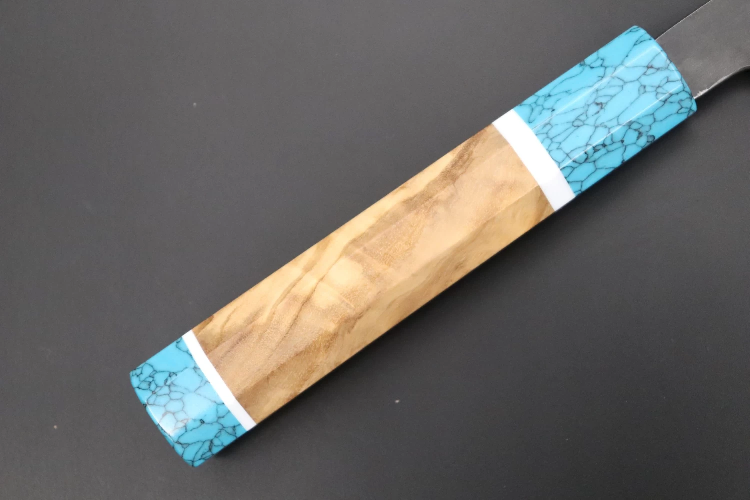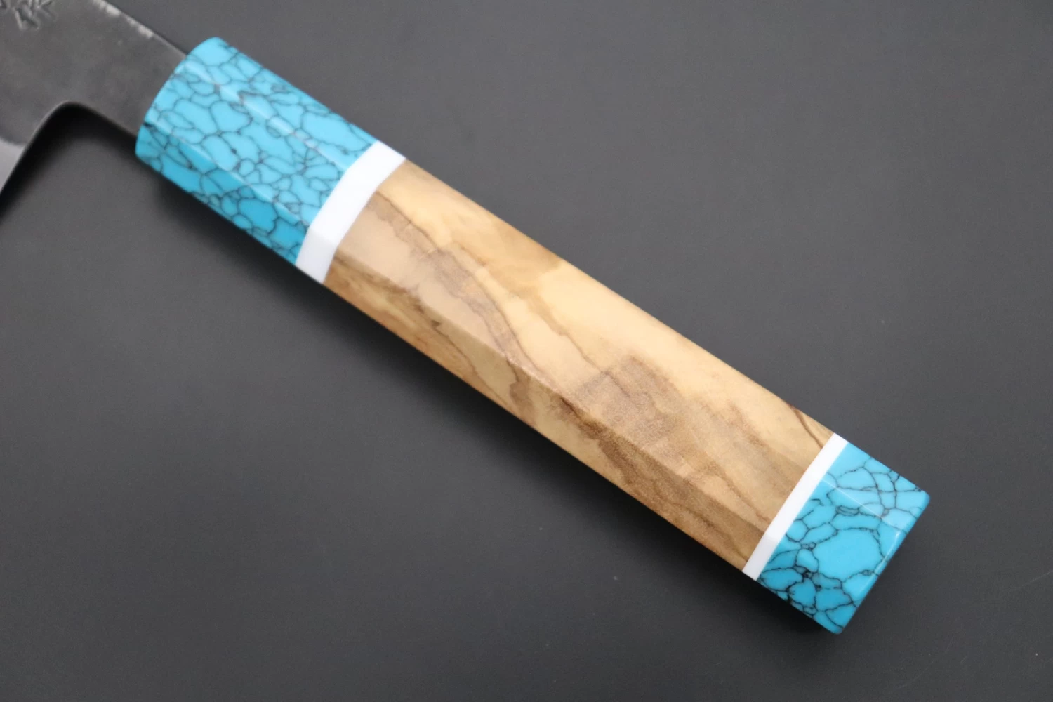This is the Custom Limited Edition Special Knife Collection. Beautifully polished and finished, Hinoura’s natural gradation color and taste of the modern & traditional Kurouchi Wa Santoku Knife is fitted a with a Innovative Octagonal Olivewood Handle with a Turquoise Composite Stone Ferrule & Butt with White Spacers. Please feel the harmony of the traditional historical art and modern, high-sense design, quality.