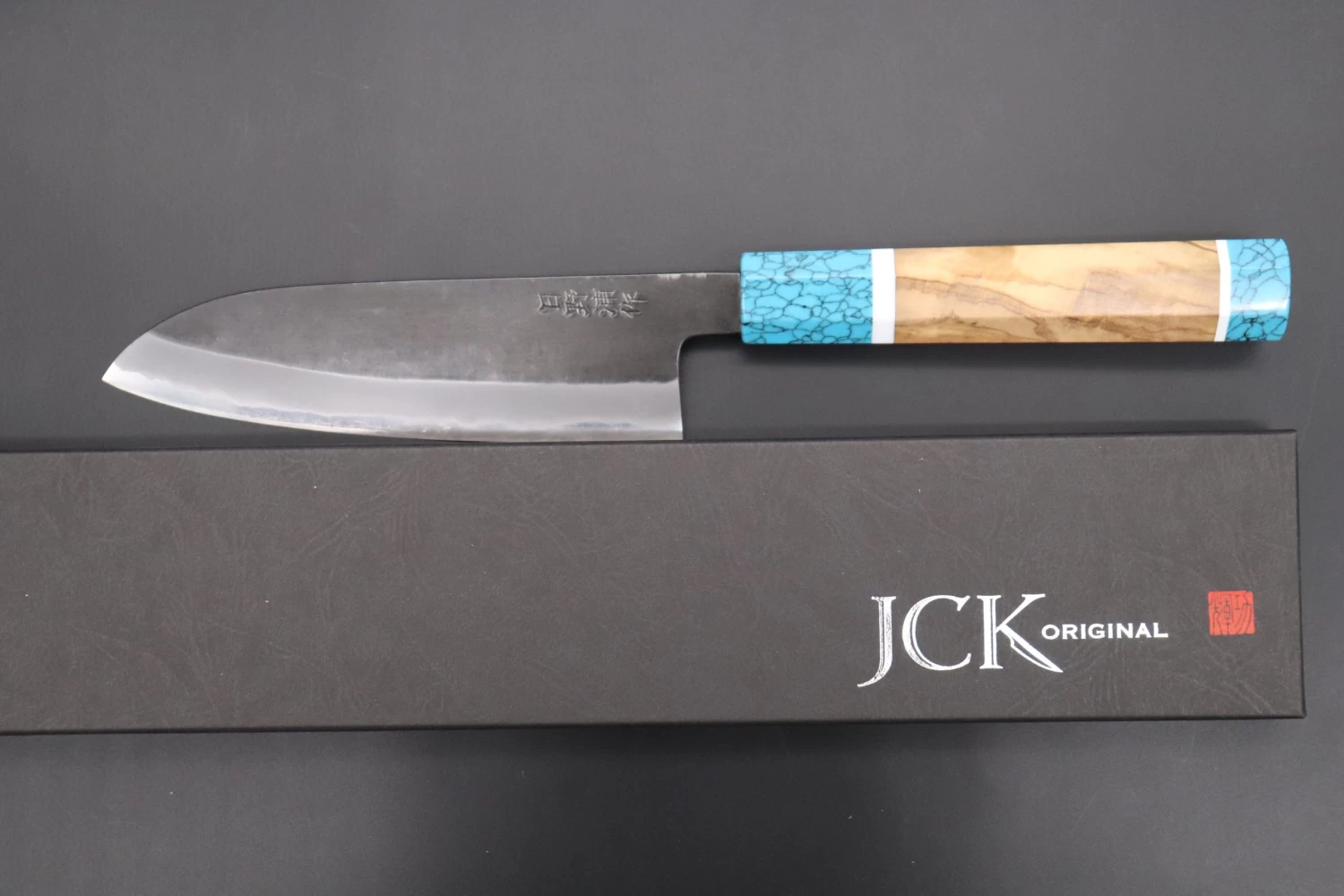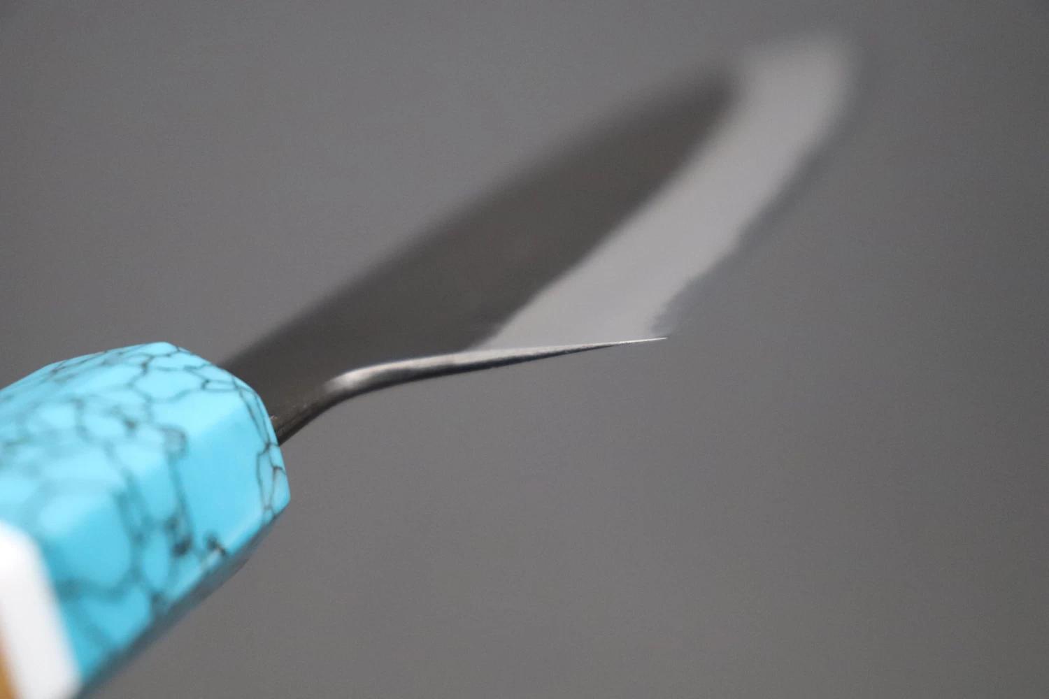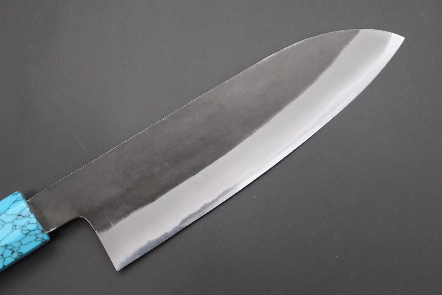This is the Custom Limited Edition Special Knife Collection. Beautifully polished and finished, Hinoura’s natural gradation color and taste of the modern & traditional Kurouchi Wa Santoku Knife is fitted a with a Innovative Octagonal Olivewood Handle with a Turquoise Composite Stone Ferrule & Butt with White Spacers. Please feel the harmony of the traditional historical art and modern, high-sense design, quality.