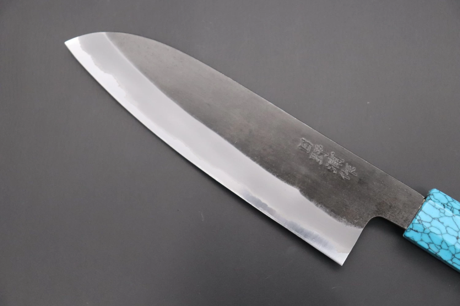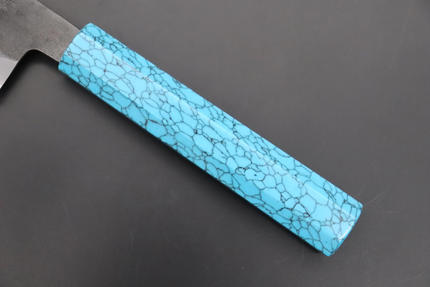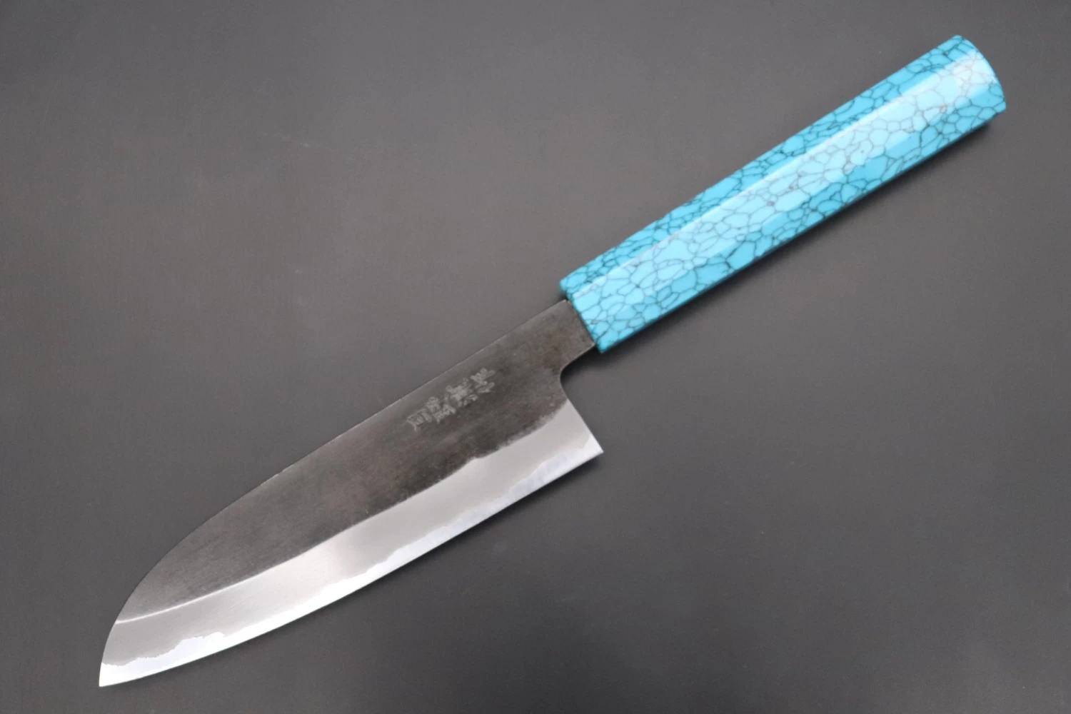 This is the Custom Limited Edition Special Knife Collection. Beautifully polished and finished, Hinoura’s natural gradation color and taste of the modern & traditional Kurouchi Wa Santoku Knife is fitted a with a Innovative Octagonal Turquoise Composite Stone Handle. Please feel the harmony of the traditional historical art and modern, high-sense design, quality.