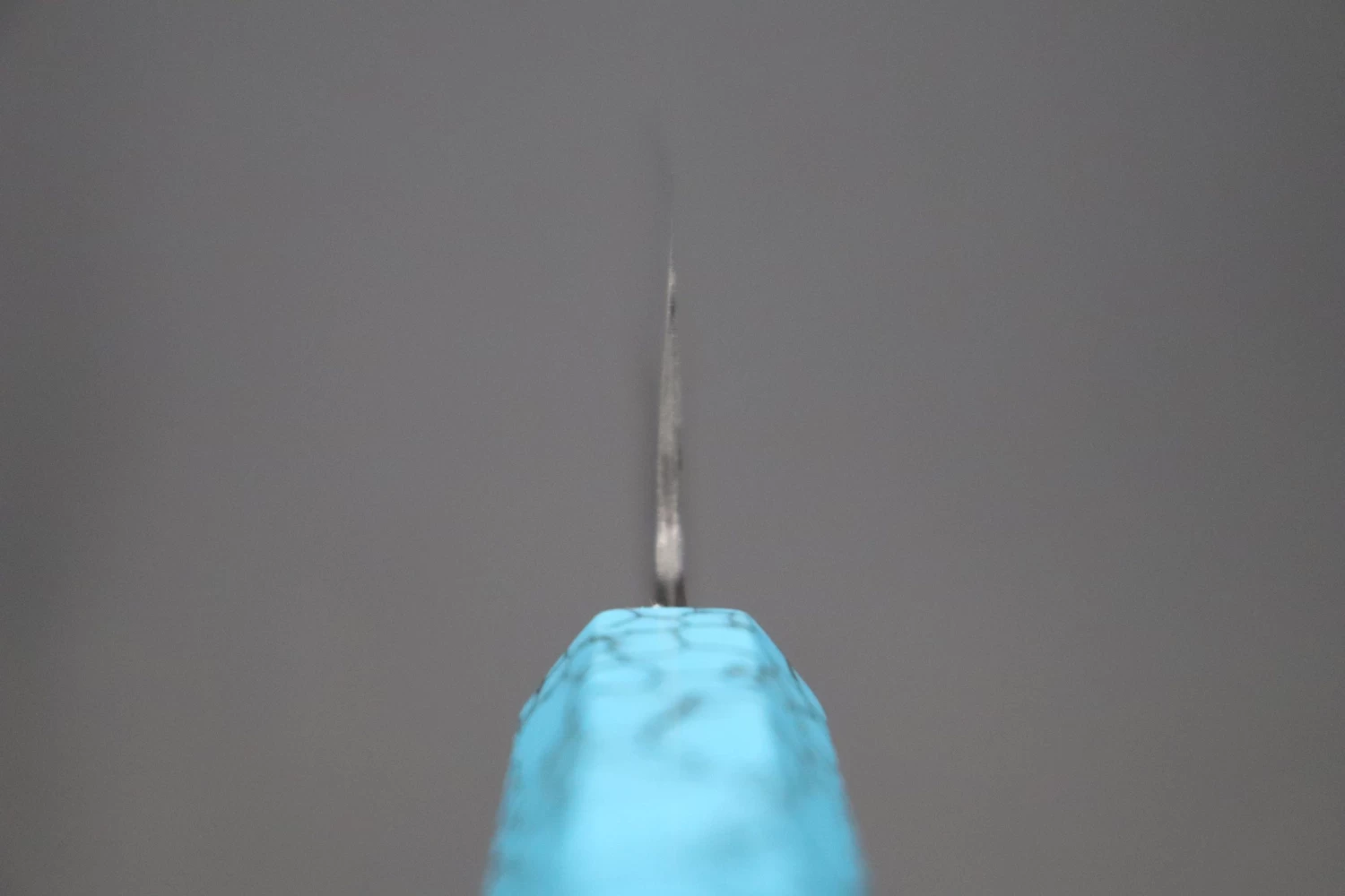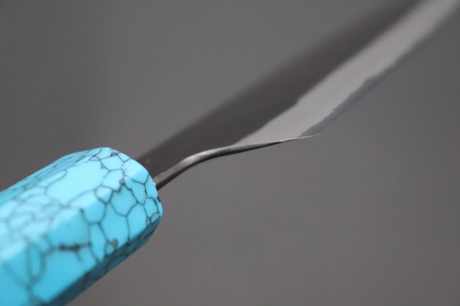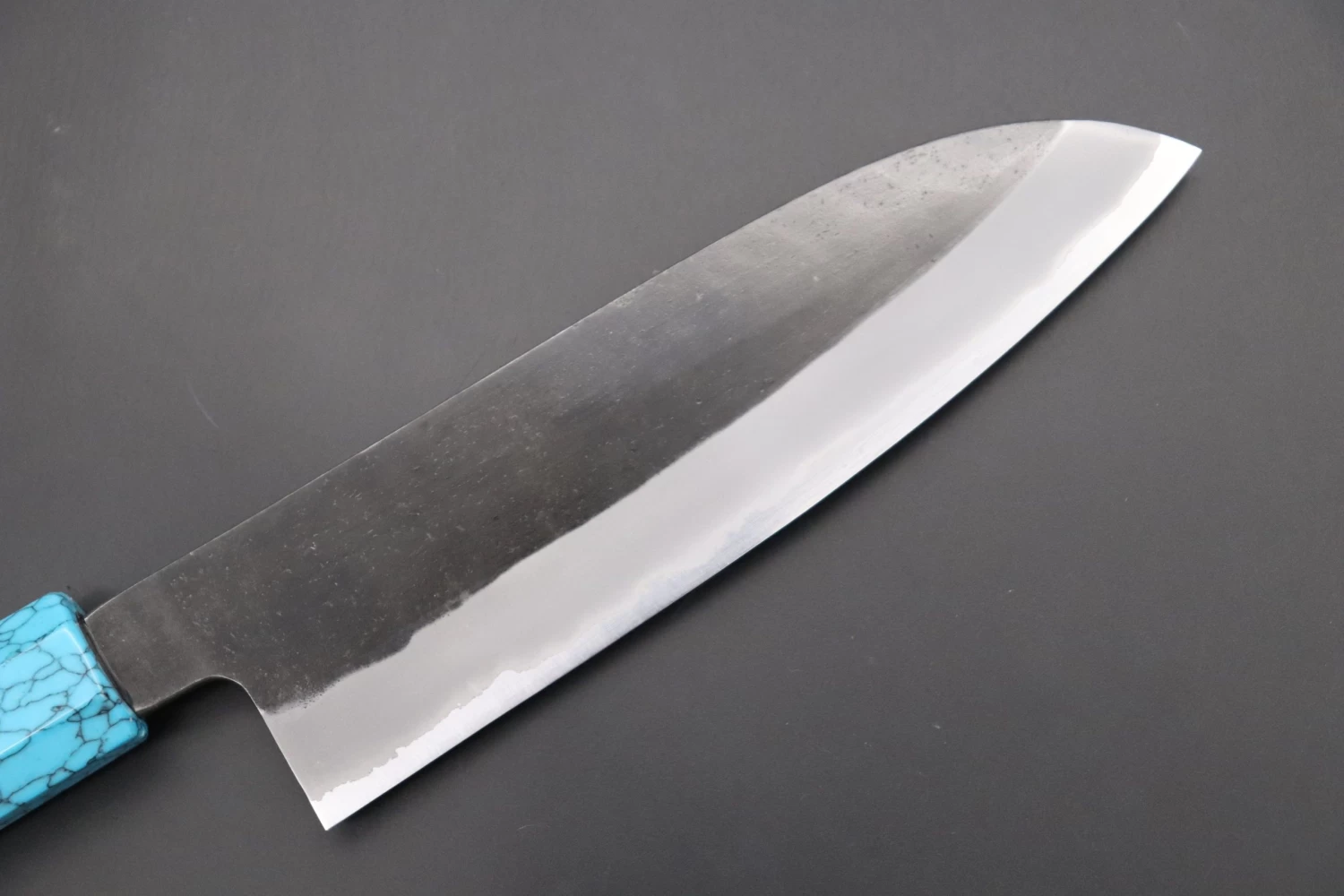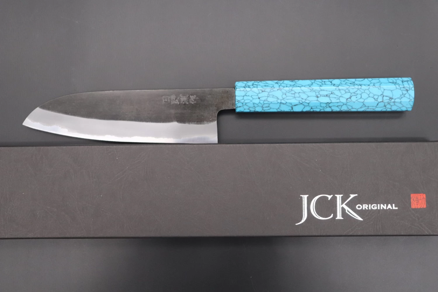 This is the Custom Limited Edition Special Knife Collection. Beautifully polished and finished, Hinoura’s natural gradation color and taste of the modern & traditional Kurouchi Wa Santoku Knife is fitted a with a Innovative Octagonal Turquoise Composite Stone Handle. Please feel the harmony of the traditional historical art and modern, high-sense design, quality.