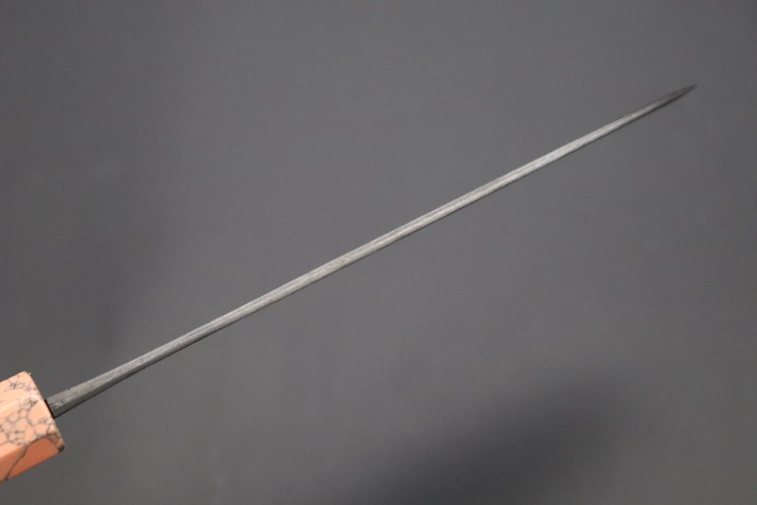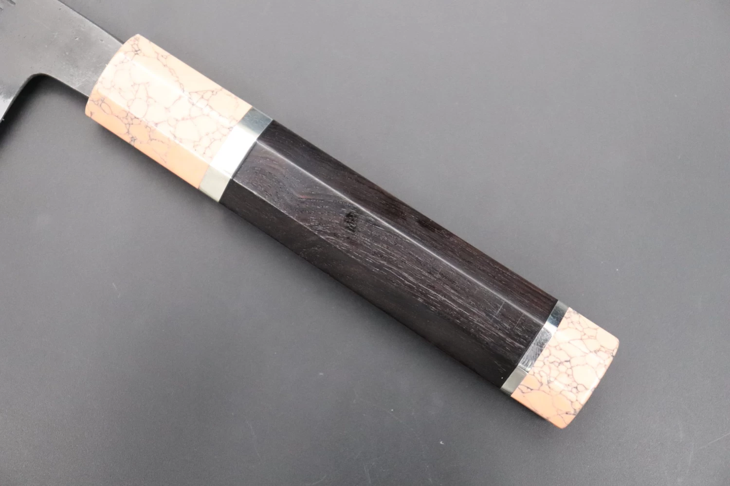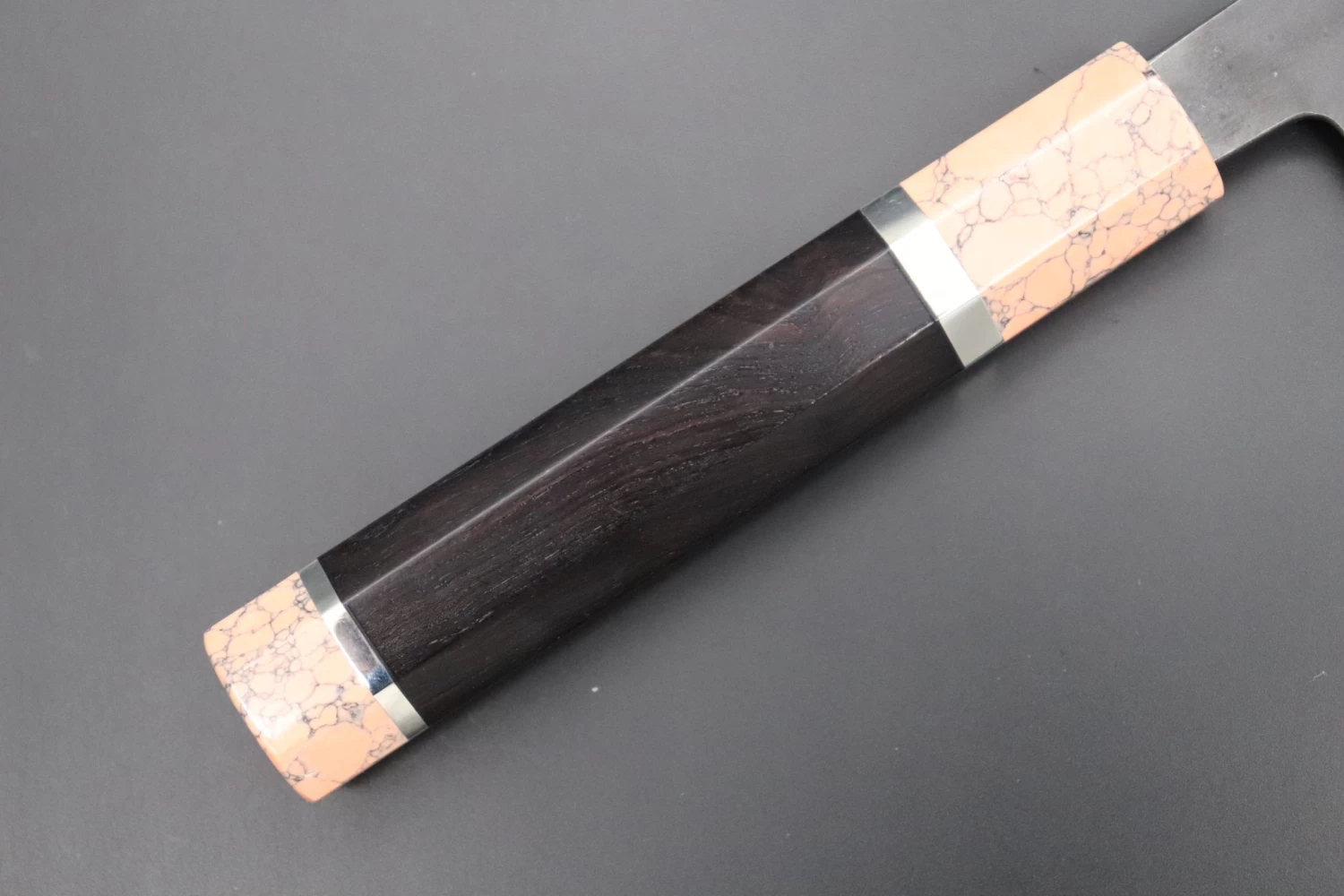 This is the Custom Limited Edition Special Knife Collection. Beautifully polished and finished, Hinoura’s natural gradation color and taste of the modern & traditional Kurouchi Wa Santoku Knife is fitted with a Innovative Octagonal Ebonywood handle with a Soft Pink Turquoise Composite Stone Ferrule & Butt with Nickel Silver Spacers. Please feel the harmony of the traditional historical art and modern, high-sense design, quality.