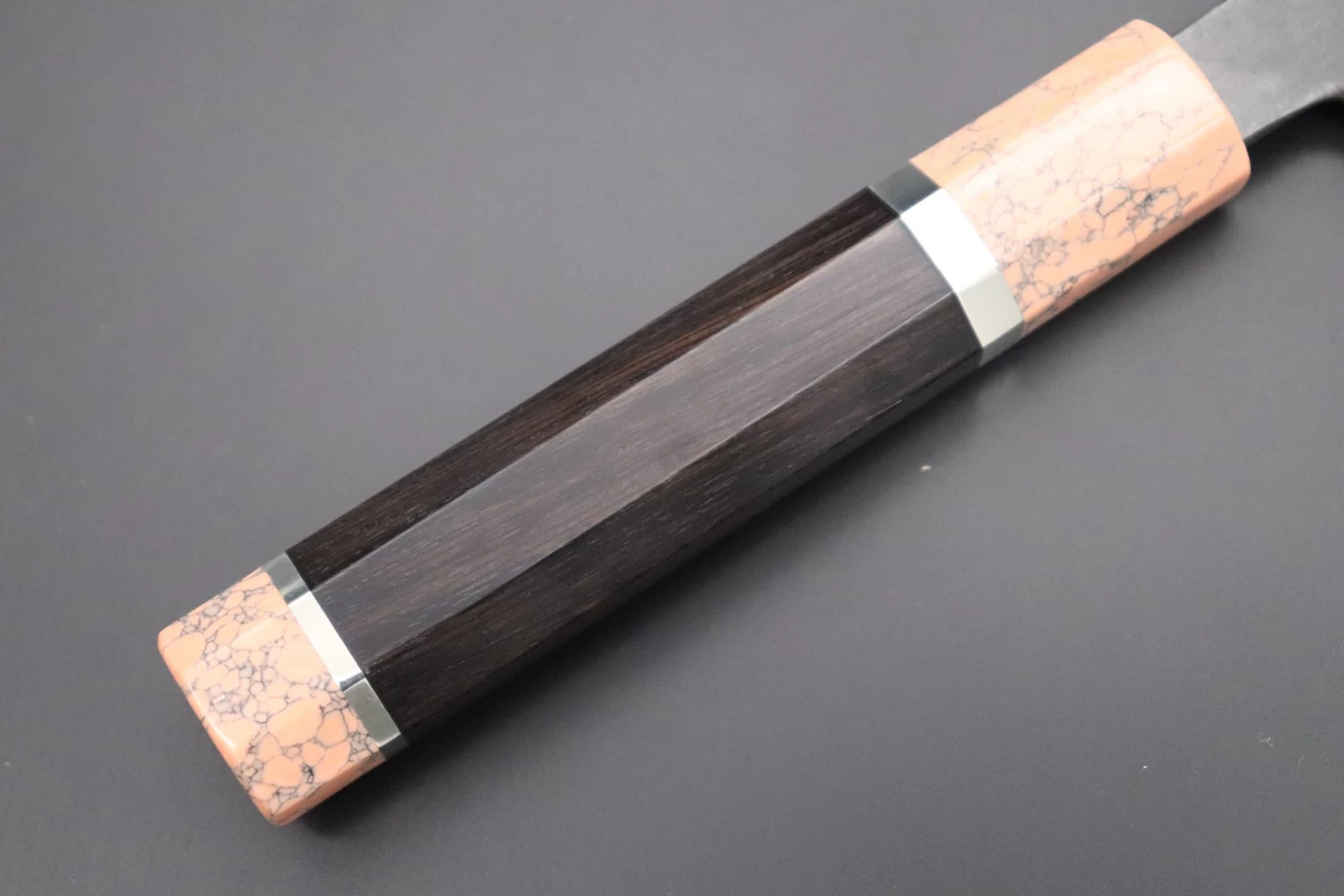 This is the Custom Limited Edition Special Knife Collection. Beautifully polished and finished, Hinoura’s natural gradation color and taste of the modern & traditional Kurouchi Wa Santoku Knife is fitted with a Innovative Octagonal Ebonywood handle with a Soft Pink Turquoise Composite Stone Ferrule & Butt with Nickel Silver Spacers. Please feel the harmony of the traditional historical art and modern, high-sense design, quality.