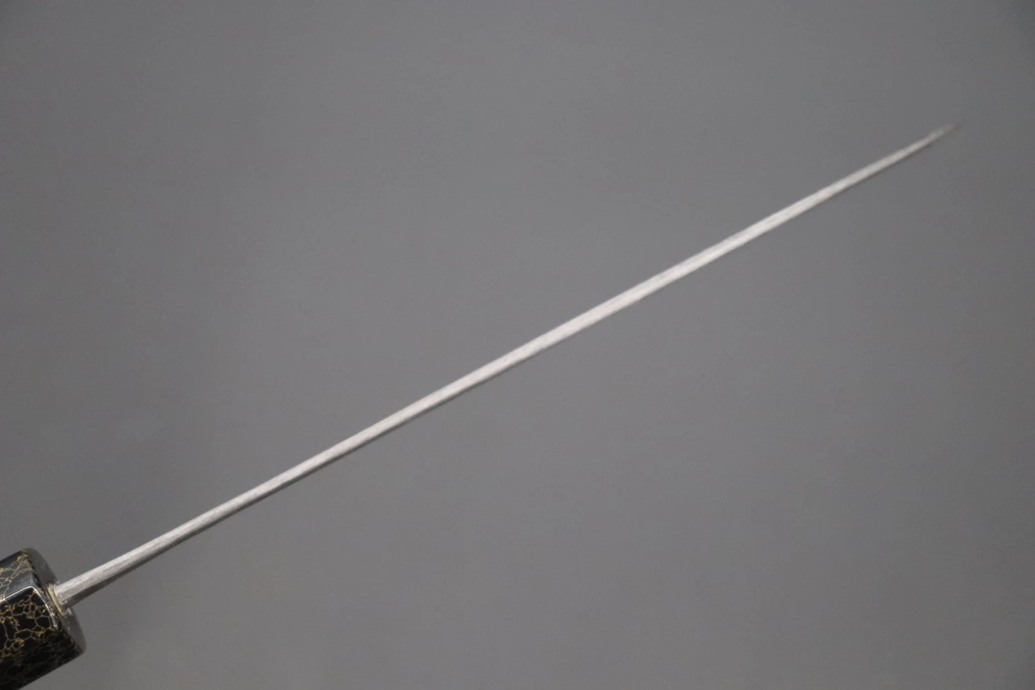 More Information: Unlike many traditionally forged knives, Master Hinoura’s knives have a relatively thick spine at the point where the tang enters the handle (The ‘neck’). In part, this because he forges these laminated knives using a piece of high carbon steel that is much thicker than that commonly used by other forge-smiths. The thick spine and neck makes the knife very strong, very comfortable to hold in a ‘pinch-grip’ and also results in excellent blade balance.
