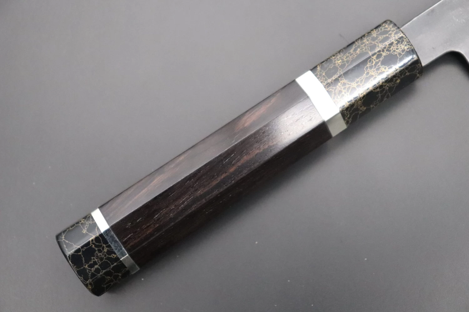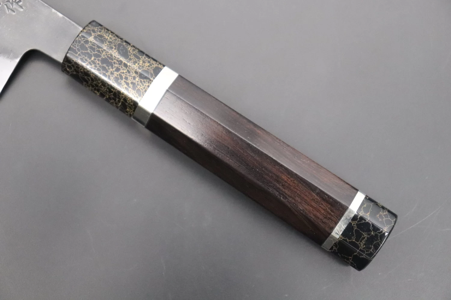 Although some people consider Master Honoura’s knives to be thick and heavy, their geometry is the result of carefully considering every aspect of their function. Contrary to what you might expect, the process of forging a thick blade ‘to shape’ actually requires a lot of time and skill. Master Honoura’s knives are nicely tapered from their heel to the tip and from their spine down to the cutting edge, which is ground very thin behind the edge. We are confident that these knives will provide the high cutting performance that is demanded by Carbon steel lovers!