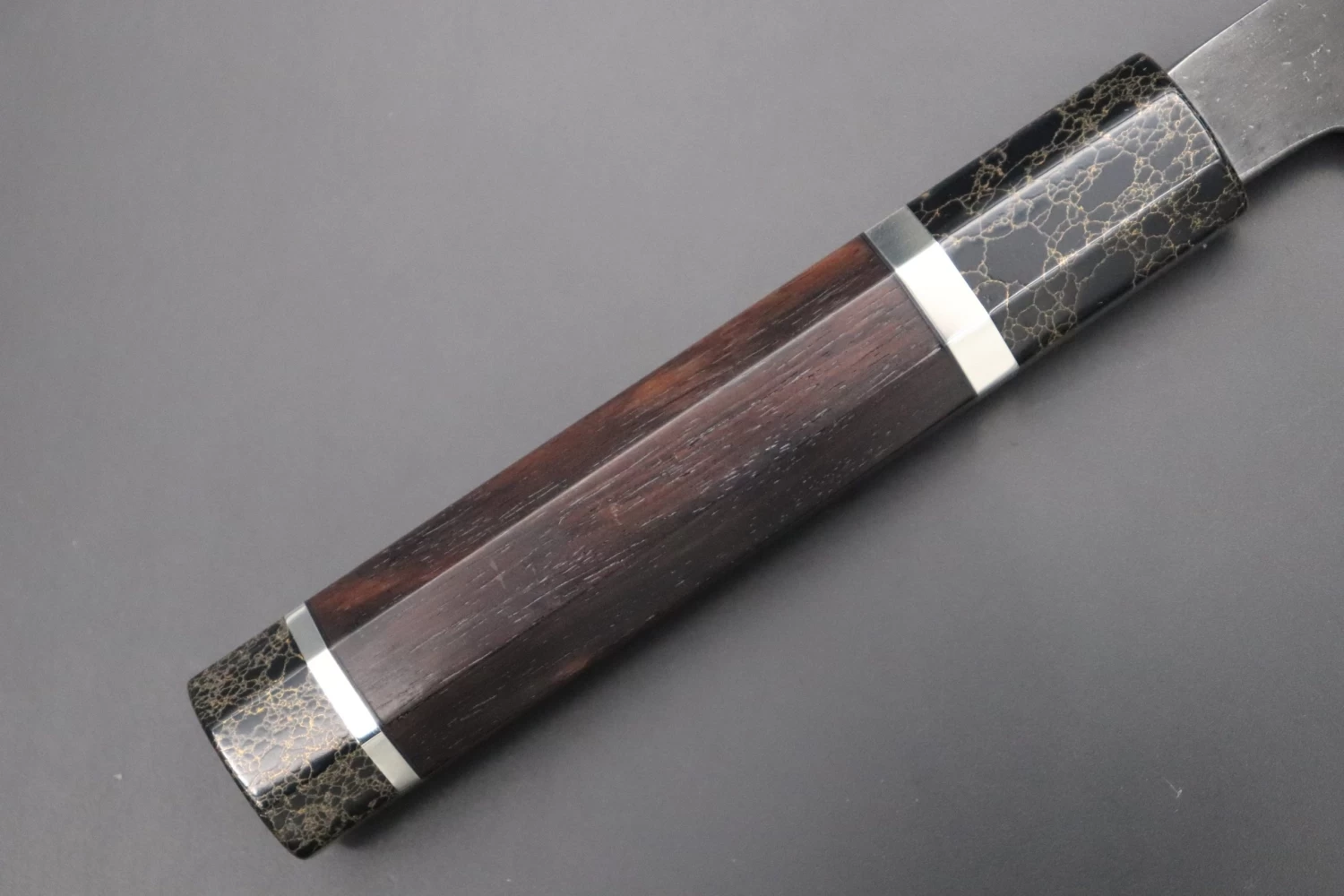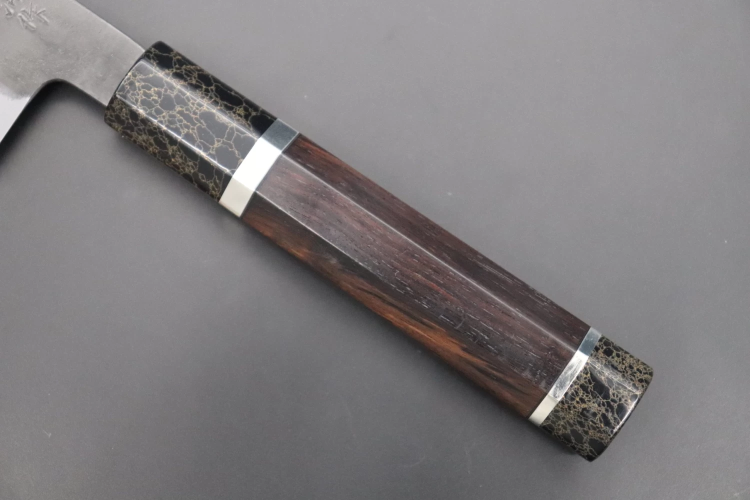 We requested that Hinoura uses White Steel No.1 for the core blade steel. It is sandwiched with outer layers of soft stainless steel. The laminated construction means that only the high-carbon steel blade core is likely to discolor or rust, since the outer layers of soft stainless steel are corrosion-resistant and easy to maintain. The layers of soft stainless steel also improve the blade’s resistance to impact and bending forces. White Steel No.1 is made by further refining White Steel No.2 and adding more Carbon. The extra Carbon allows it to achieve a slightly higher HRc. than White Steel No.2. It can be sharpened to an exceedingly fine edge, has very good edge retention and is easy to re-sharpen.
