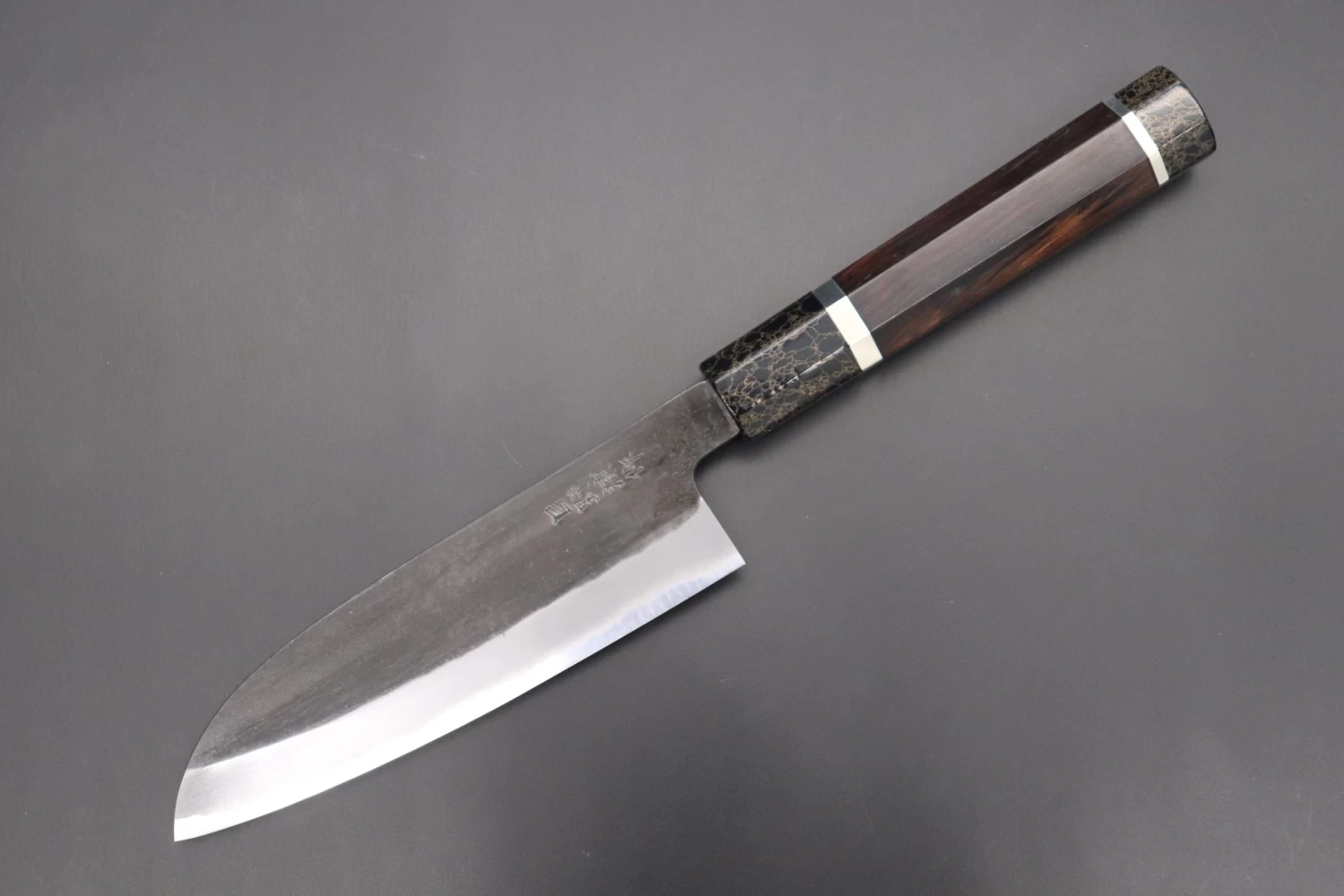 This is the Custom Limited Edition Special Knife Collection. Beautifully polished and finished, Hinoura’s natural gradation color and taste of the modern & traditional Kurouchi Wa Santoku Knife is fitted with a Innovative Octagonal Ebonywood handle with a Black-Golden- Color Turquoise Composite Stone Ferrule & Butt with Nickel Silver Spacers. Please feel the harmony of the traditional historical art and modern, high-sense design, quality.