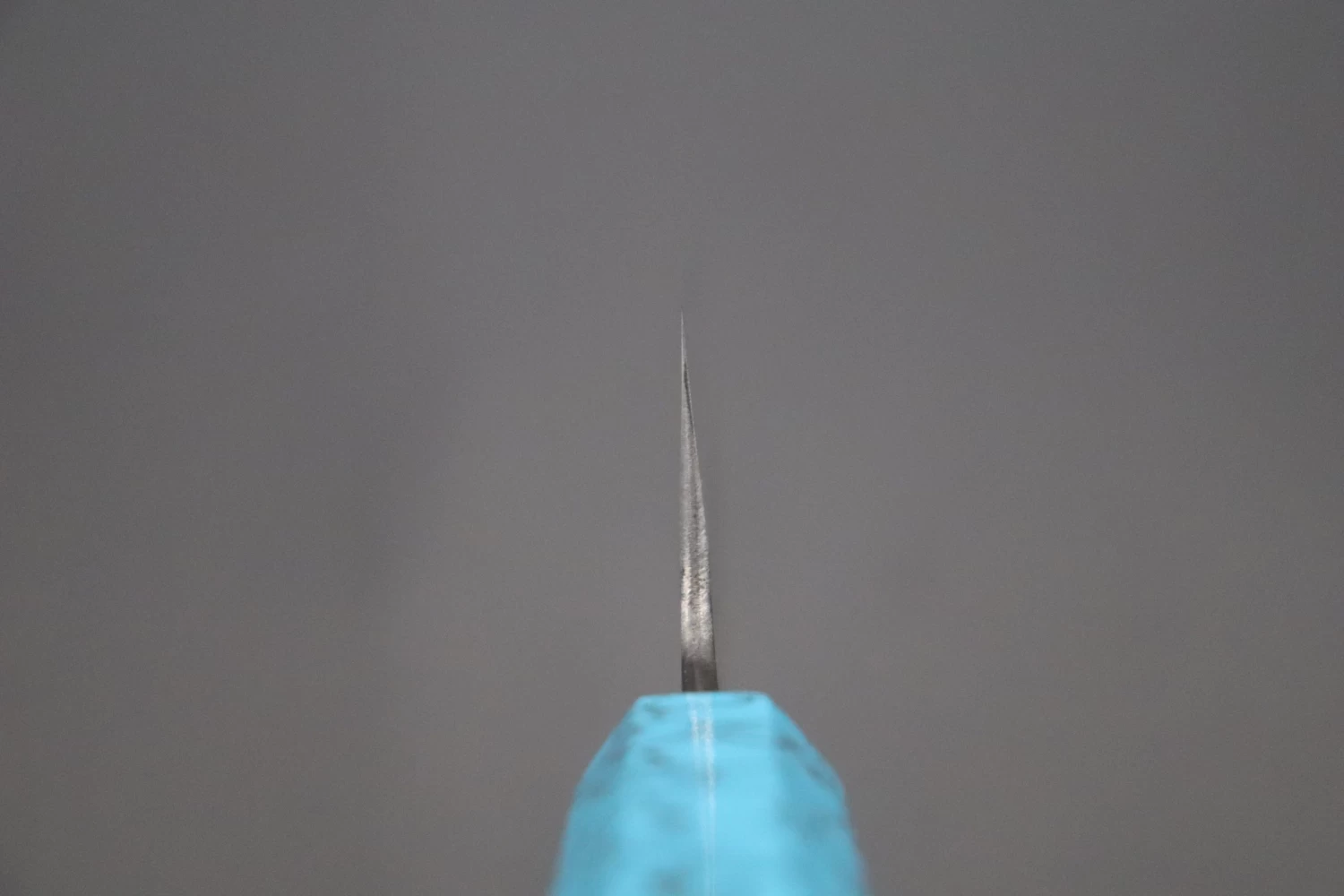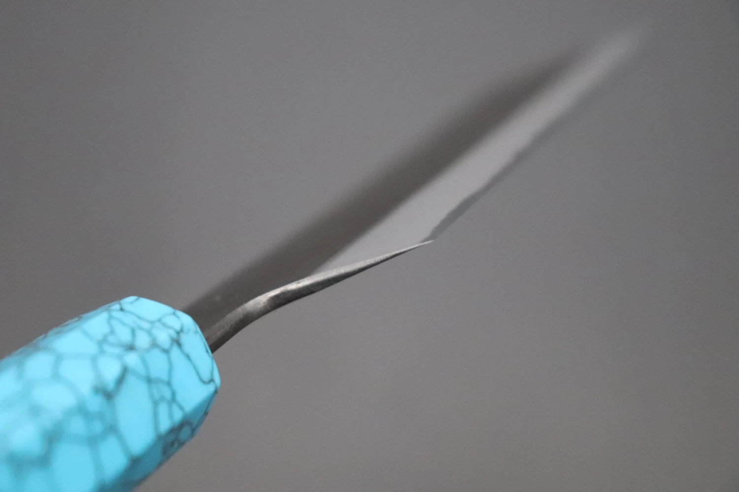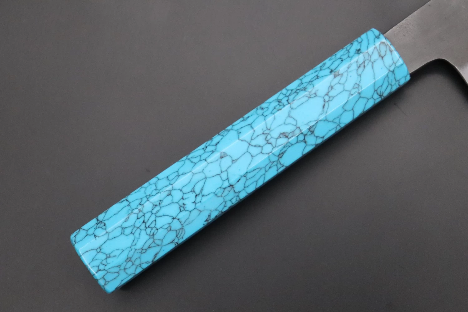 This is the Custom Limited Edition Special Knife Collection. Beautifully polished and finished, Hinoura’s natural gradation color and taste of the modern & traditional Kurouchi Nakiri Knife is fitted a with a Innovative Octagonal Turquoise Composite Stone Handle. Please feel the harmony of the traditional historical art and modern, high-sense design, quality.
