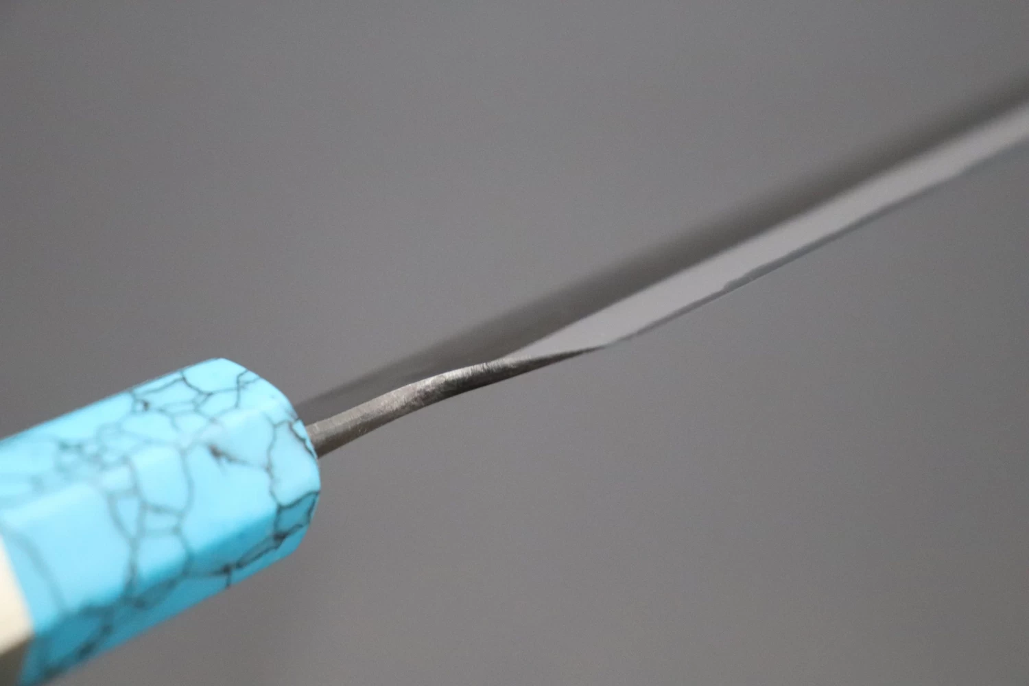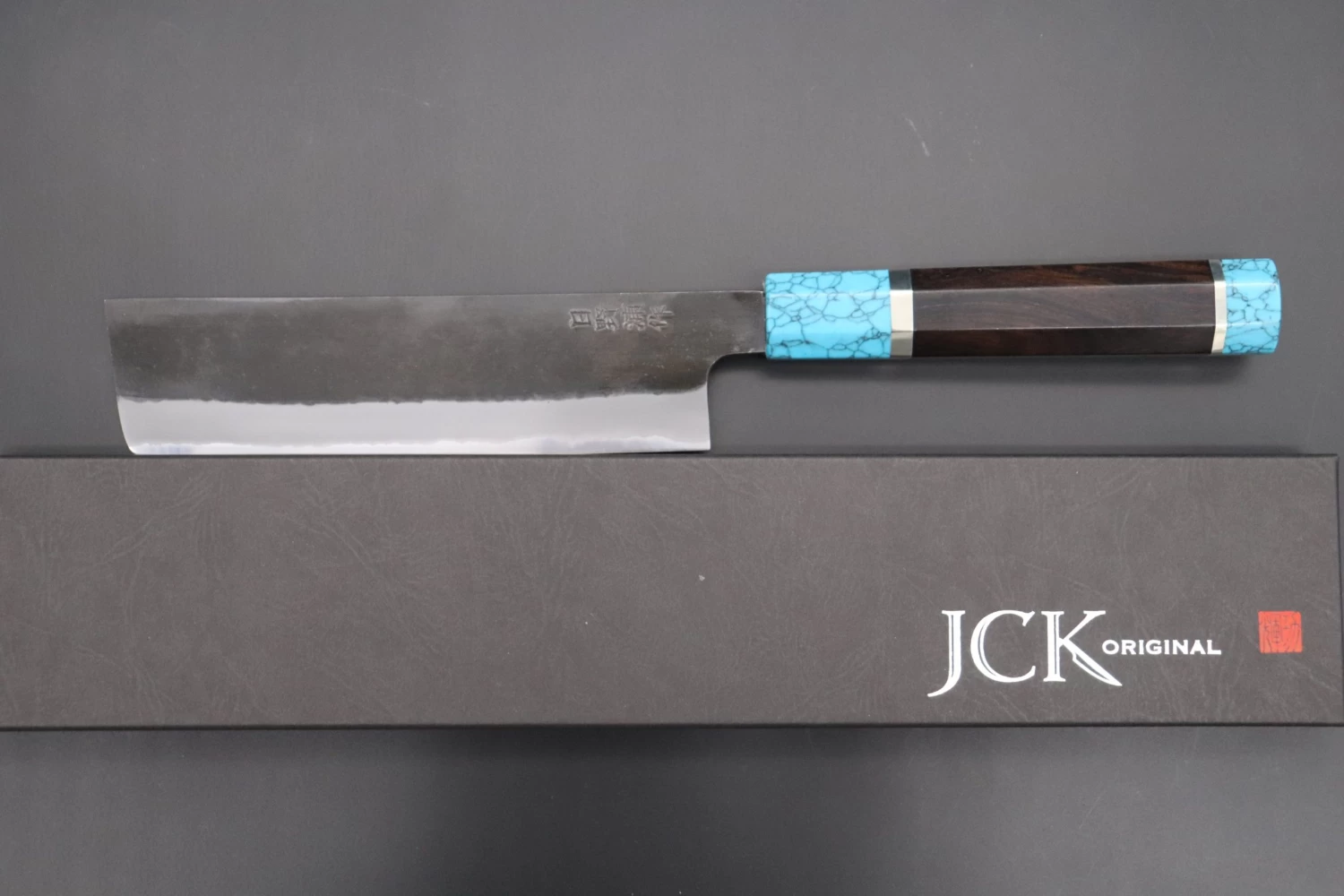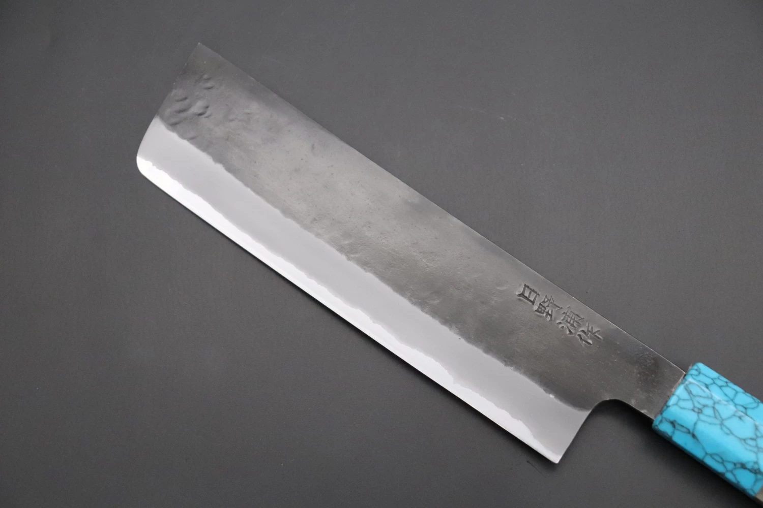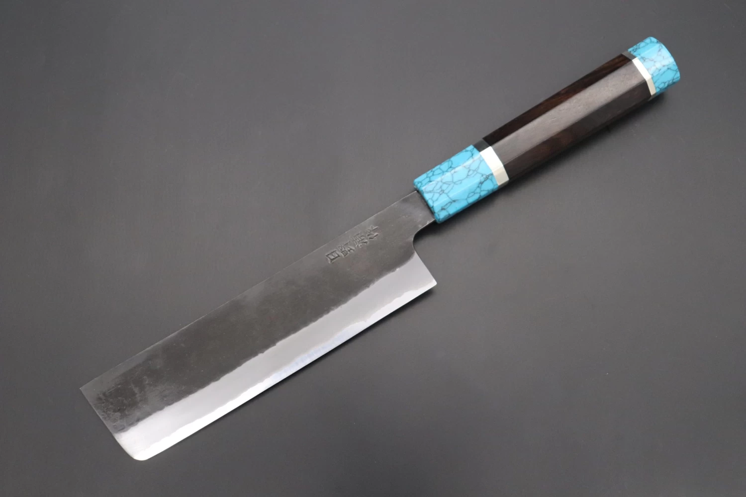 This is the Custom Limited Edition Special Knife Collection. Beautifully polished and finished, Hinoura’s natural gradation color and taste of the modern & traditional Kurouchi Nakiri Knife is fitted a with a Innovative Octagonal Ebonywood Handle with Nickel Silver Spacers and a Turquoise Composite Stone Ferrule & Butt. Please feel the harmony of the traditional historical art and modern, high-sense design, quality.