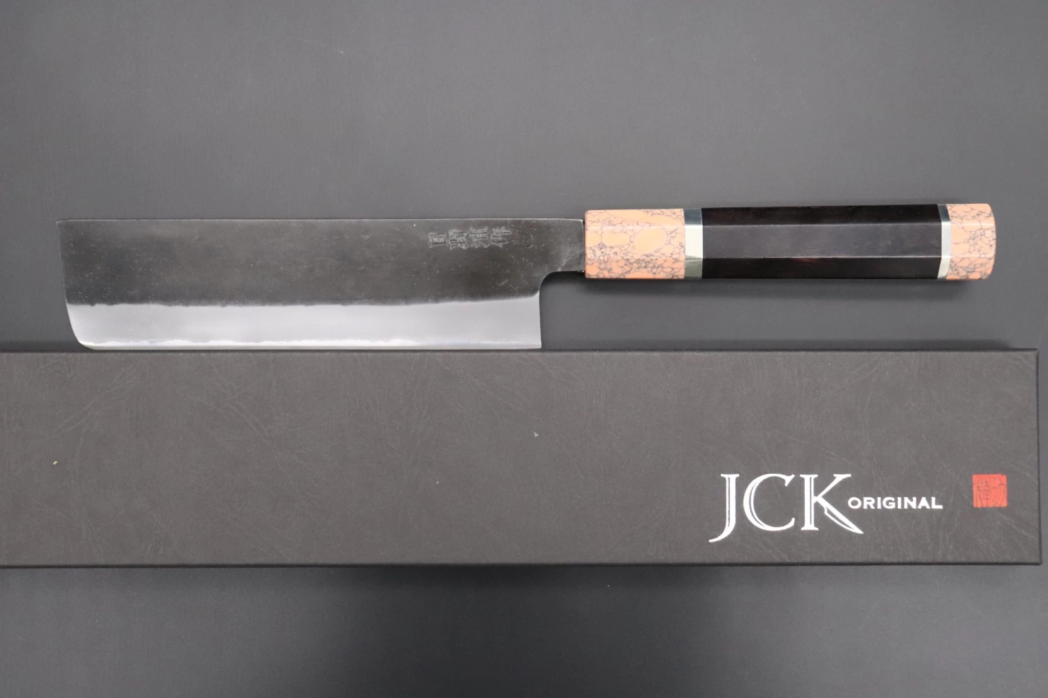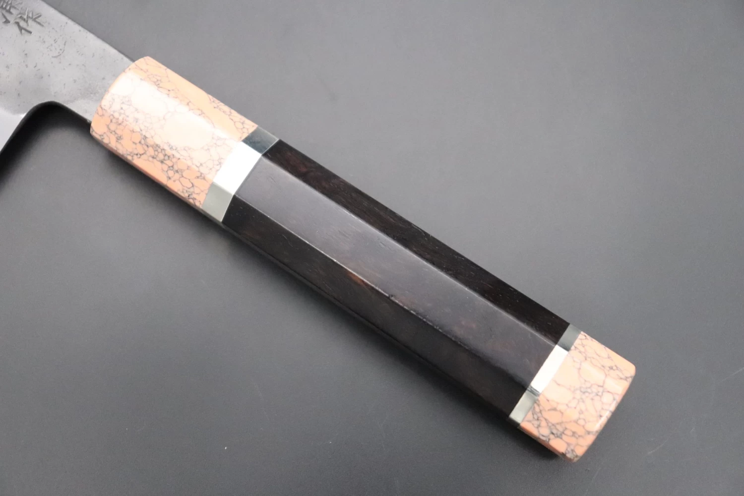 This is the Custom Limited Edition Special Knife Collection. Beautifully polished and finished, Hinoura’s natural gradation color and taste of the modern & traditional Kurouchi Nakiri Knife is fitted a with a Innovative Octagonal Ebonywood Handle with Nickel Silver Spacers and a Soft Pink Turquoise Composite Stone Ferrule & Butt. Please feel the harmony of the traditional historical art and modern, high-sense design, quality.