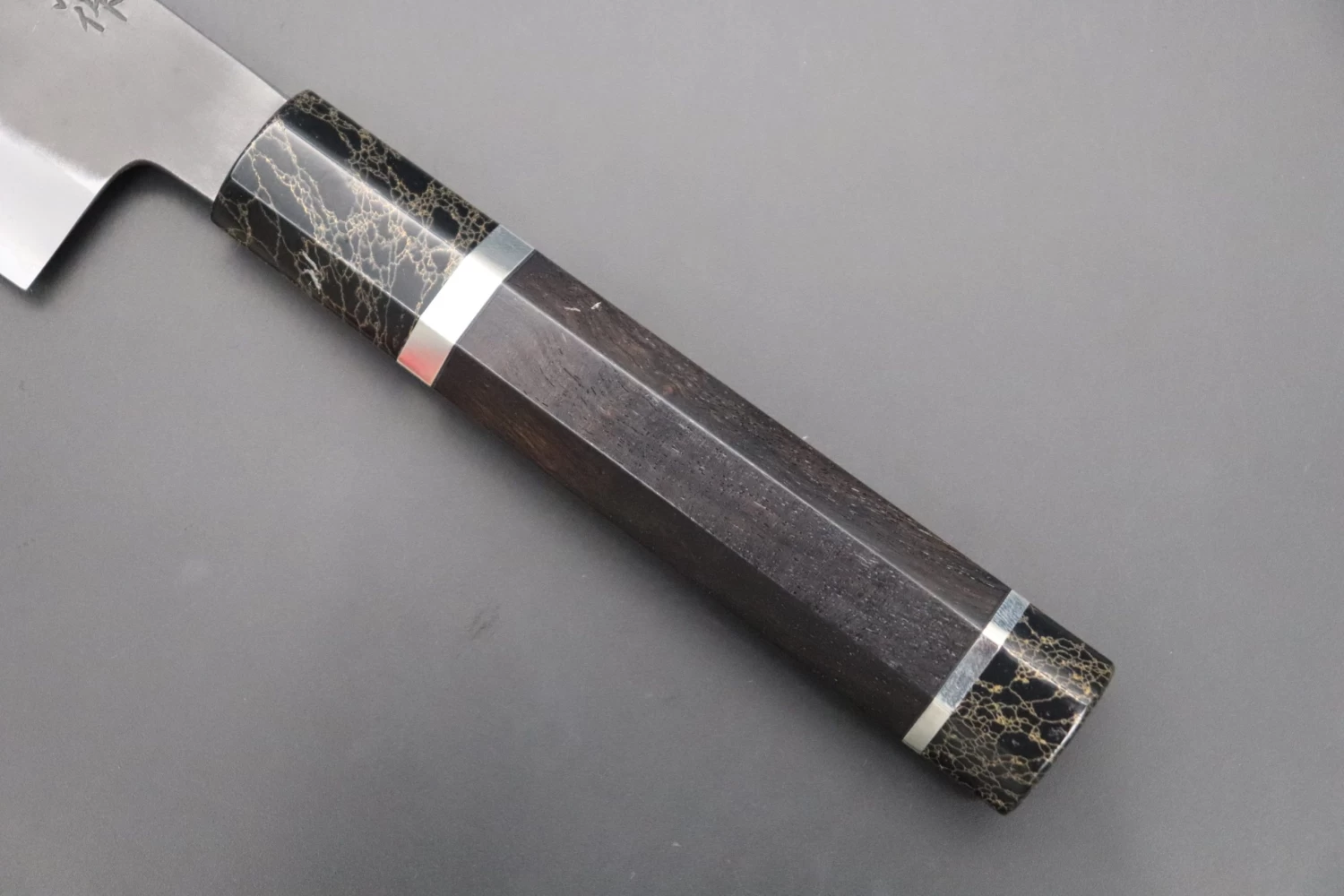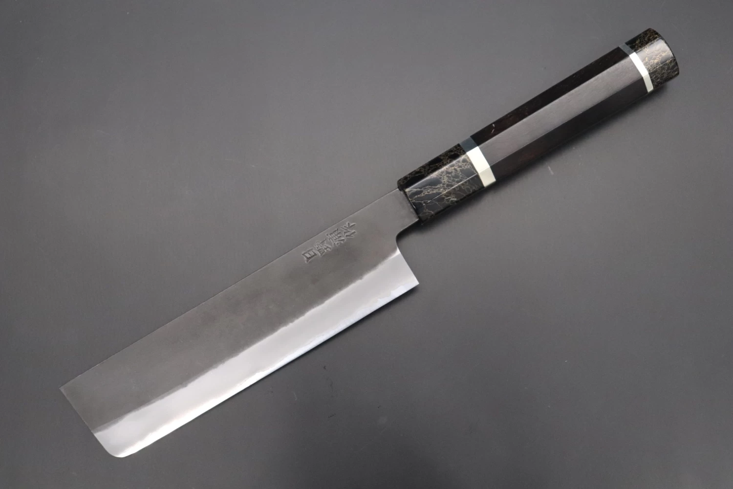 This is the Custom Limited Edition Special Knife Collection. Beautifully polished and finished, Hinoura’s natural gradation color and taste of the modern & traditional Kurouchi Nakiri Knife is fitted a with a Innovative Octagonal Ebonywood Handle with Nickel Silver Spacers and a Black-Golden- Color Turquoise Composite Stone Ferrule & Butt. Please feel the harmony of the traditional historical art and modern, high-sense design, quality.
