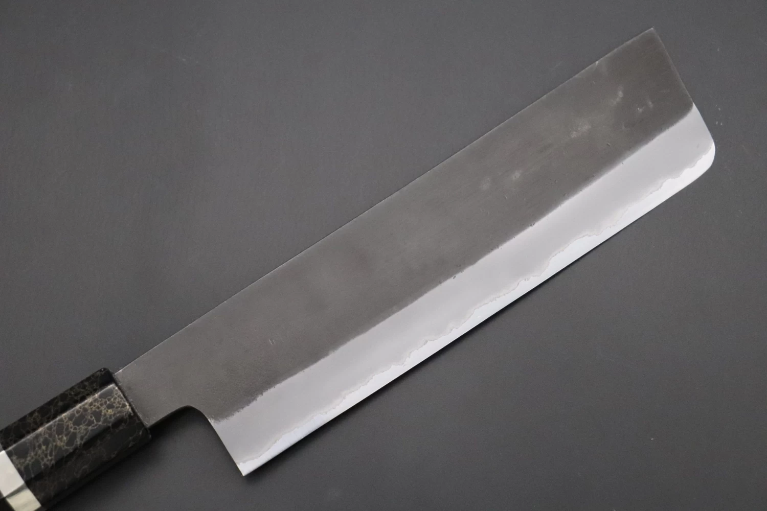 Although some people consider Master Honoura’s knives to be thick and heavy, their geometry is the result of carefully considering every aspect of their function. Contrary to what you might expect, the process of forging a thick blade ‘to shape’ actually requires a lot of time and skill. Master Honoura’s knives are nicely tapered from their heel to the tip and from their spine down to the cutting edge, which is ground very thin behind the edge. We are confident that these knives will provide the high cutting performance that is demanded by Carbon steel lovers!
