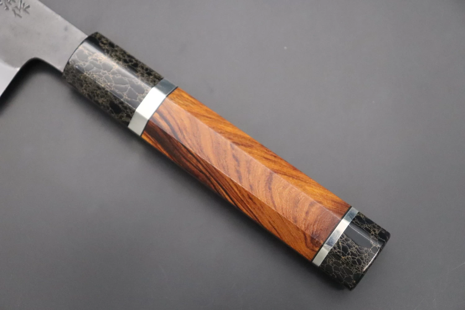 This is the Custom Limited Edition Special Knife Collection. Beautifully polished and finished, Hinoura’s natural gradation color and taste of the modern & traditional Kurouchi Nakiri Knife is fitted a with a Innovative Octagonal Desert Ironwood Handle with Nickel Silver Spacers and a Black-Golden- Color Turquoise Composite Stone Ferrule & Butt. Please feel the harmony of the traditional historical art and modern, high-sense design, quality.