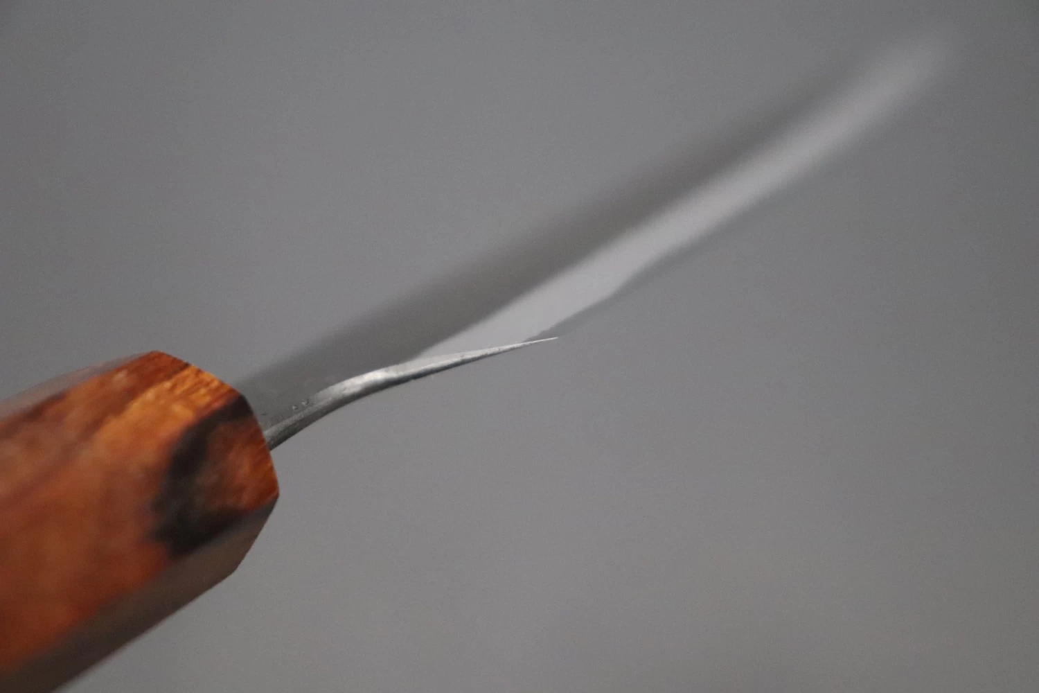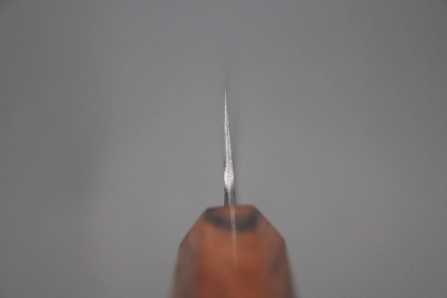 Although some people consider Master Honoura’s knives to be thick and heavy, their geometry is the result of carefully considering every aspect of their function. Contrary to what you might expect, the process of forging a thick blade ‘to shape’ actually requires a lot of time and skill. Master Honoura’s knives are nicely tapered from their heel to the tip and from their spine down to the cutting edge, which is ground very thin behind the edge. We are confident that these knives will provide the high cutting performance that is demanded by Carbon steel lovers!