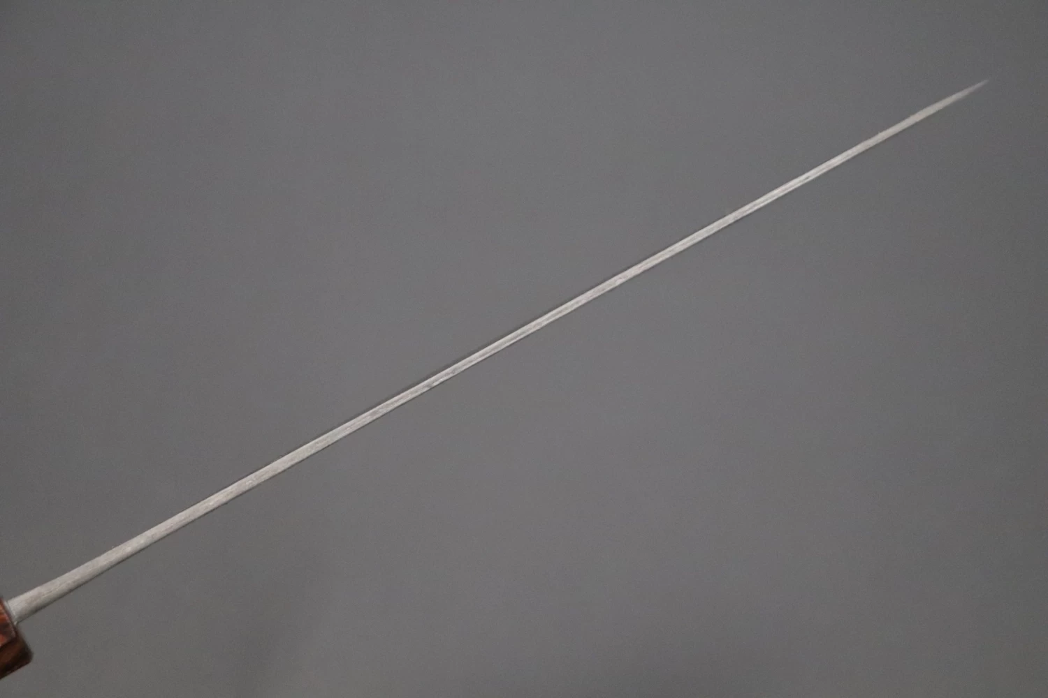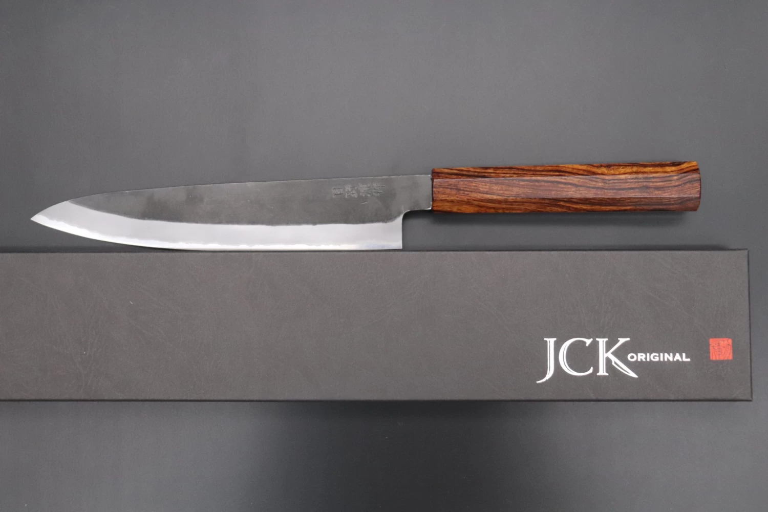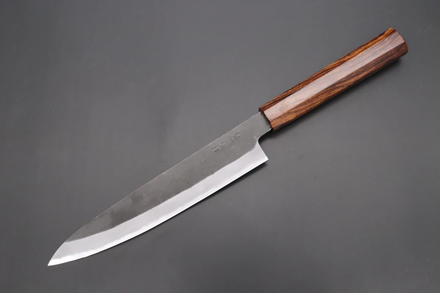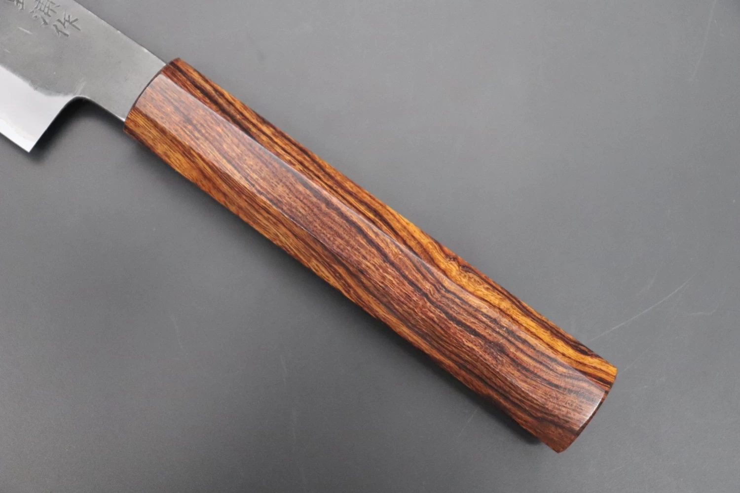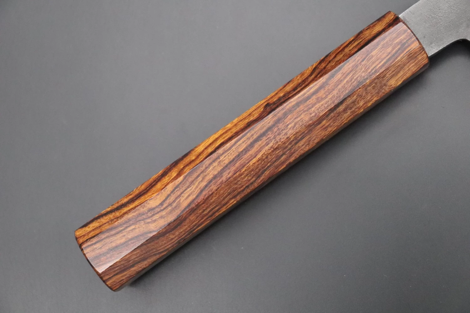 This is the Custom Limited Edition Special Knife Collection. Beautifully polished and finished, Hinoura’s natural gradation color and taste of the modern & traditional Kurouchi Wa Gyuto Knife is fitted a with a Innovative Octagonal Desert Ironwood Handle. Please feel the harmony of the traditional historical art and modern, high-sense design, quality.