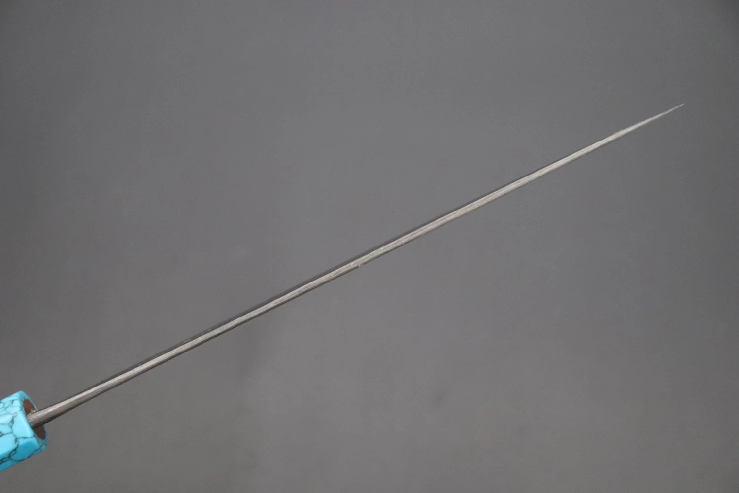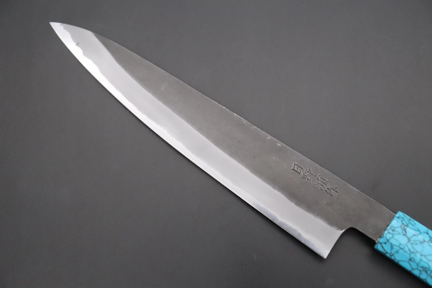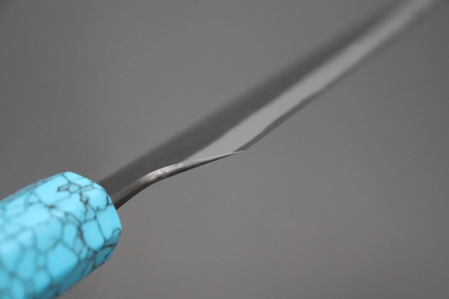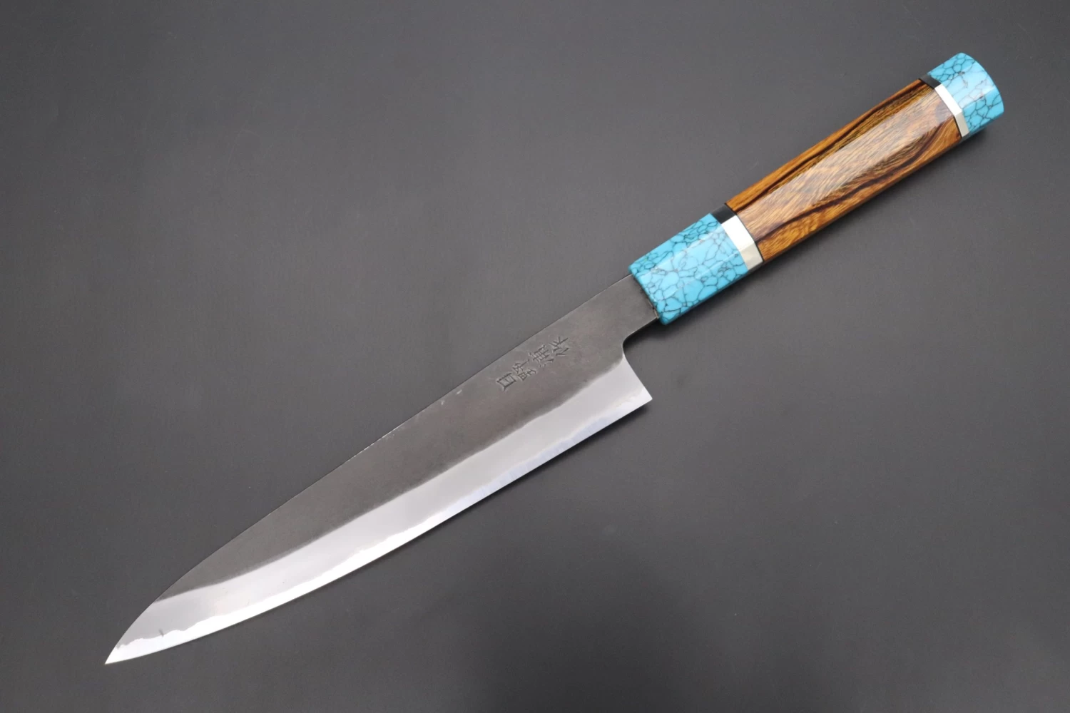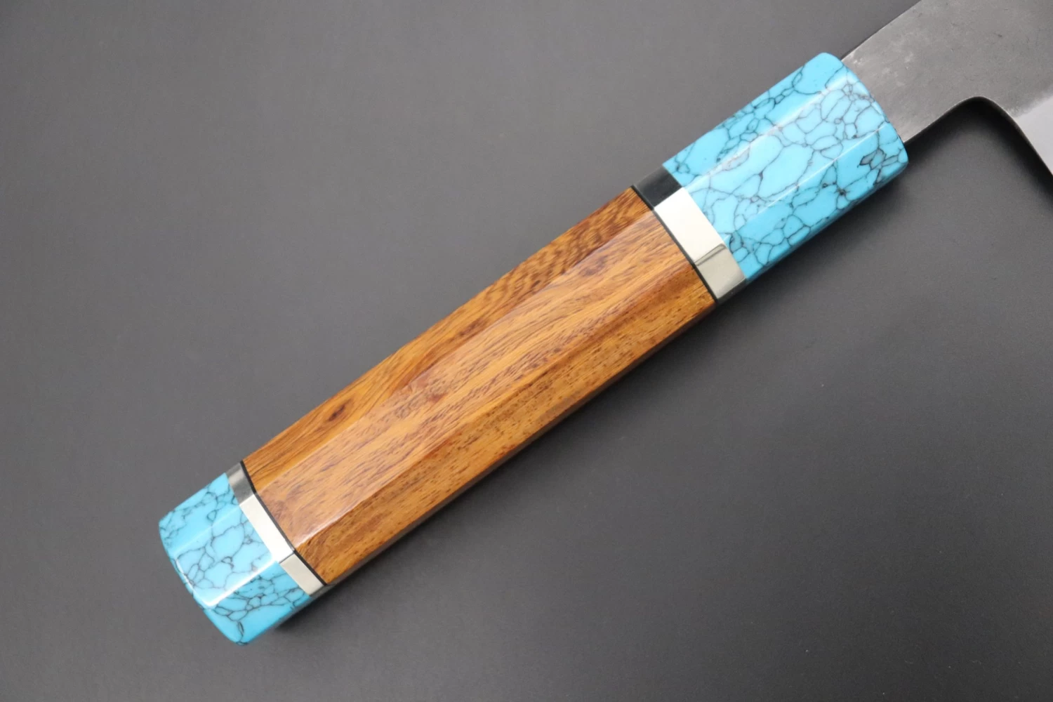This is the Custom Limited Edition Special Knife Collection. Beautifully polished and finished, Hinoura’s natural gradation color and taste of the modern & traditional Kurouchi Wa Gyuto Knife is fitted a with a Innovative Octagonal Desert Ironwood Handle with Nickel Silver Spacers and a Turquoise Composite Stone Ferrule & Butt. Please feel the harmony of the traditional historical art and modern, high-sense design, quality.