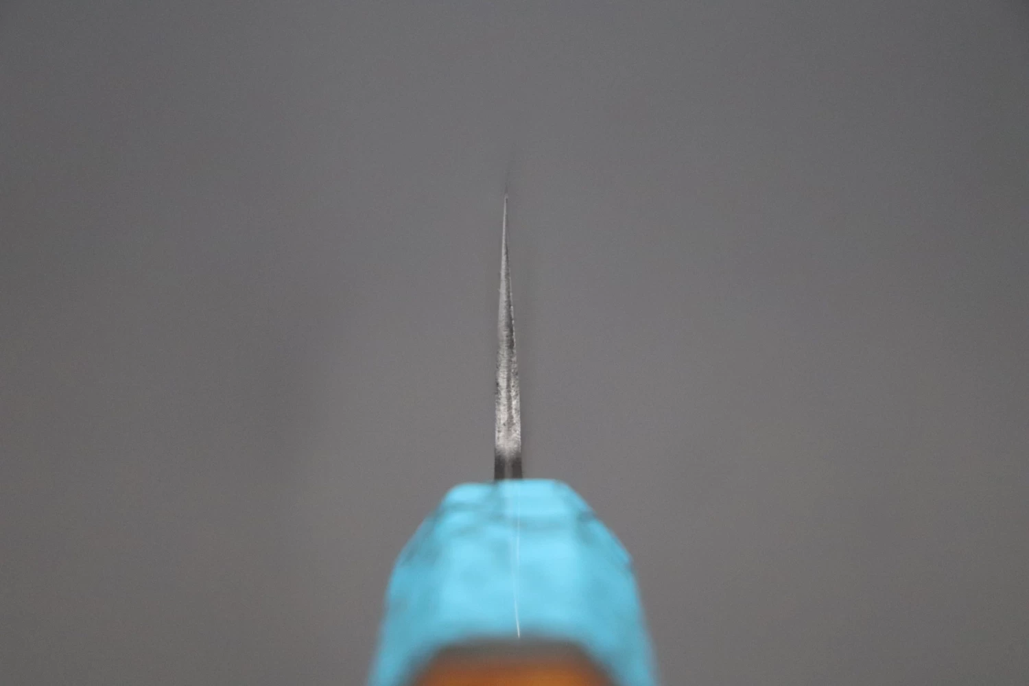 Although some people consider Master Honoura’s knives to be thick and heavy, their geometry is the result of carefully considering every aspect of their function. Contrary to what you might expect, the process of forging a thick blade ‘to shape’ actually requires a lot of time and skill. Master Honoura’s knives are nicely tapered from their heel to the tip and from their spine down to the cutting edge, which is ground very thin behind the edge. We are confident that these knives will provide the high cutting performance that is demanded by Carbon steel lovers!