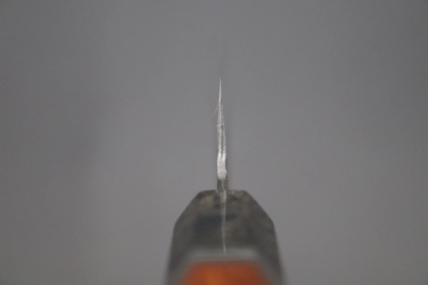 We requested that Hinoura uses White Steel No.1 for the core blade steel. It is sandwiched with outer layers of soft stainless steel. The laminated construction means that only the high-carbon steel blade core is likely to discolor or rust, since the outer layers of soft stainless steel are corrosion-resistant and easy to maintain. The layers of soft stainless steel also improve the blade’s resistance to impact and bending forces. White Steel No.1 is made by further refining White Steel No.2 and adding more Carbon. The extra Carbon allows it to achieve a slightly higher HRc. than White Steel No.2. It can be sharpened to an exceedingly fine edge, has very good edge retention and is easy to re-sharpen.