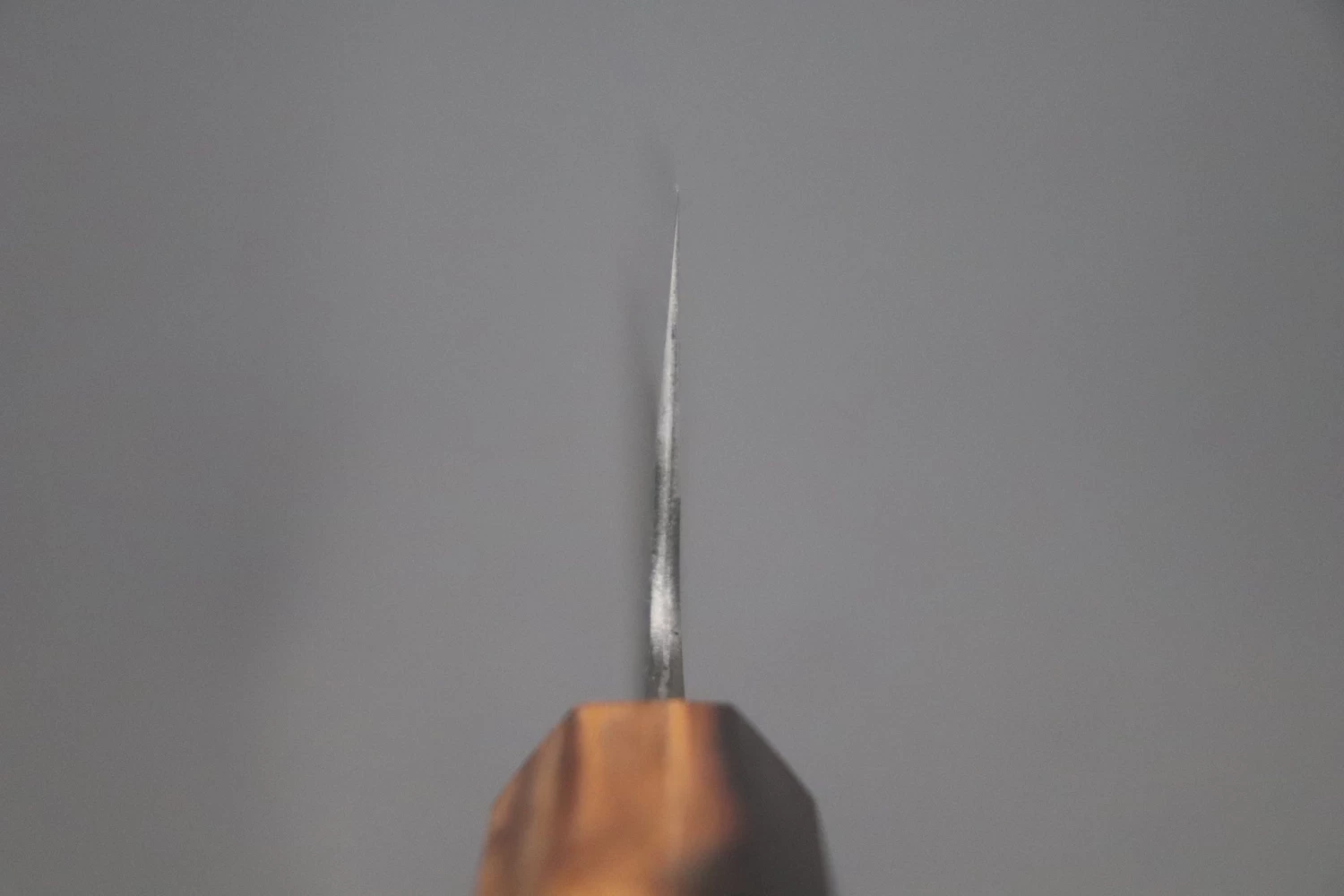 Although some people consider Master Honoura’s knives to be thick and heavy, their geometry is the result of carefully considering every aspect of their function. Contrary to what you might expect, the process of forging a thick blade ‘to shape’ actually requires a lot of time and skill. Master Honoura’s knives are nicely tapered from their heel to the tip and from their spine down to the cutting edge, which is ground very thin behind the edge. We are confident that these knives will provide the high cutting performance that is demanded by Carbon steel lovers!