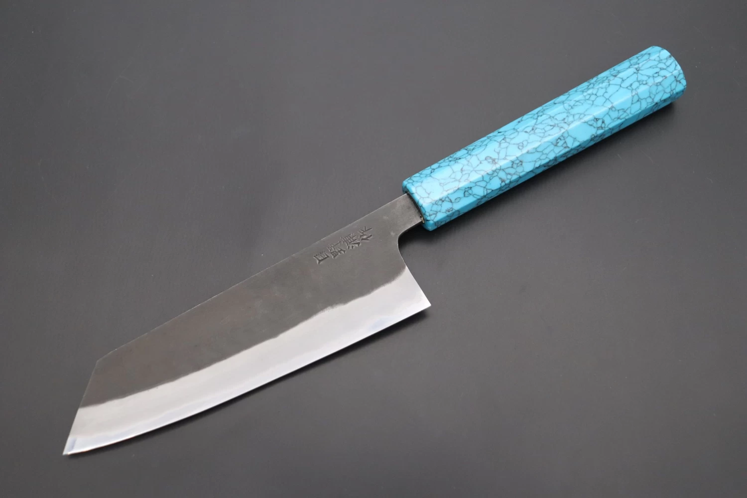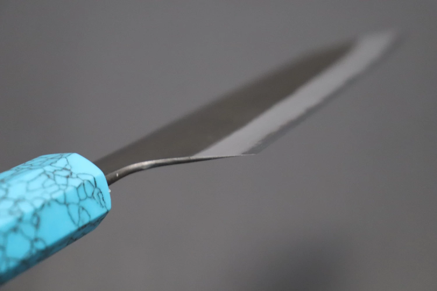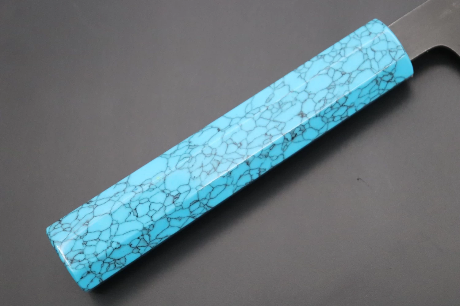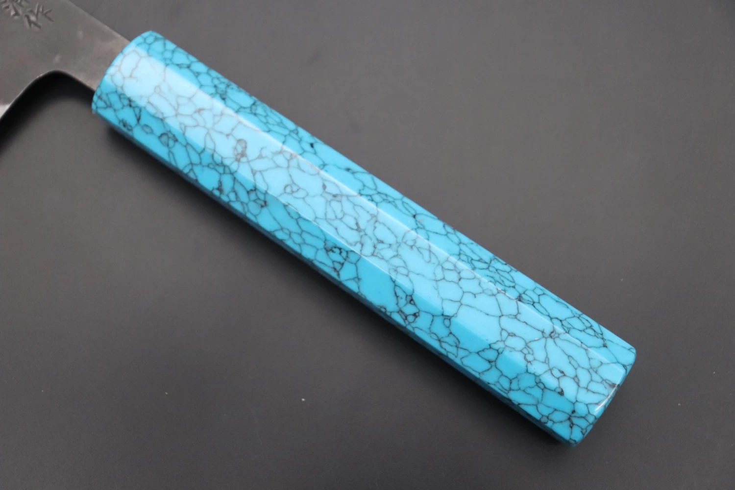 This is the Custom Limited Edition Special Knife Collection. Beautifully polished and finished, Hinoura’s natural gradation color and taste of the modern & traditional Kurouchi Bunka Knife is fitted a with a Innovative Octagonal Turquoise Composite Stone Handle. Please feel the harmony of the traditional historical art and modern, high-sense design, quality.