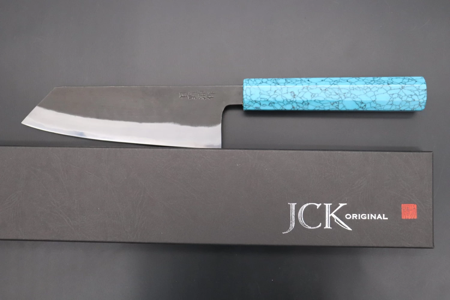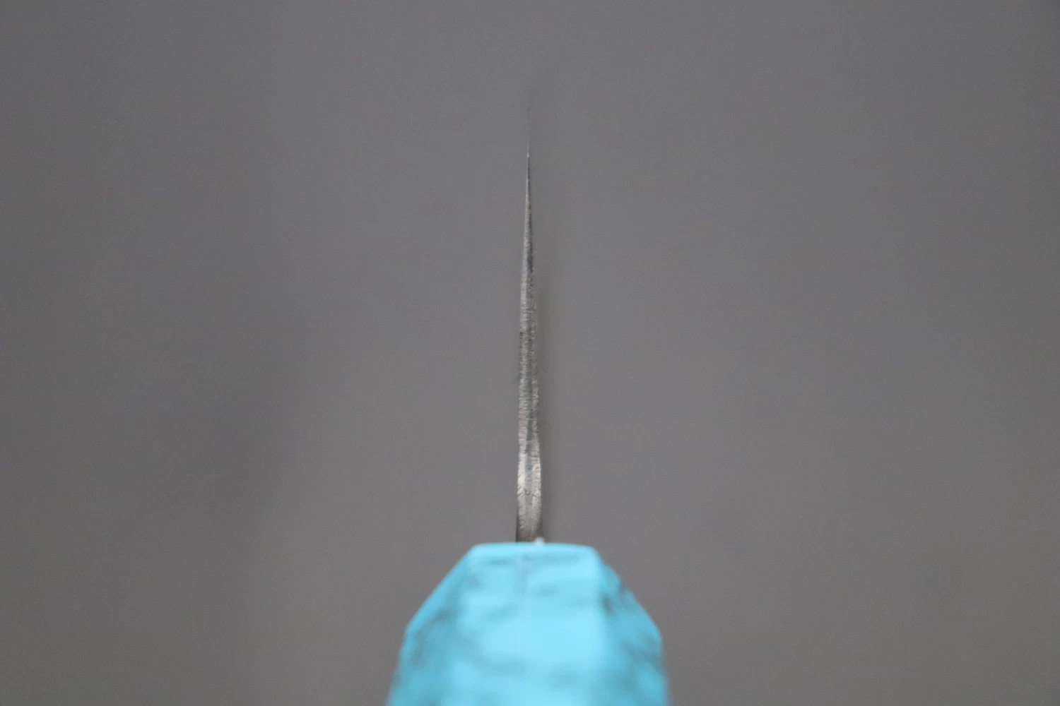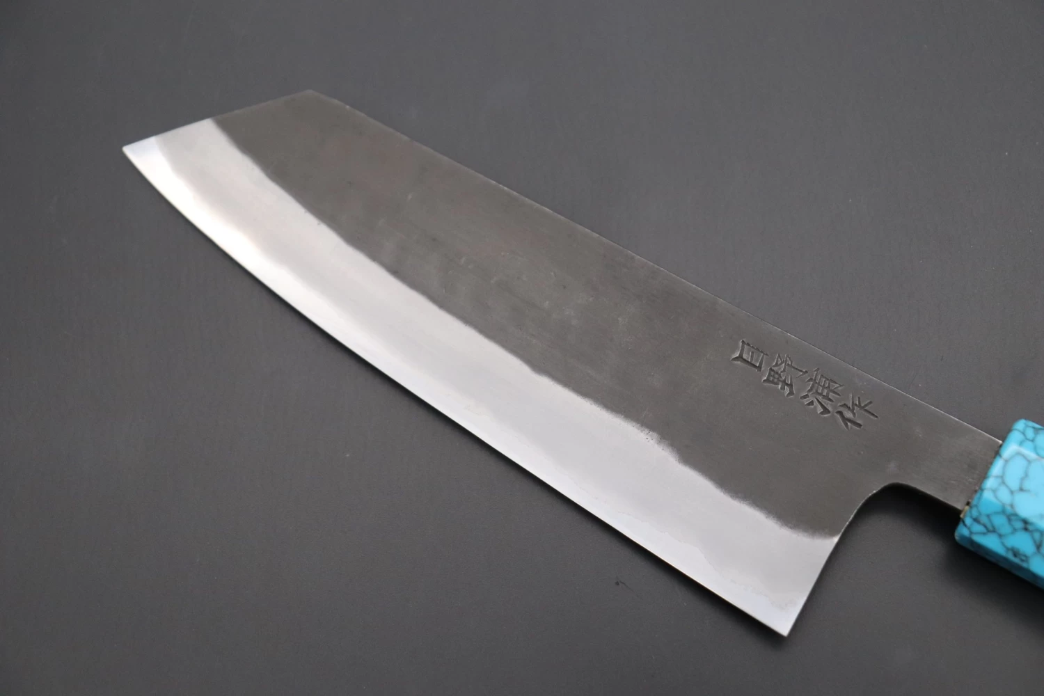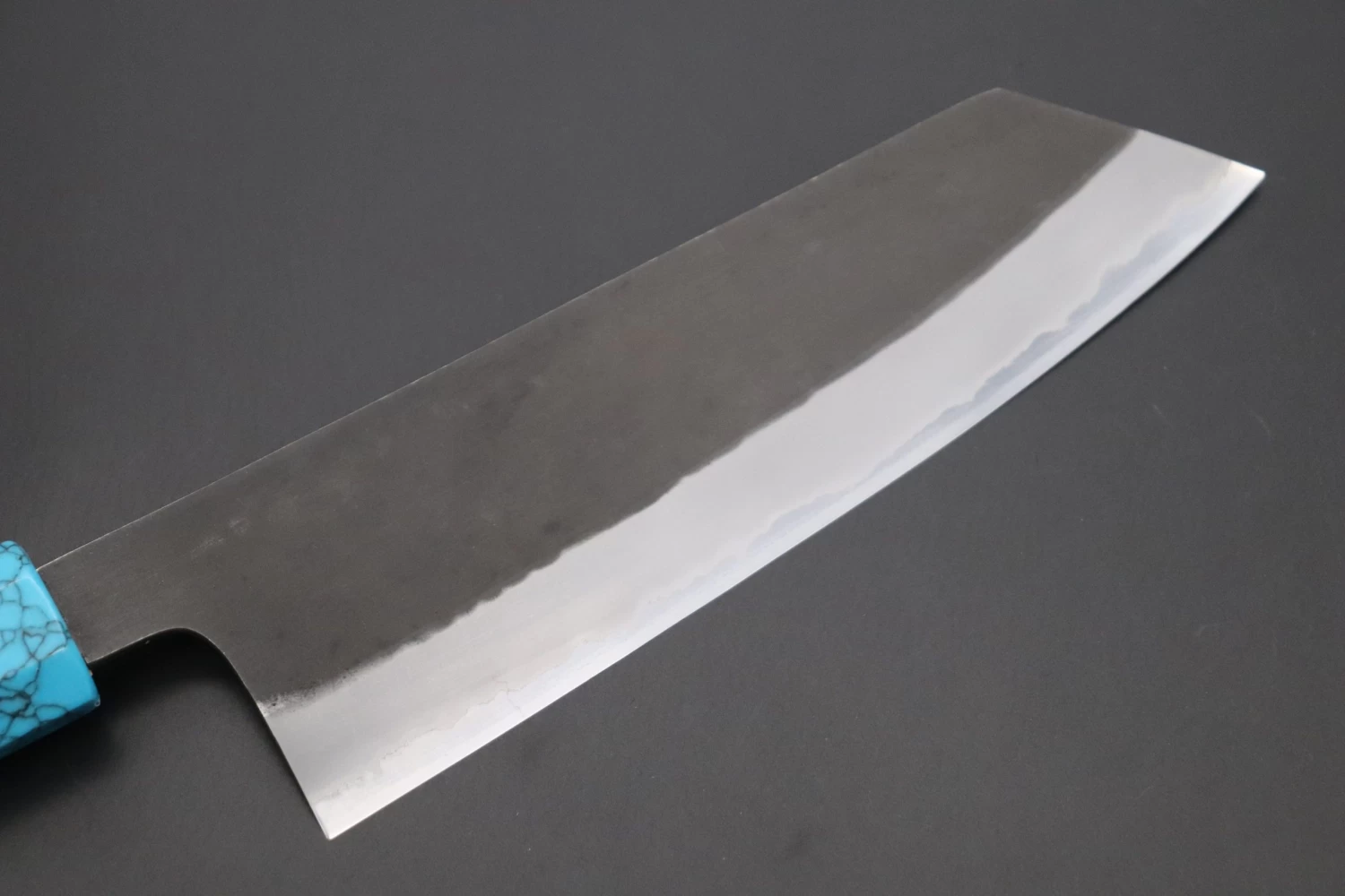 This is the Custom Limited Edition Special Knife Collection. Beautifully polished and finished, Hinoura’s natural gradation color and taste of the modern & traditional Kurouchi Bunka Knife is fitted a with a Innovative Octagonal Turquoise Composite Stone Handle. Please feel the harmony of the traditional historical art and modern, high-sense design, quality.