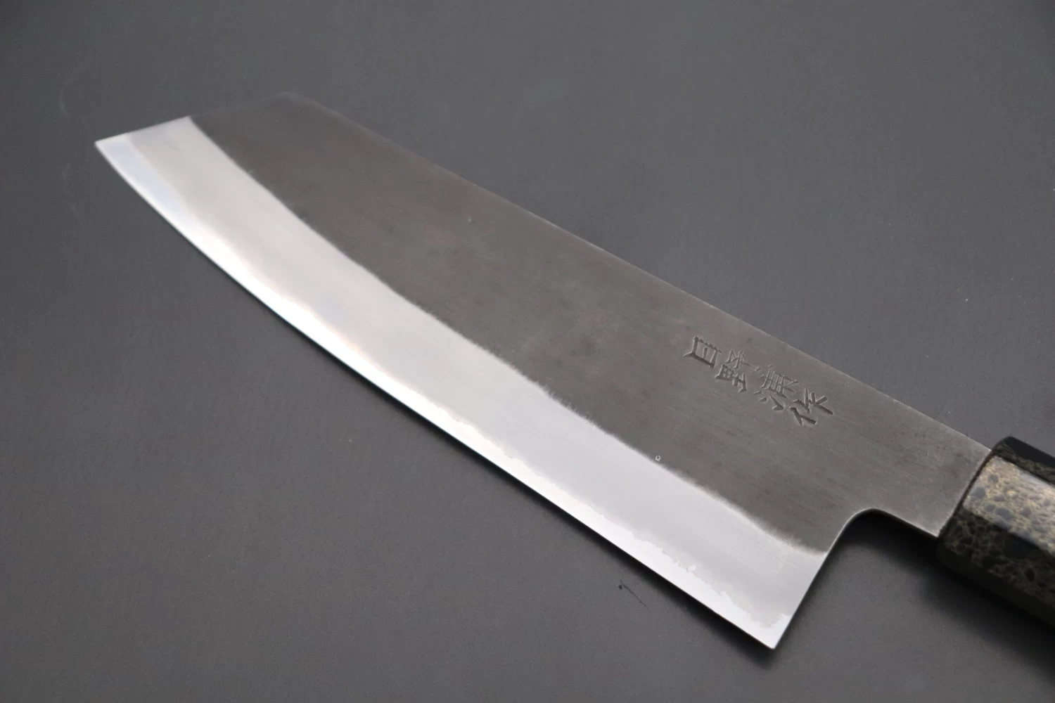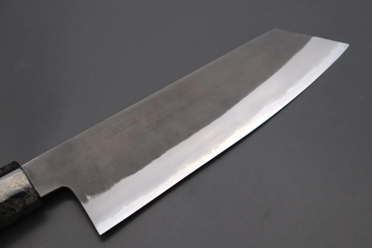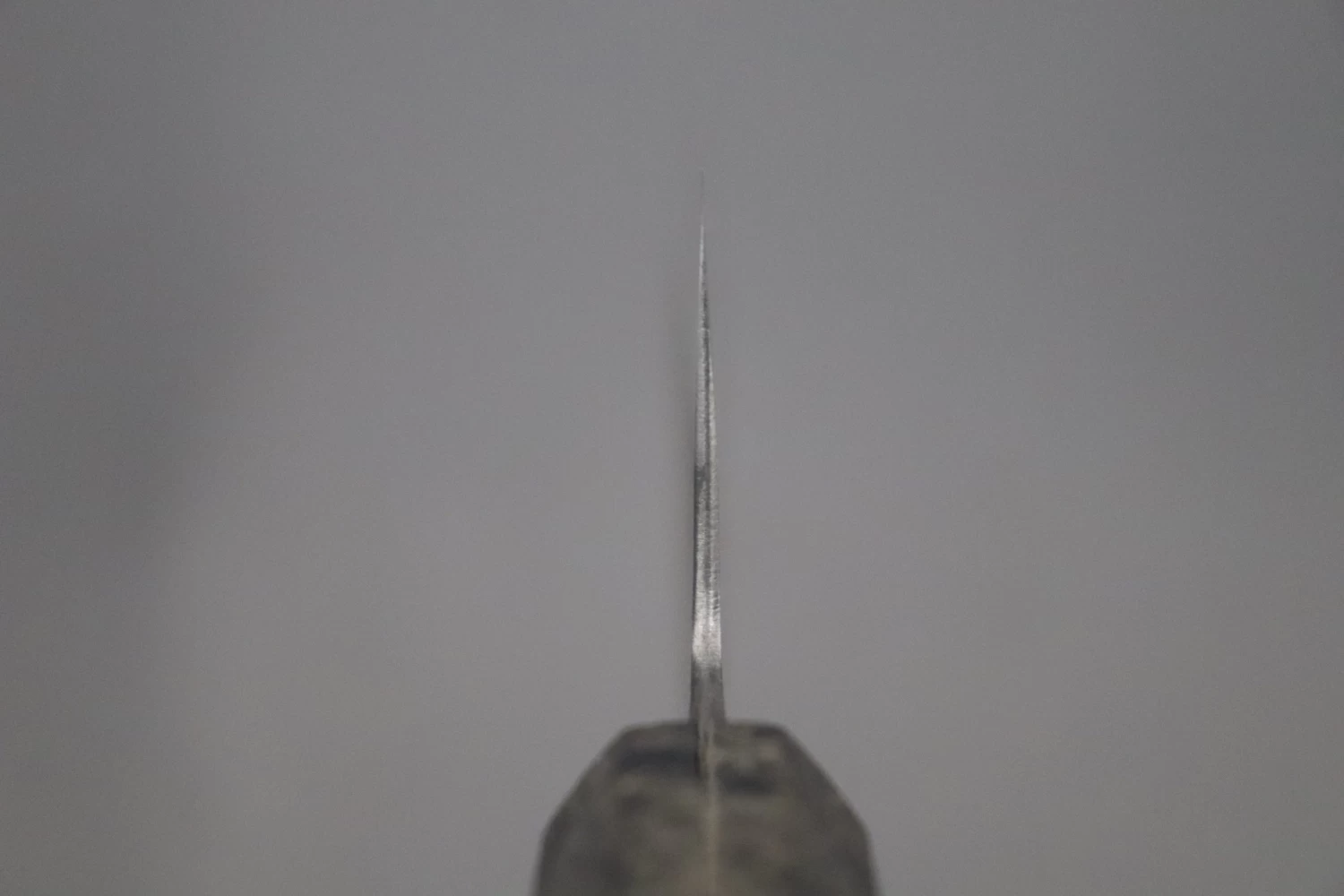Although some people consider Master Honoura’s knives to be thick and heavy, their geometry is the result of carefully considering every aspect of their function. Contrary to what you might expect, the process of forging a thick blade ‘to shape’ actually requires a lot of time and skill. Master Honoura’s knives are nicely tapered from their heel to the tip and from their spine down to the cutting edge, which is ground very thin behind the edge. We are confident that these knives will provide the high cutting performance that is demanded by Carbon steel lovers!