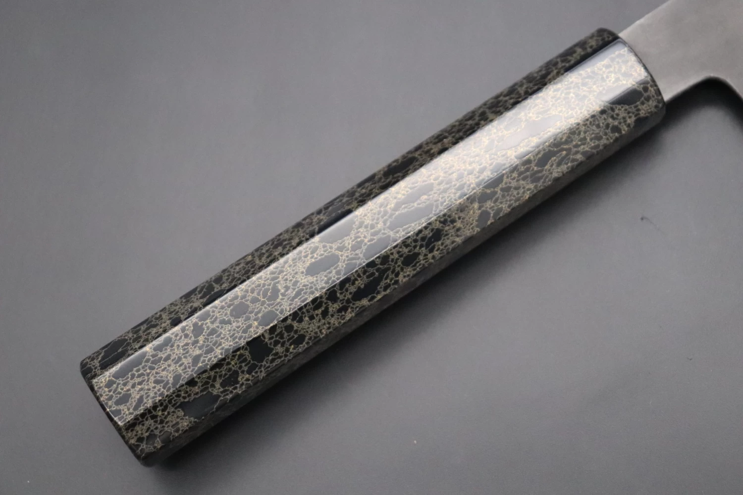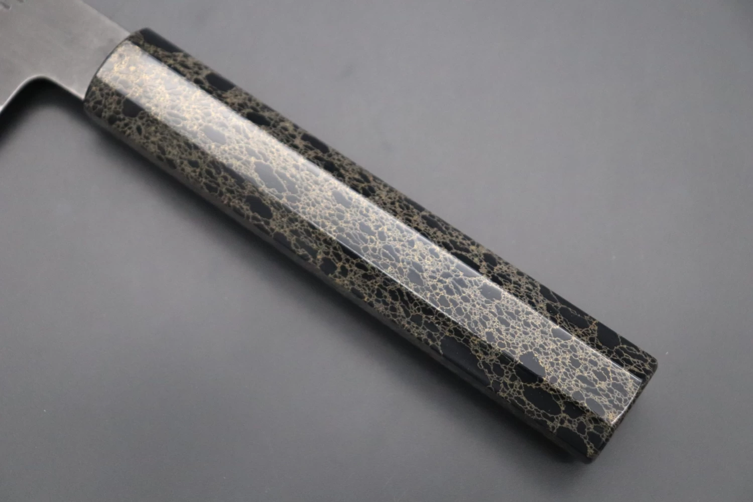 This is the Custom Limited Edition Special Knife Collection. Beautifully polished and finished, Hinoura’s natural gradation color and taste of the modern & traditional Kurouchi Bunka Knife is fitted a with a Innovative Octagonal Black-Golden-Color-Turquoise Composite Stone Handle. Please feel the harmony of the traditional historical art and modern, high-sense design, quality.