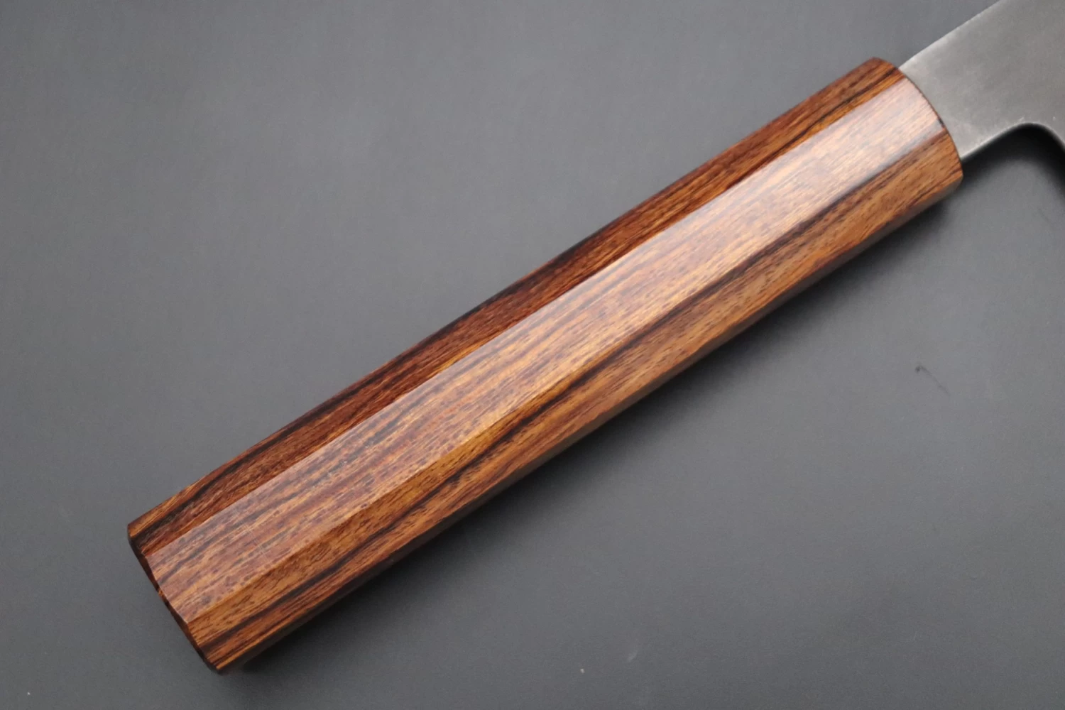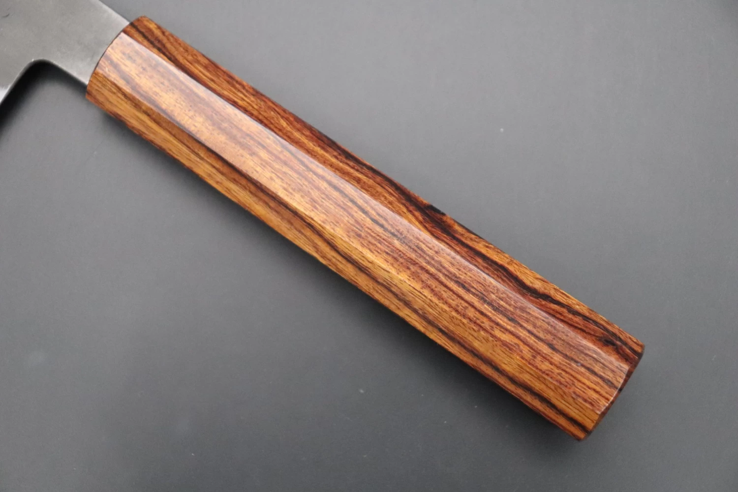 This is the Custom Limited Edition Special Knife Collection. Beautifully polished and finished, Hinoura’s natural gradation color and taste of the modern & traditional Kurouchi Bunka Knife is fitted a with a Innovative Octagonal Desert Ironwood Handle. Please feel the harmony of the traditional historical art and modern, high-sense design, quality.