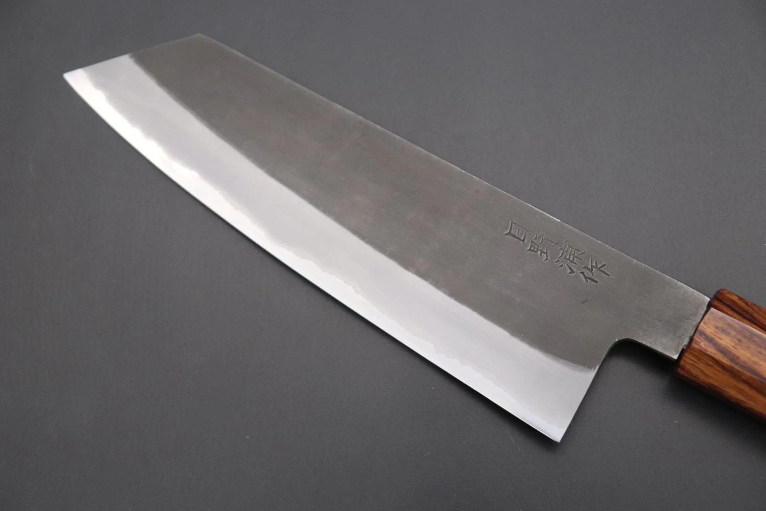 Although some people consider Master Honoura’s knives to be thick and heavy, their geometry is the result of carefully considering every aspect of their function. Contrary to what you might expect, the process of forging a thick blade ‘to shape’ actually requires a lot of time and skill. Master Honoura’s knives are nicely tapered from their heel to the tip and from their spine down to the cutting edge, which is ground very thin behind the edge. We are confident that these knives will provide the high cutting performance that is demanded by Carbon steel lovers!