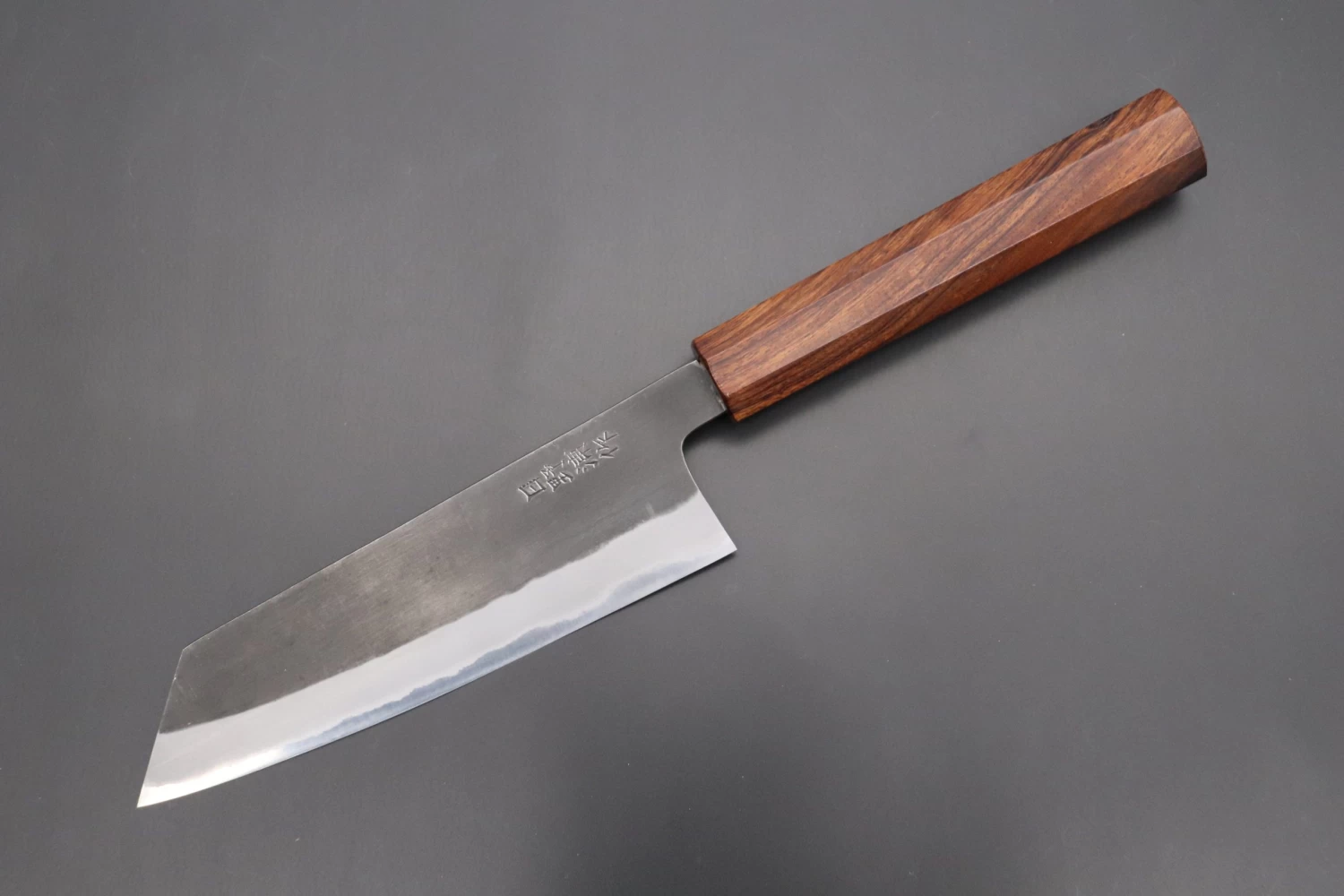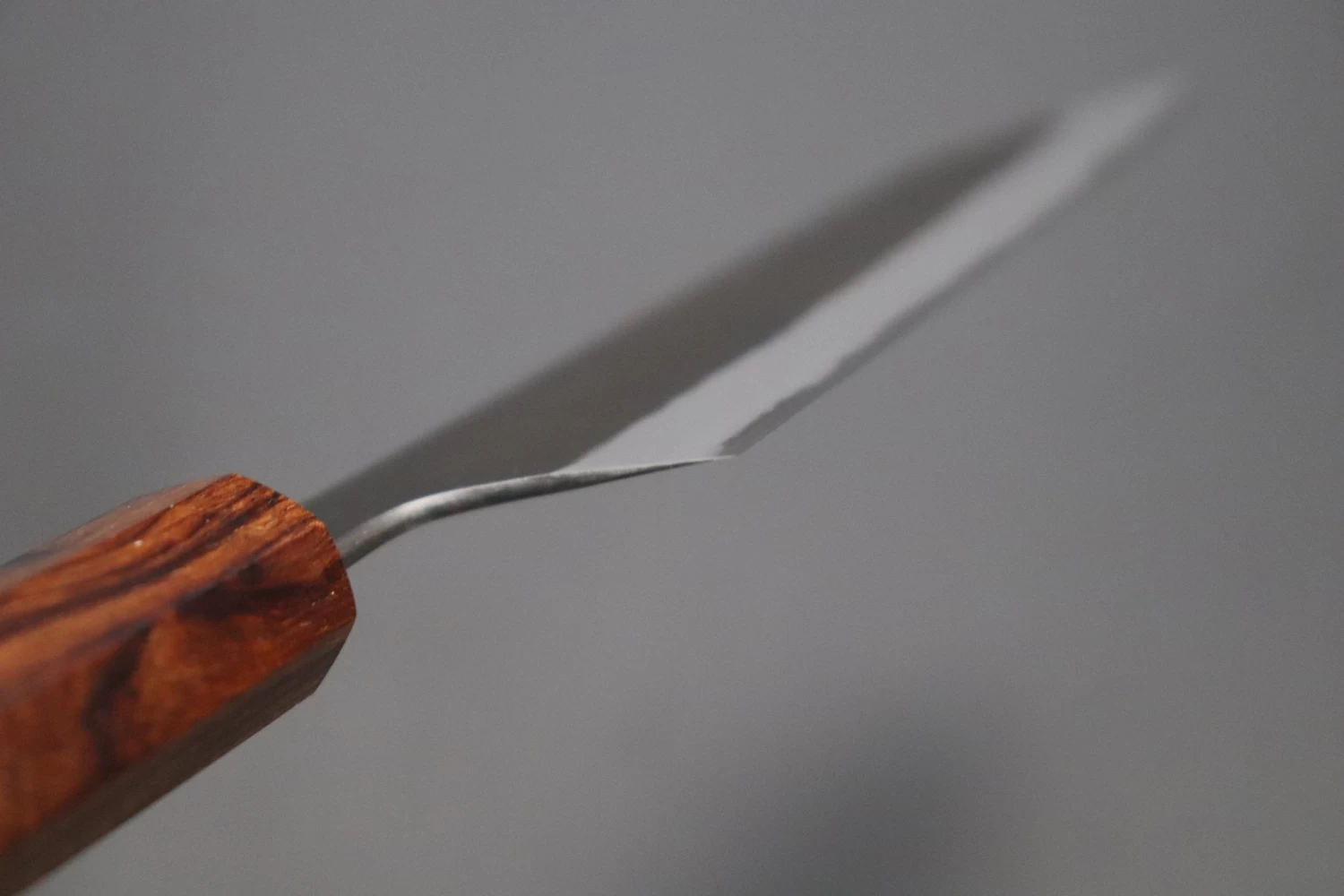 Although some people consider Master Honoura’s knives to be thick and heavy, their geometry is the result of carefully considering every aspect of their function. Contrary to what you might expect, the process of forging a thick blade ‘to shape’ actually requires a lot of time and skill. Master Honoura’s knives are nicely tapered from their heel to the tip and from their spine down to the cutting edge, which is ground very thin behind the edge. We are confident that these knives will provide the high cutting performance that is demanded by Carbon steel lovers!