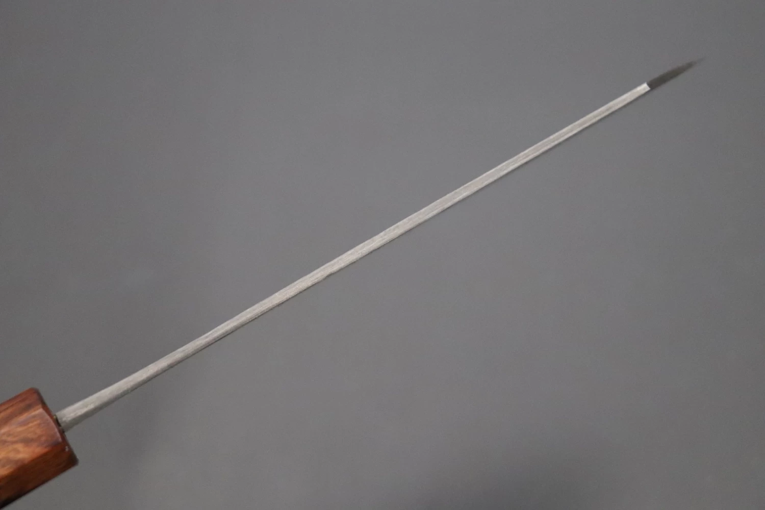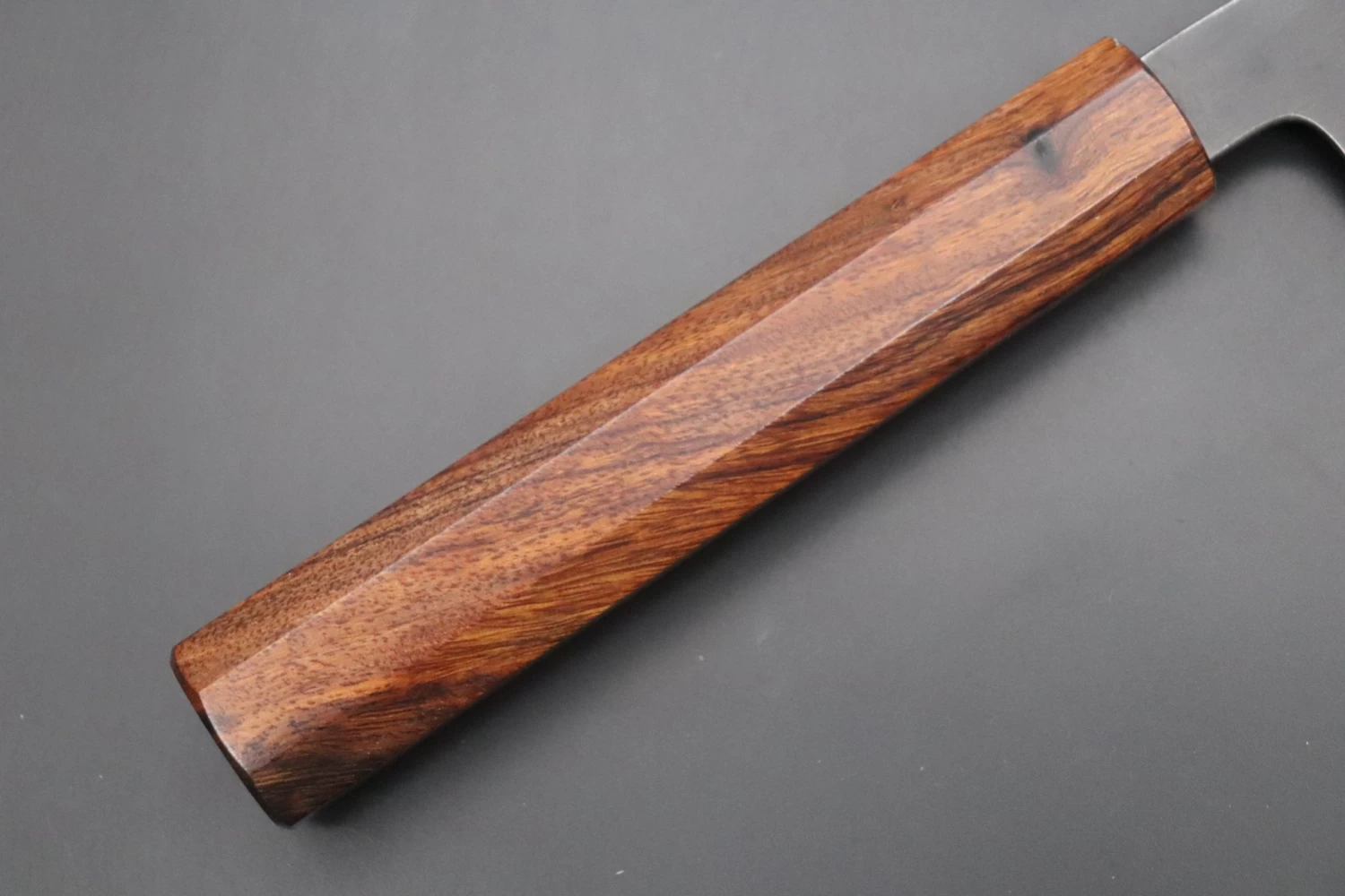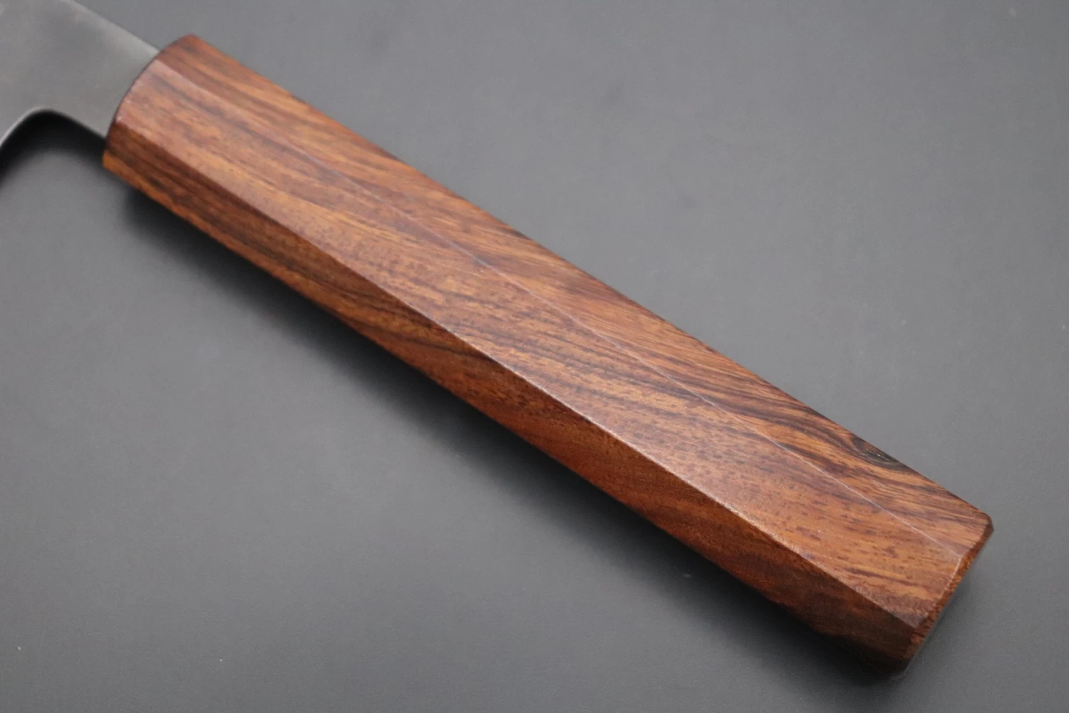 This is the Custom Limited Edition Special Knife Collection. Beautifully polished and finished, Hinoura’s natural gradation color and taste of the modern & traditional Kurouchi Bunka Knife is fitted a with a Innovative Octagonal Desert Ironwood Handle. Please feel the harmony of the traditional historical art and modern, high-sense design, quality.