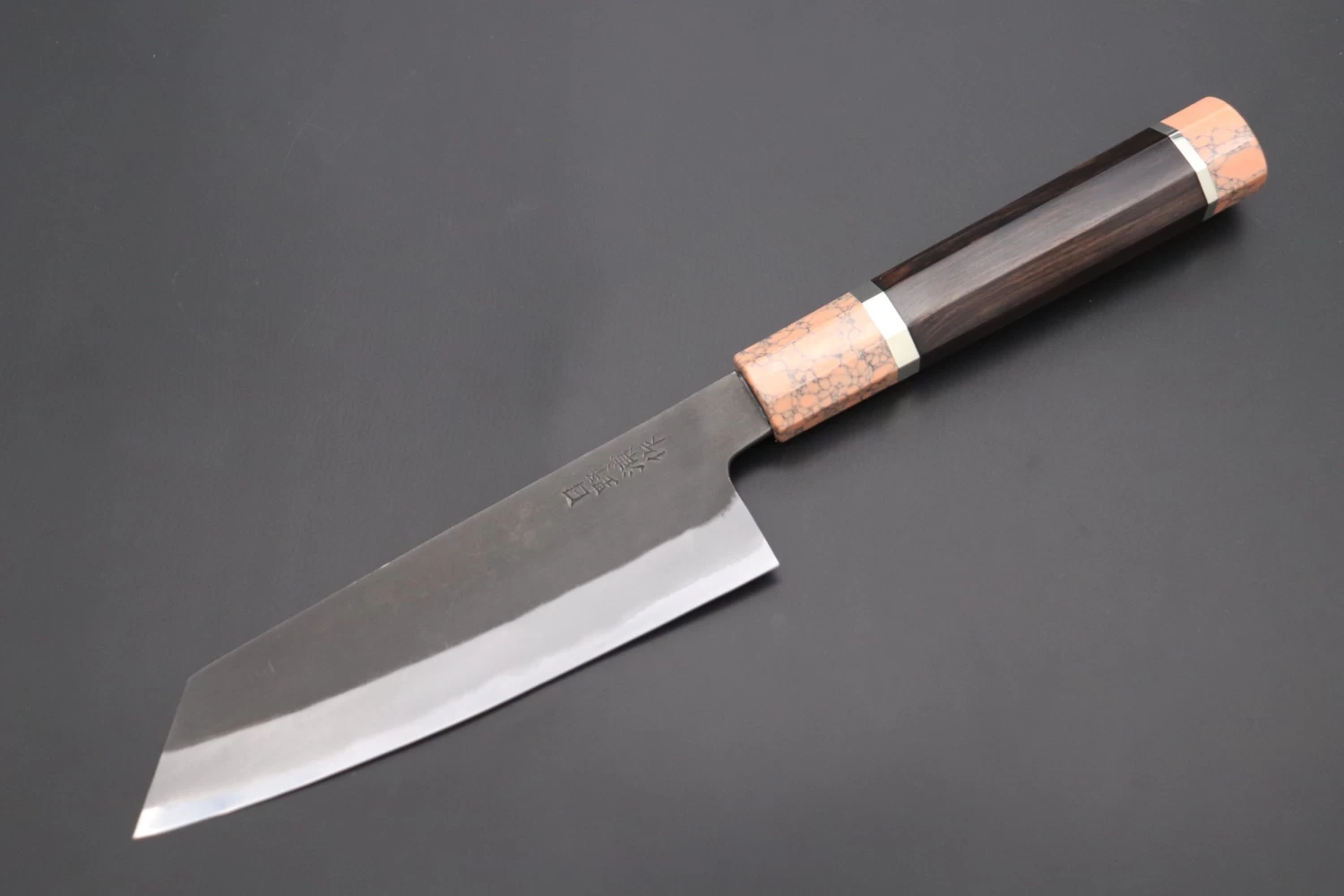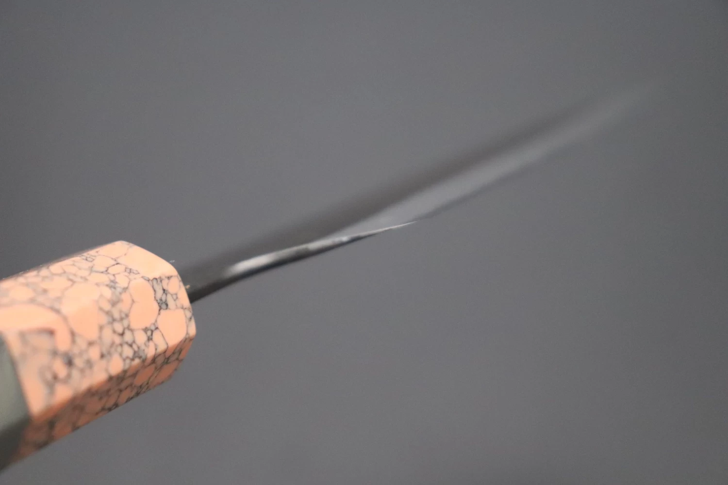 This is the Custom Limited Edition Special Knife Collection. Beautifully polished and finished, Hinoura’s natural gradation color and taste of the modern & traditional Kurouchi Bunka Knife is fitted a with a Innovative Octagonal Ebonywood handle with a Soft Pink Turquoise Composite Stone Ferrule & Butt with Nickel Silver Spacers. Please feel the harmony of the traditional historical art and modern, high-sense design, quality.
