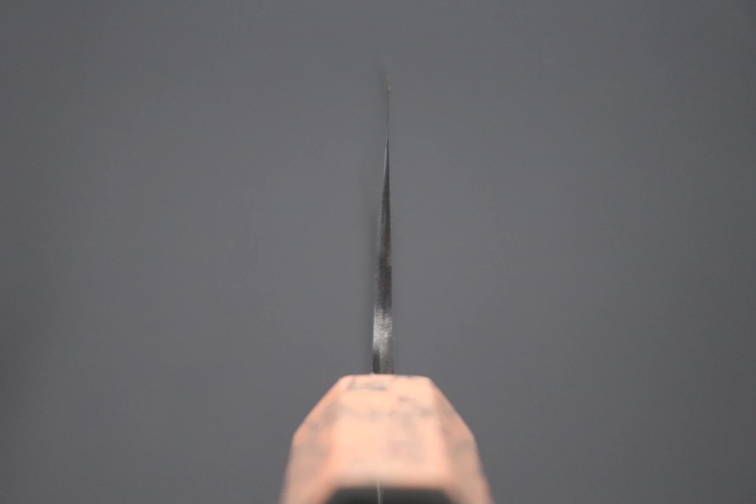 Although some people consider Master Honoura’s knives to be thick and heavy, their geometry is the result of carefully considering every aspect of their function. Contrary to what you might expect, the process of forging a thick blade ‘to shape’ actually requires a lot of time and skill. Master Honoura’s knives are nicely tapered from their heel to the tip and from their spine down to the cutting edge, which is ground very thin behind the edge. We are confident that these knives will provide the high cutting performance that is demanded by Carbon steel lovers!