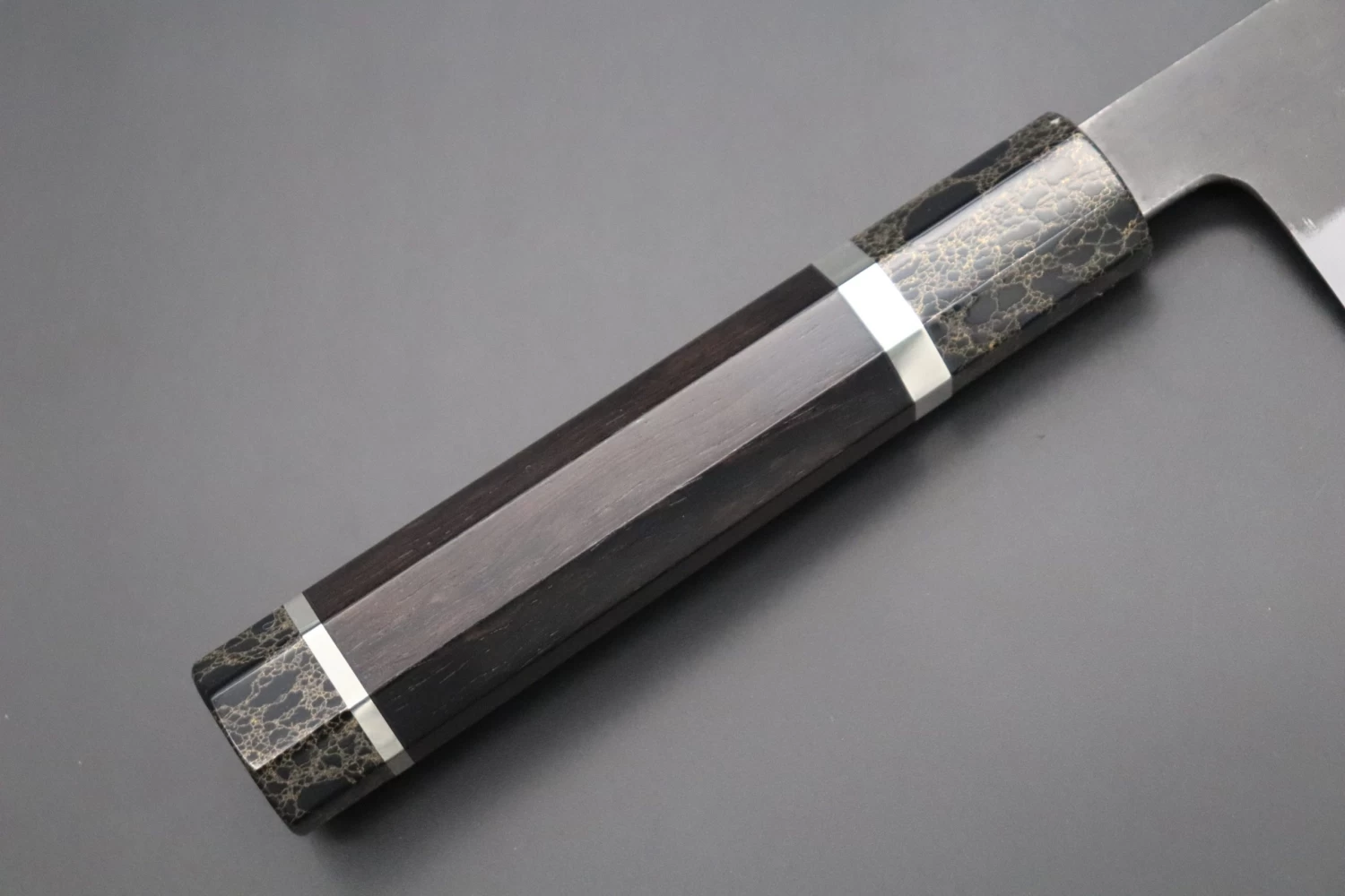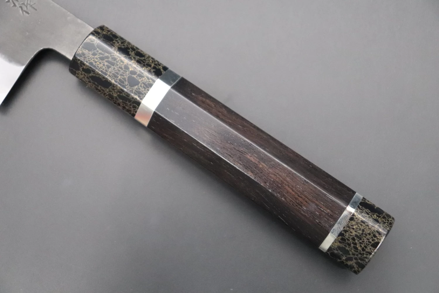 This is the Custom Limited Edition Special Knife Collection. Beautifully polished and finished, Hinoura’s natural gradation color and taste of the modern & traditional Kurouchi Bunka Knife is fitted a with a Innovative Octagonal Ebonywood handle with a Black-Golden-Color-Turquoise Composite Stone Ferrule & Butt with Nickel Silver Spacers. Please feel the harmony of the traditional historical art and modern, high-sense design, quality.