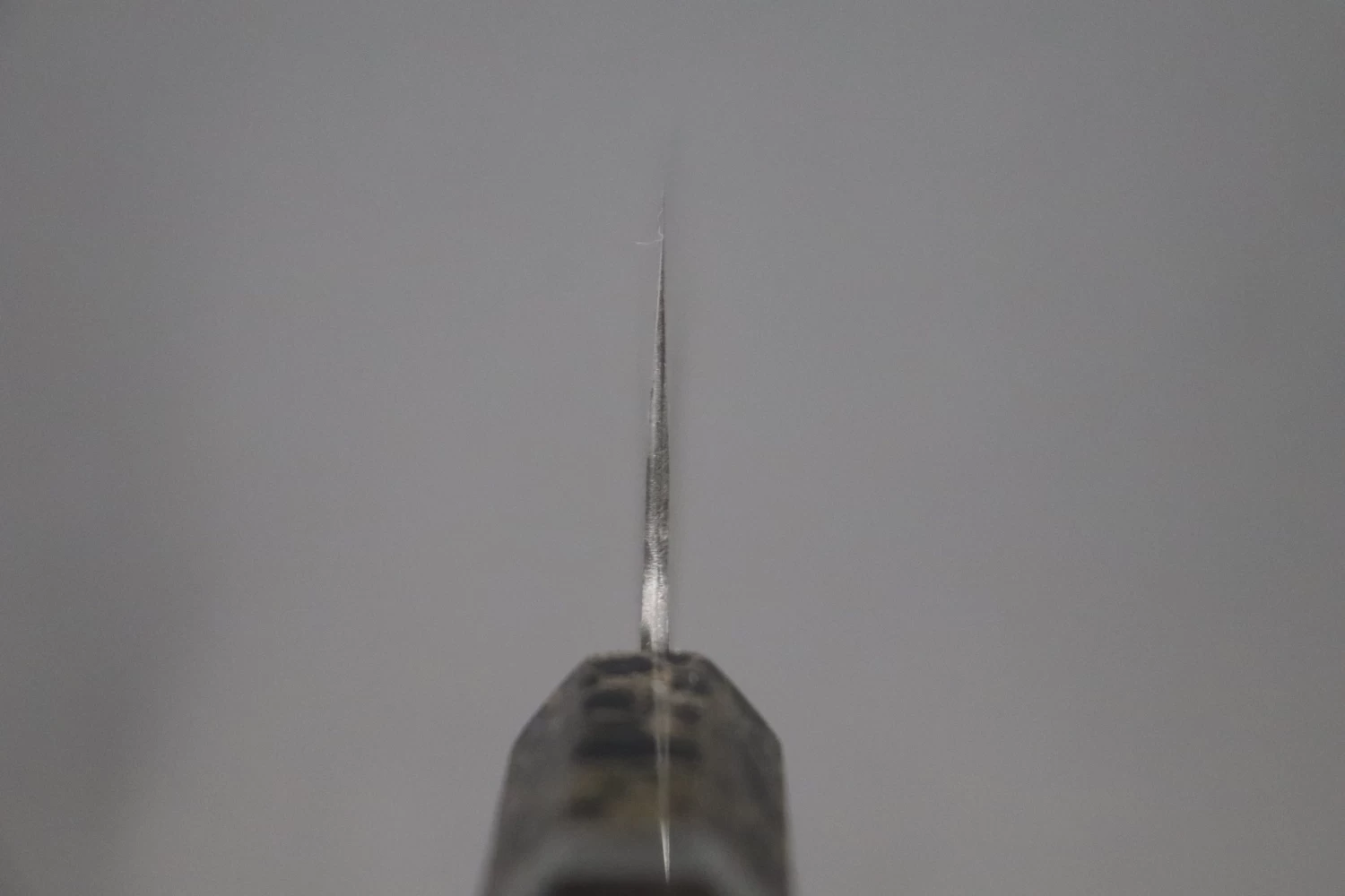 We requested that Hinoura uses White Steel No.1 for the core blade steel. It is sandwiched with outer layers of soft stainless steel. The laminated construction means that only the high-carbon steel blade core is likely to discolor or rust, since the outer layers of soft stainless steel are corrosion-resistant and easy to maintain. The layers of soft stainless steel also improve the blade’s resistance to impact and bending forces. White Steel No.1 is made by further refining White Steel No.2 and adding more Carbon. The extra Carbon allows it to achieve a slightly higher HRc. than White Steel No.2. It can be sharpened to an exceedingly fine edge, has very good edge retention and is easy to re-sharpen.