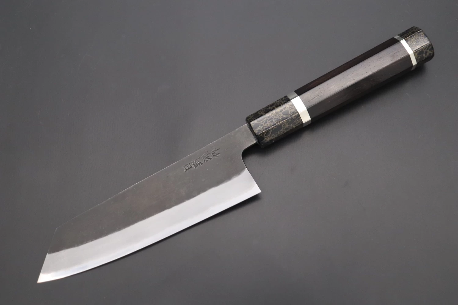 Although some people consider Master Honoura’s knives to be thick and heavy, their geometry is the result of carefully considering every aspect of their function. Contrary to what you might expect, the process of forging a thick blade ‘to shape’ actually requires a lot of time and skill. Master Honoura’s knives are nicely tapered from their heel to the tip and from their spine down to the cutting edge, which is ground very thin behind the edge. We are confident that these knives will provide the high cutting performance that is demanded by Carbon steel lovers!