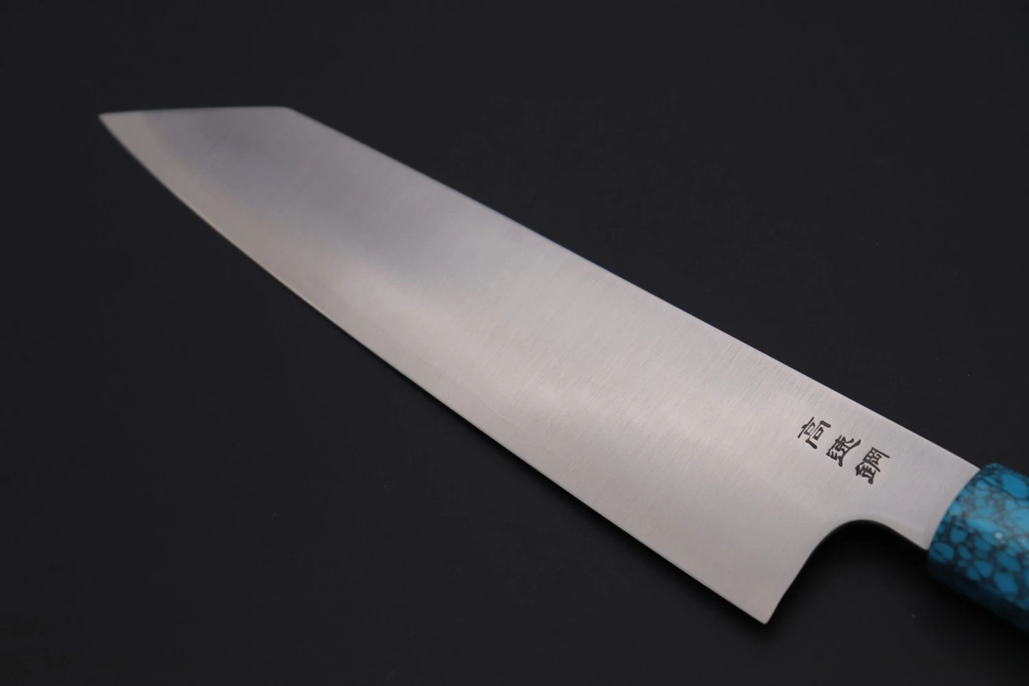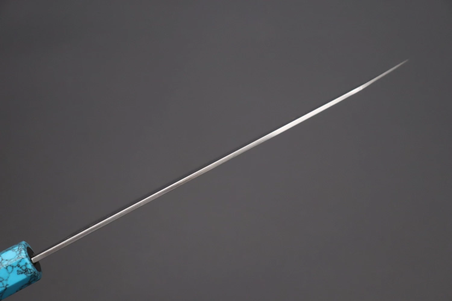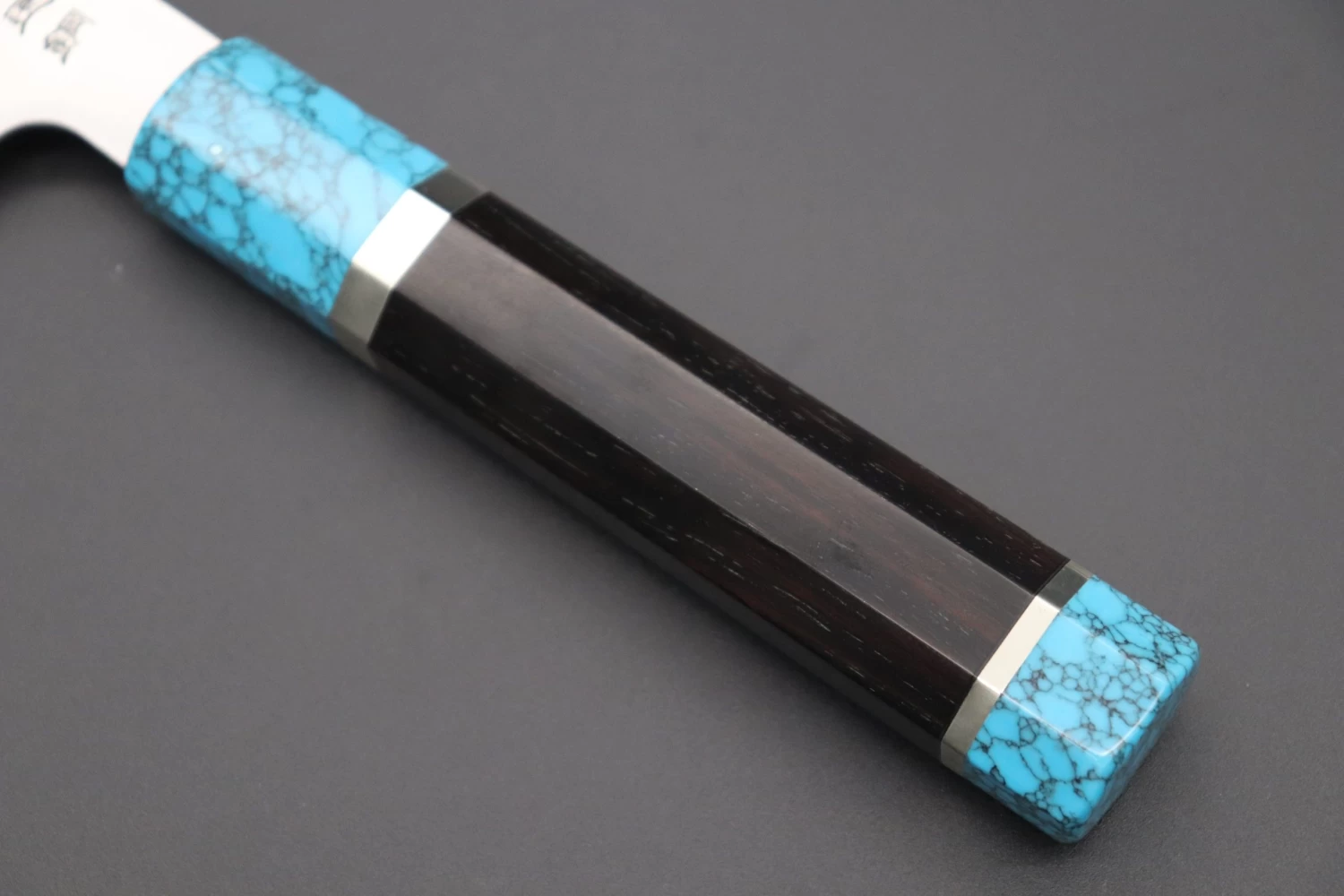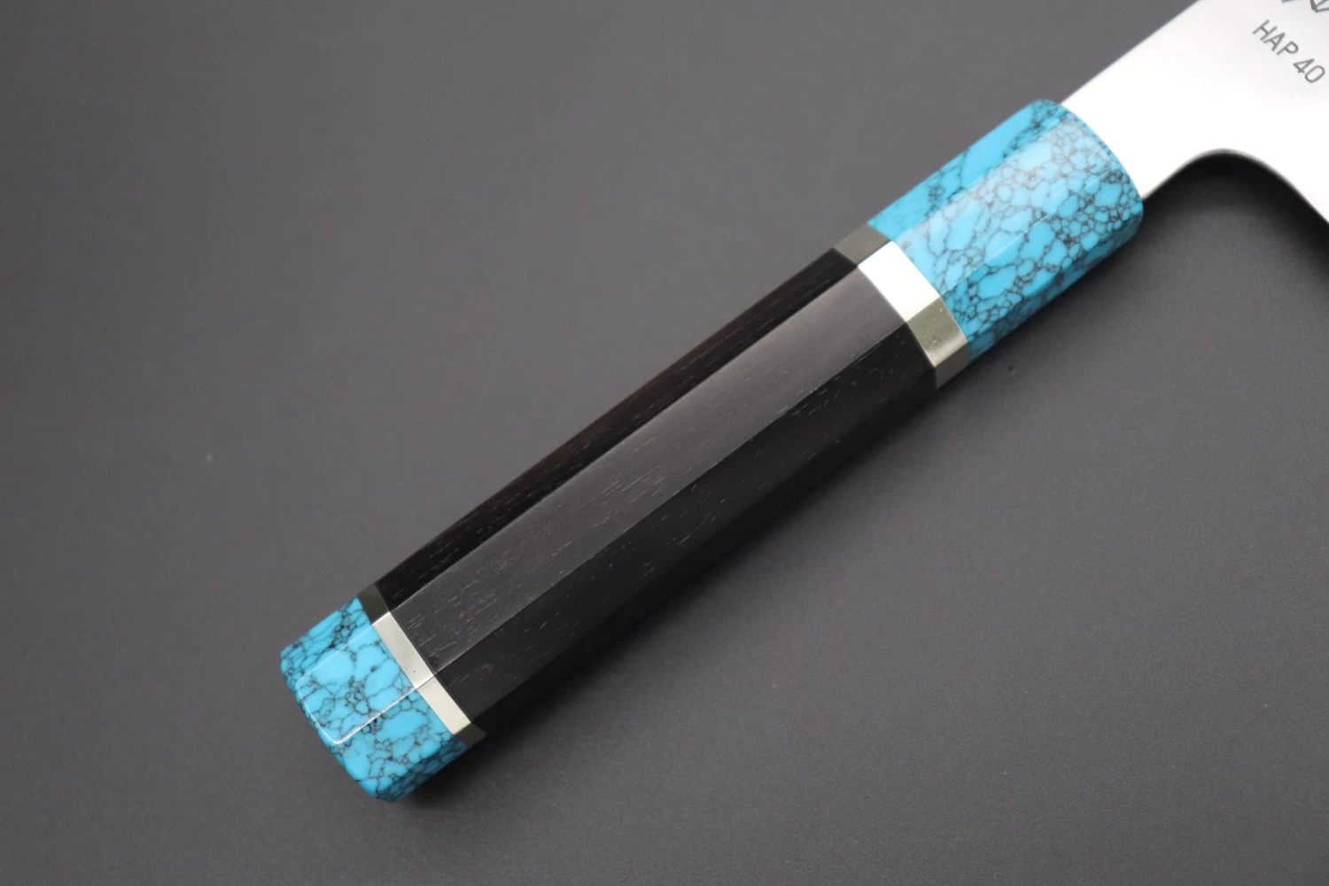 This Custom Limited Edition Sukenari HAP-40 Clad Kiritsuke knife is fitted with a Innovative Octagonal Ebonywood Handle with Nickel Silver Spacers and a Turquoise Composite Stone Ferrule & Butt. A matching Magnolia wood Saya (Sheath) with a black pakkawood Saya pin is also included with the knife.