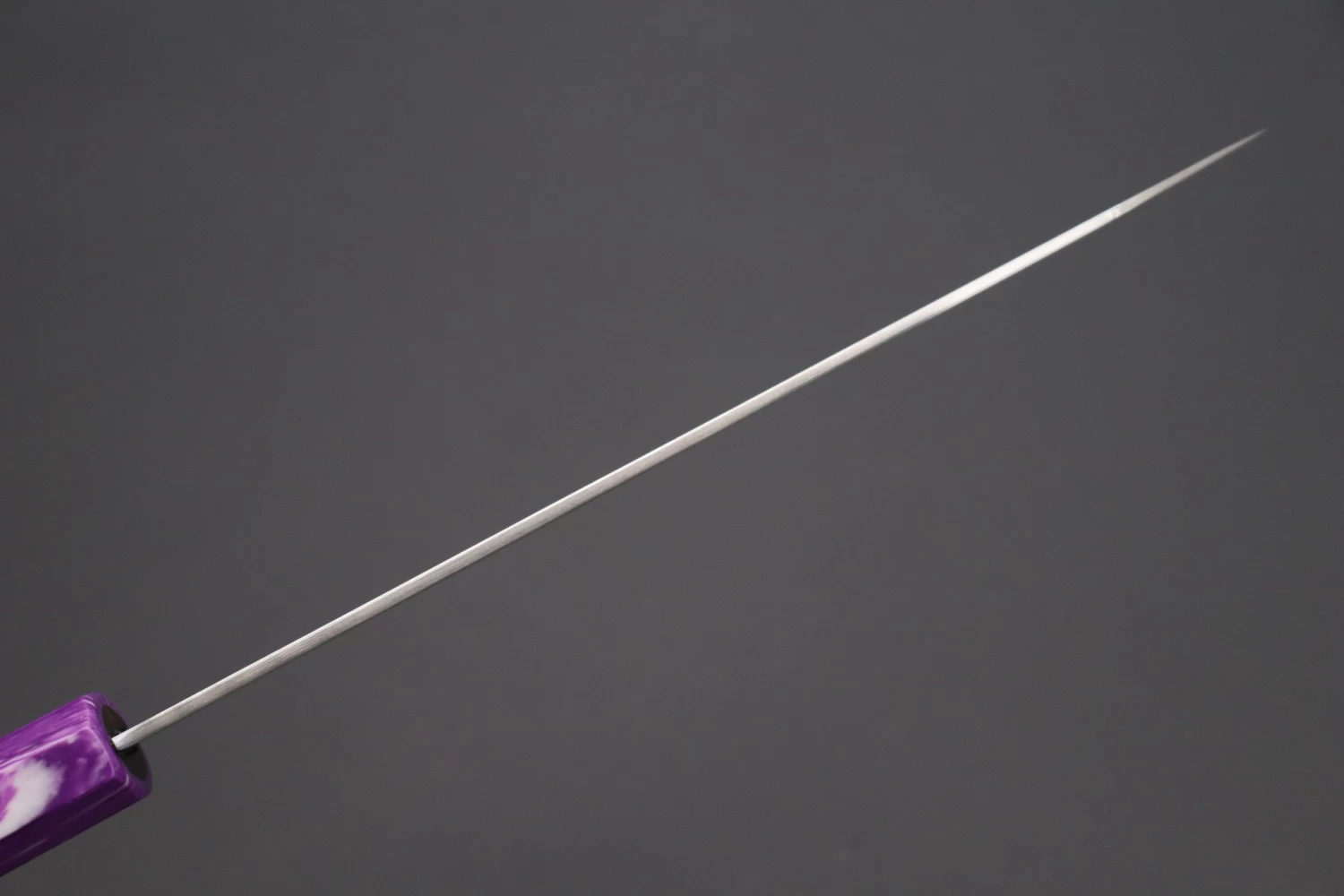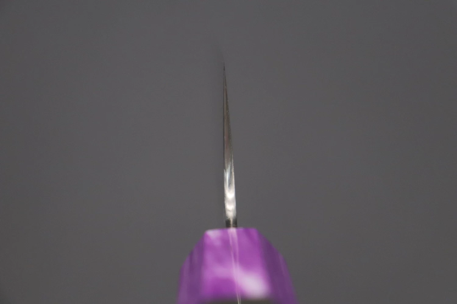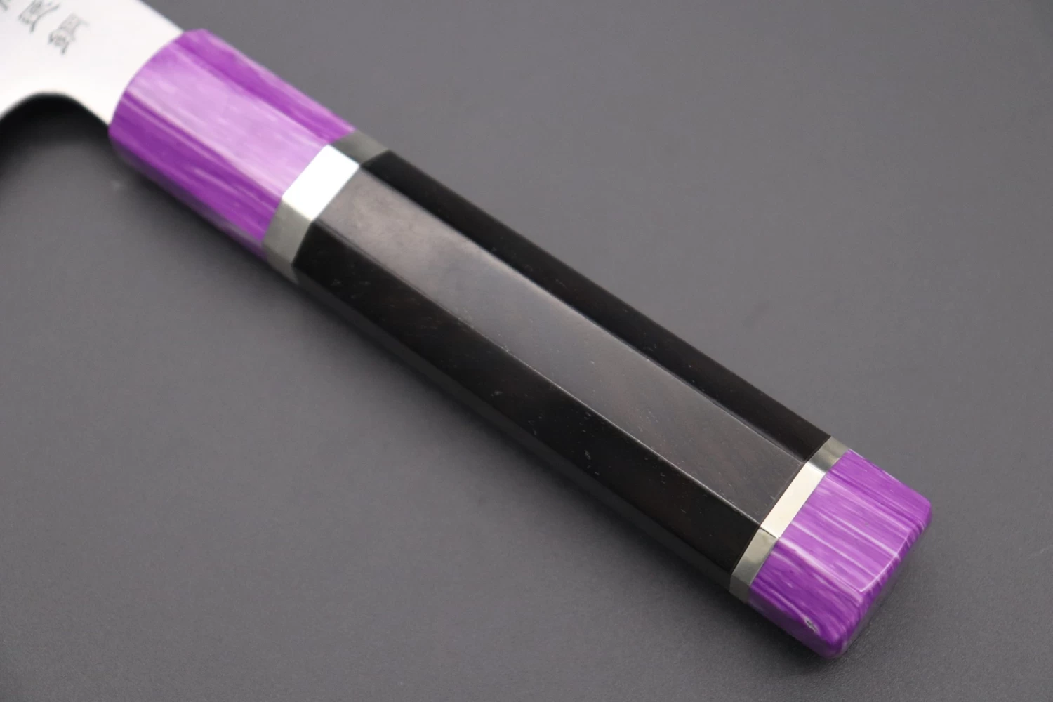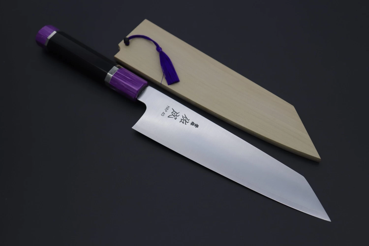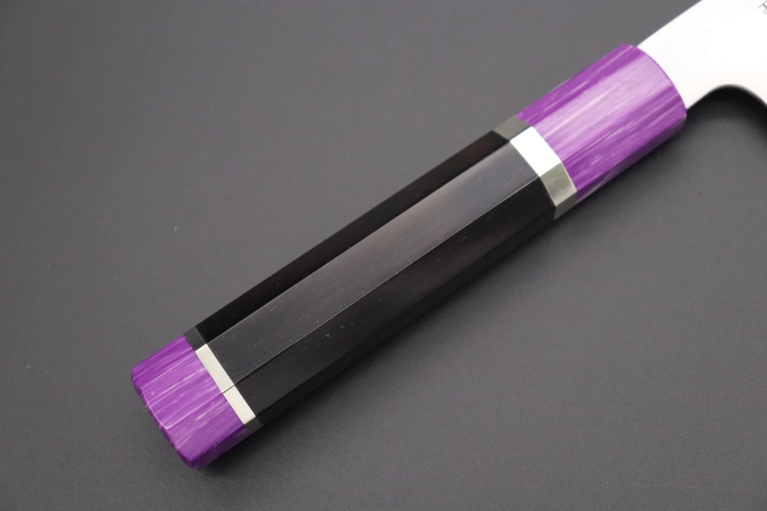 This Custom Limited Edition Sukenari HAP-40 Clad Kiritsuke knife is fitted with a Innovative Octagonal Ebonywood Handle with Nickel Silver Spacers and a Royal Purple Composite Stone Ferrule & Butt. A matching Magnolia wood Saya (Sheath) with a black pakkawood Saya pin is also included with the knife.