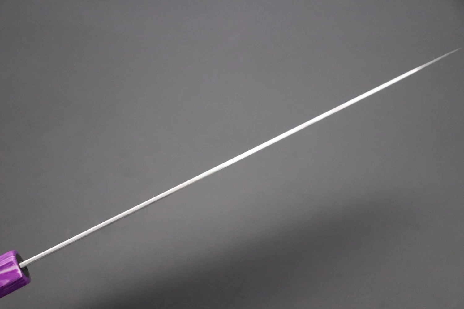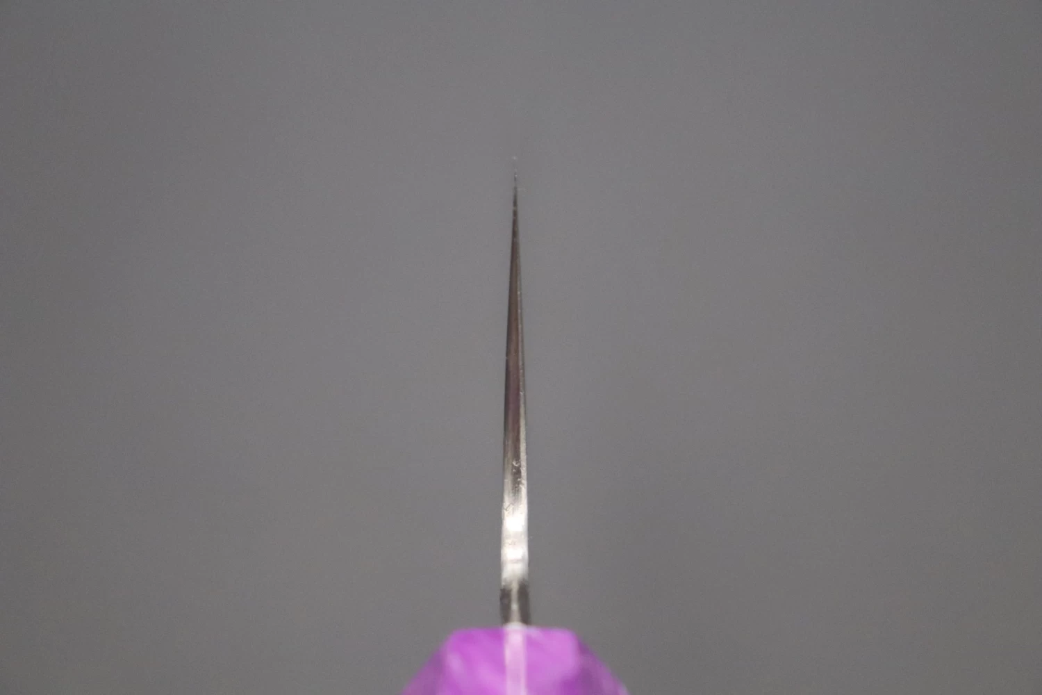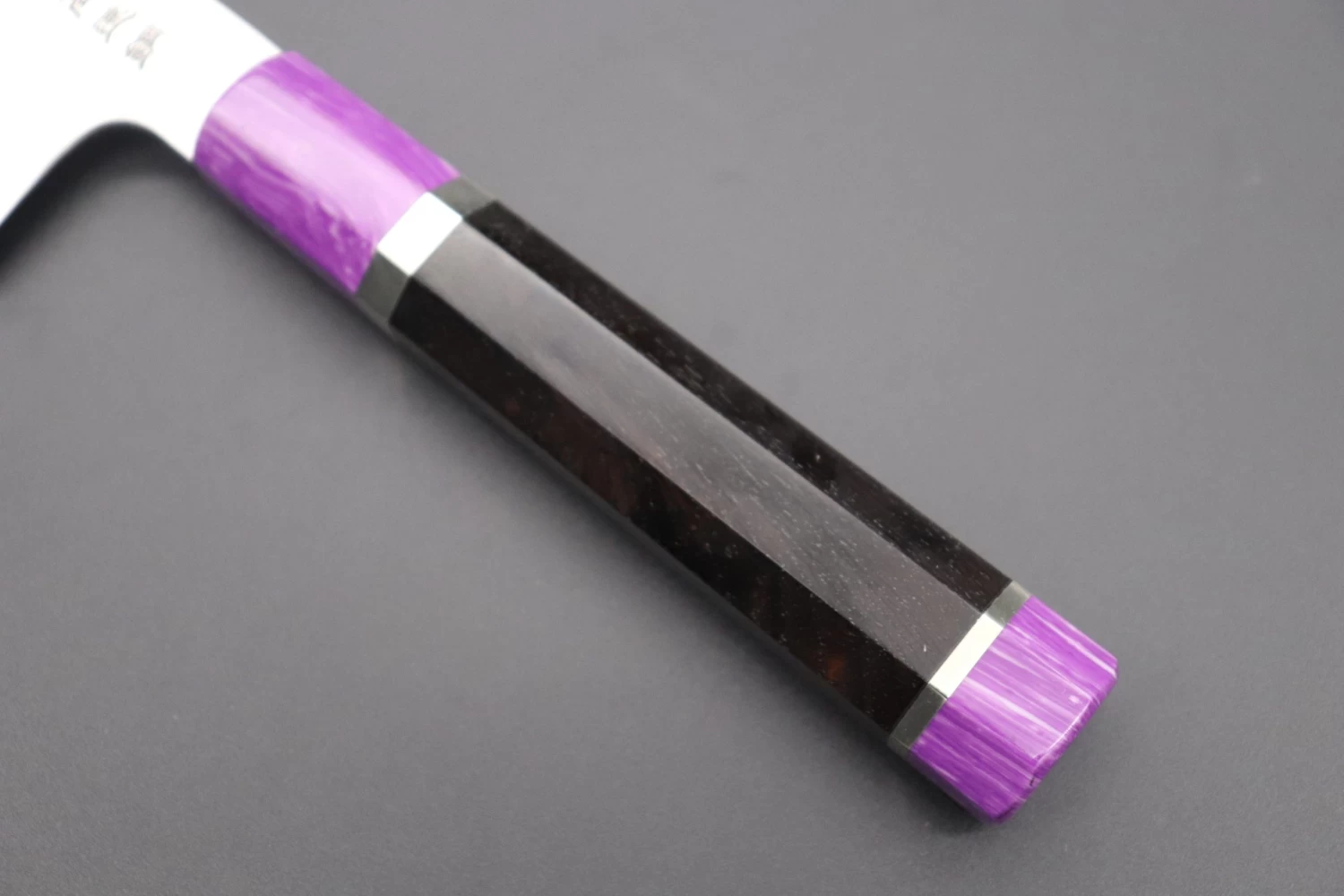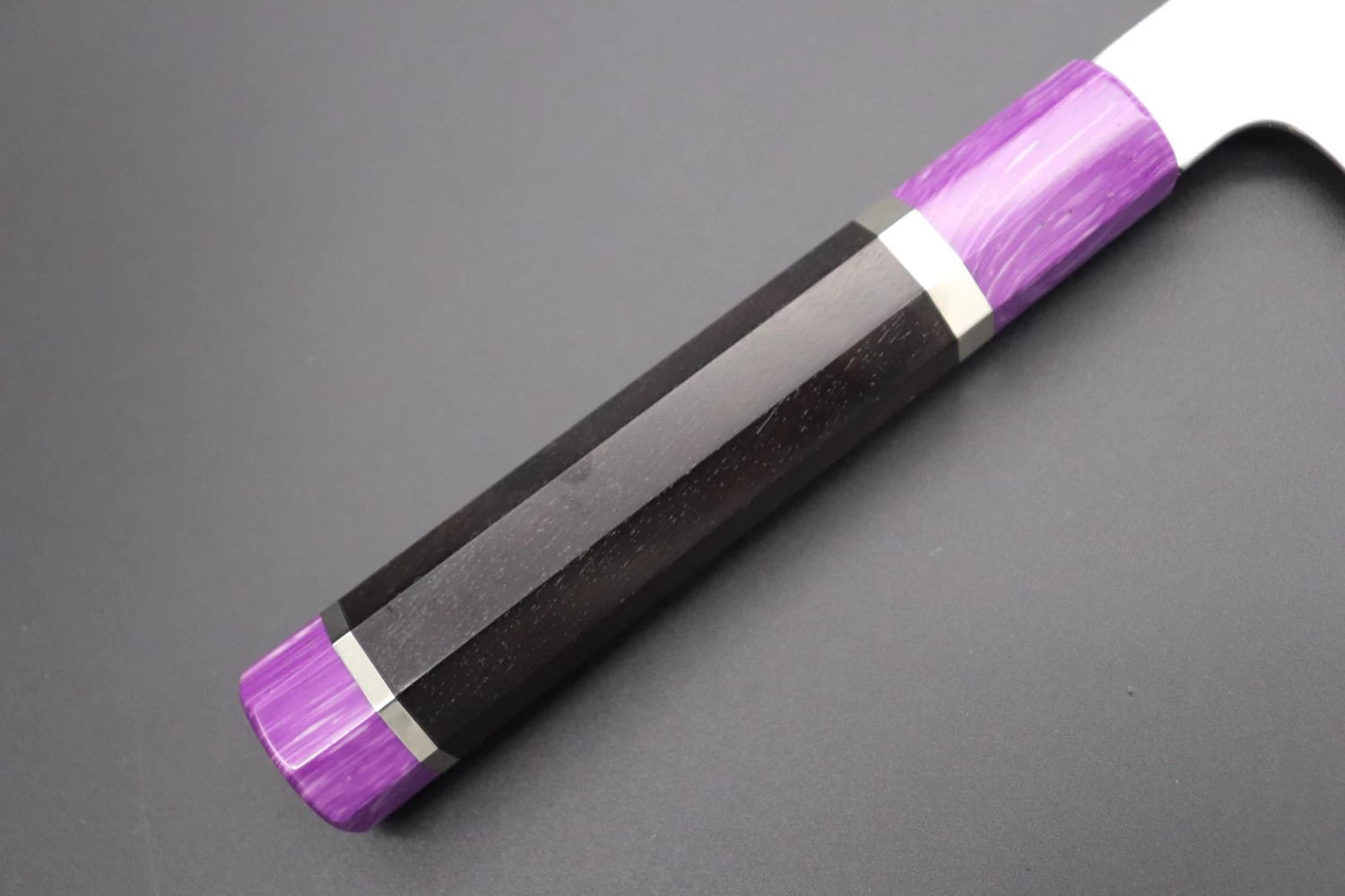 This Custom Limited Edition Sukenari HAP-40 Clad Kiritsuke knife is fitted with a Innovative Octagonal Ebonywood Handle with Nickel Silver Spacers and a Royal Purple Composite Stone Ferrule & Butt. A matching Magnolia wood Saya (Sheath) with a black pakkawood Saya pin is also included with the knife.