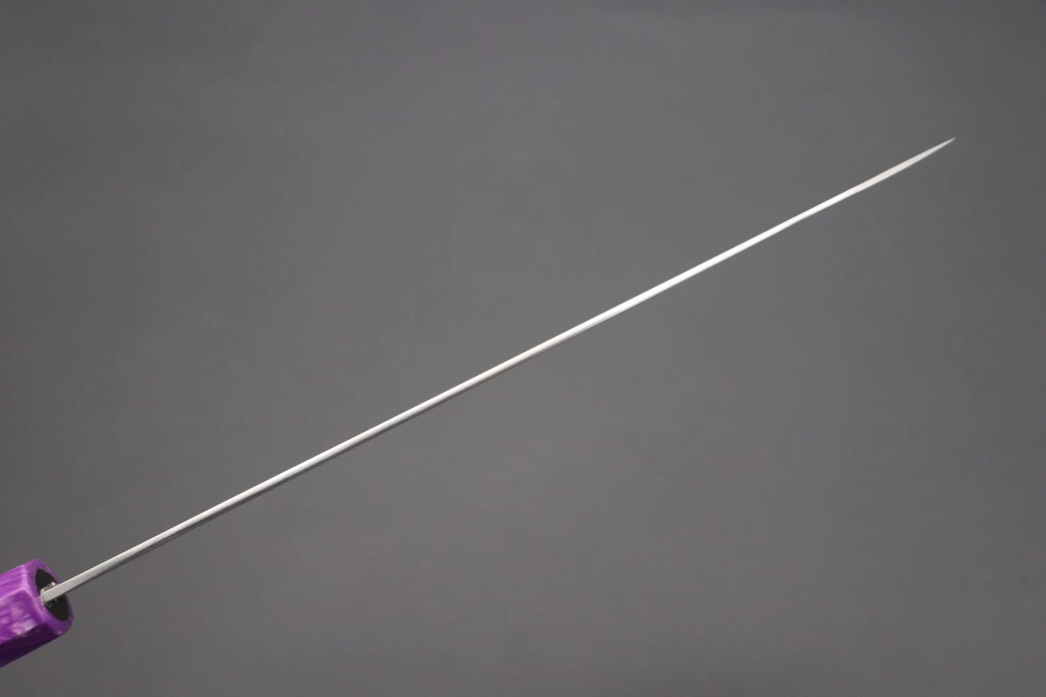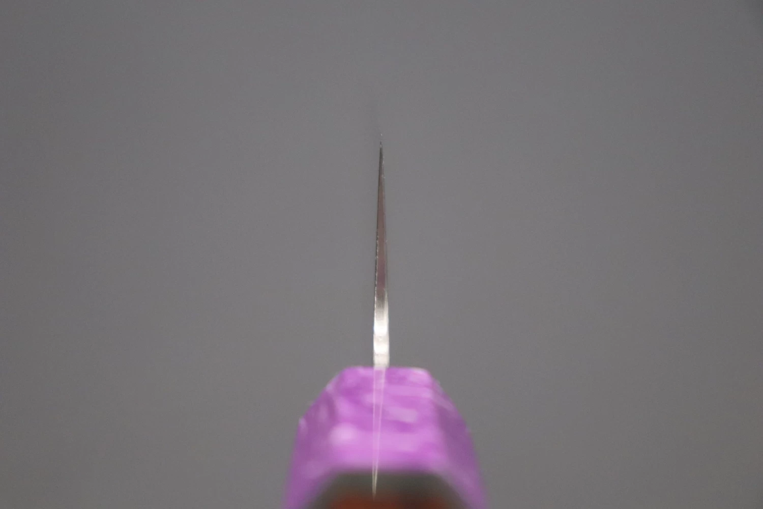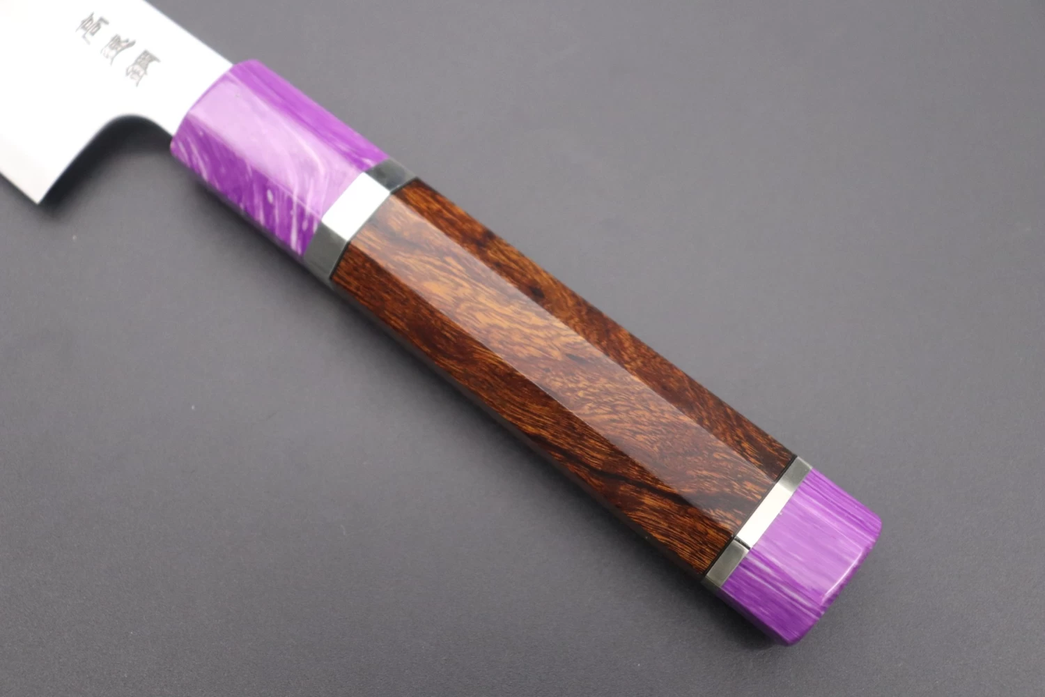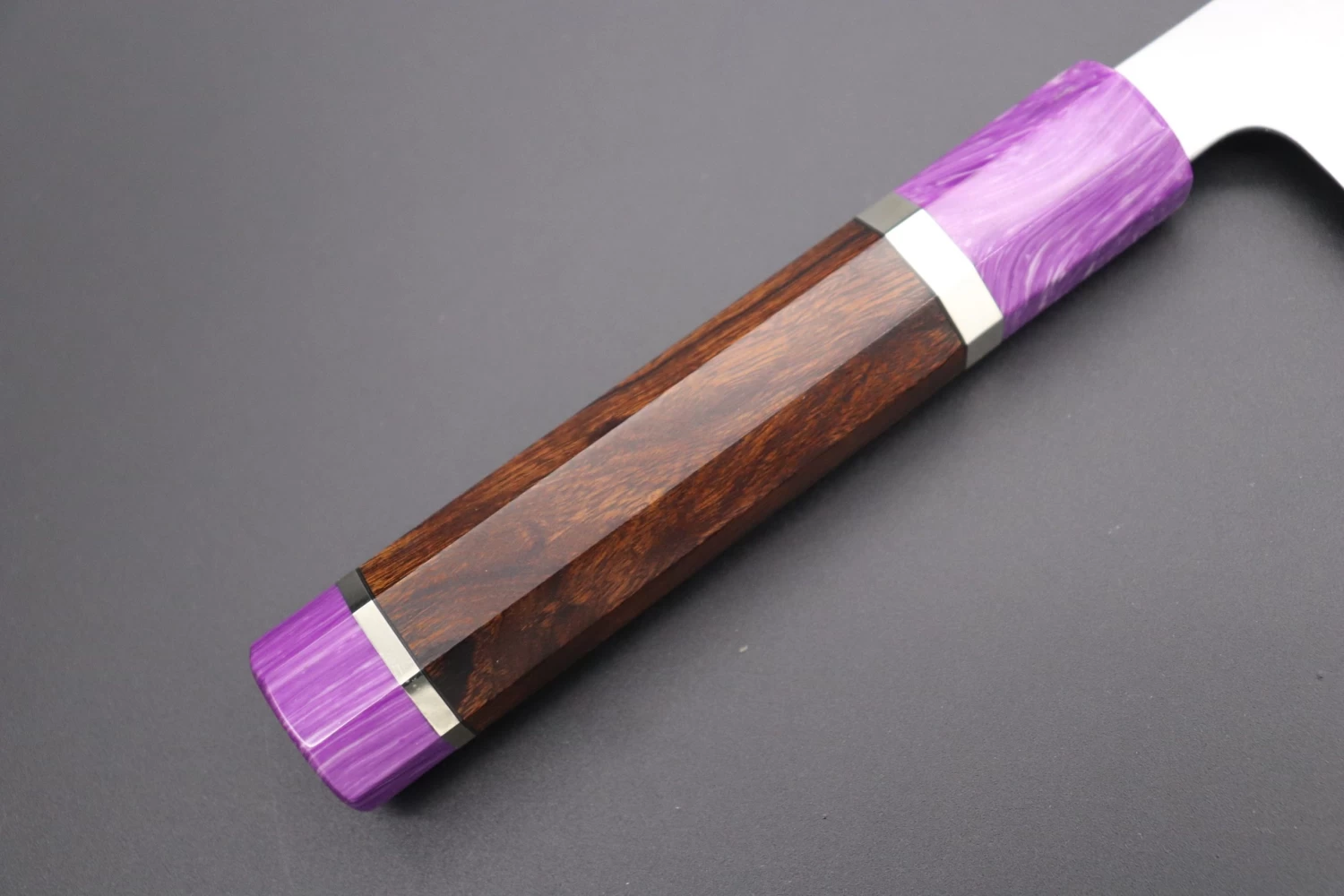 This Custom Limited Edition Sukenari HAP-40 Clad Kiritsuke Slicer knife is fitted with a Innovative Octagonal Desert Ironwood Handle with Nickel Silver Spacers and a Royal Purple Composite Stone Ferrule & Butt. A matching Magnolia wood Saya (Sheath) with a black pakkawood Saya pin is also included with the knife.