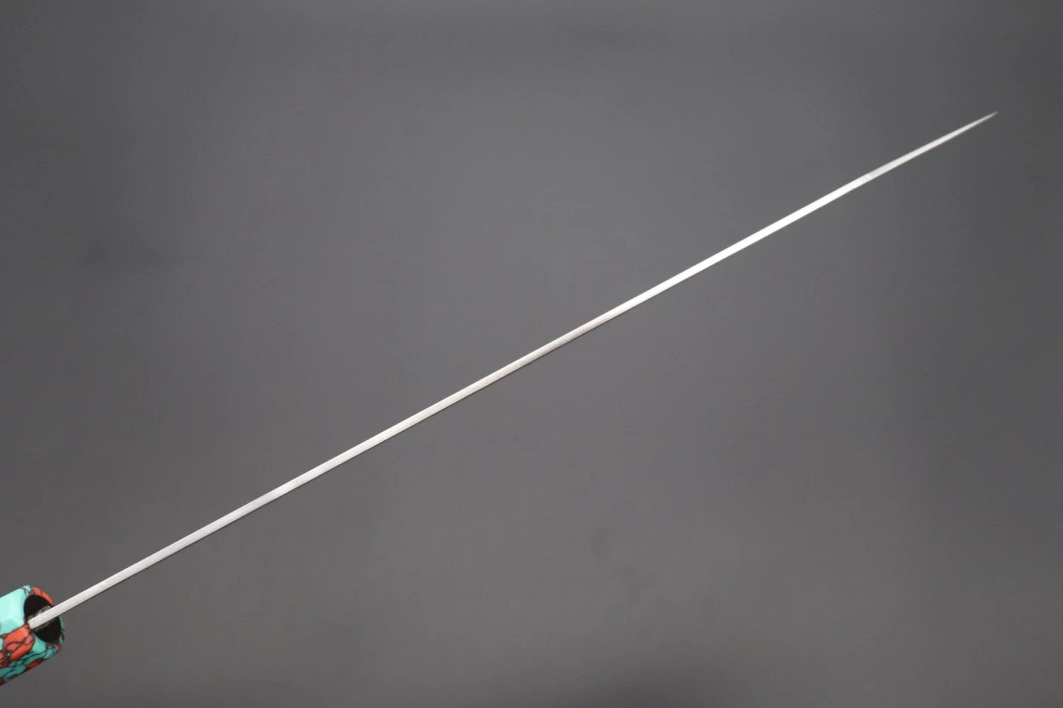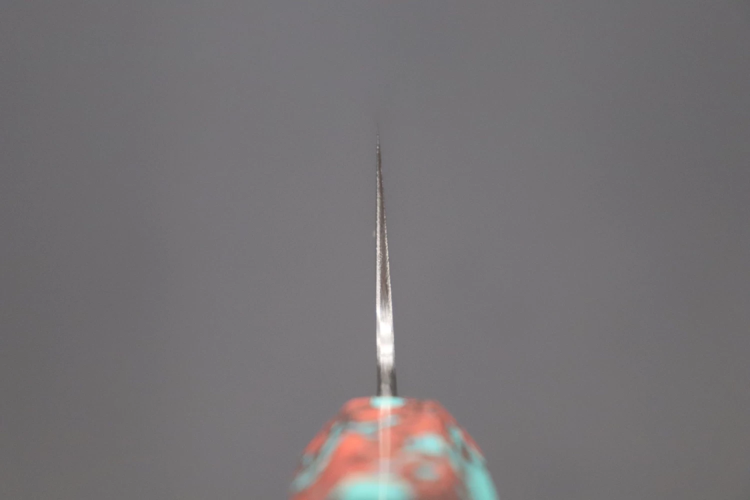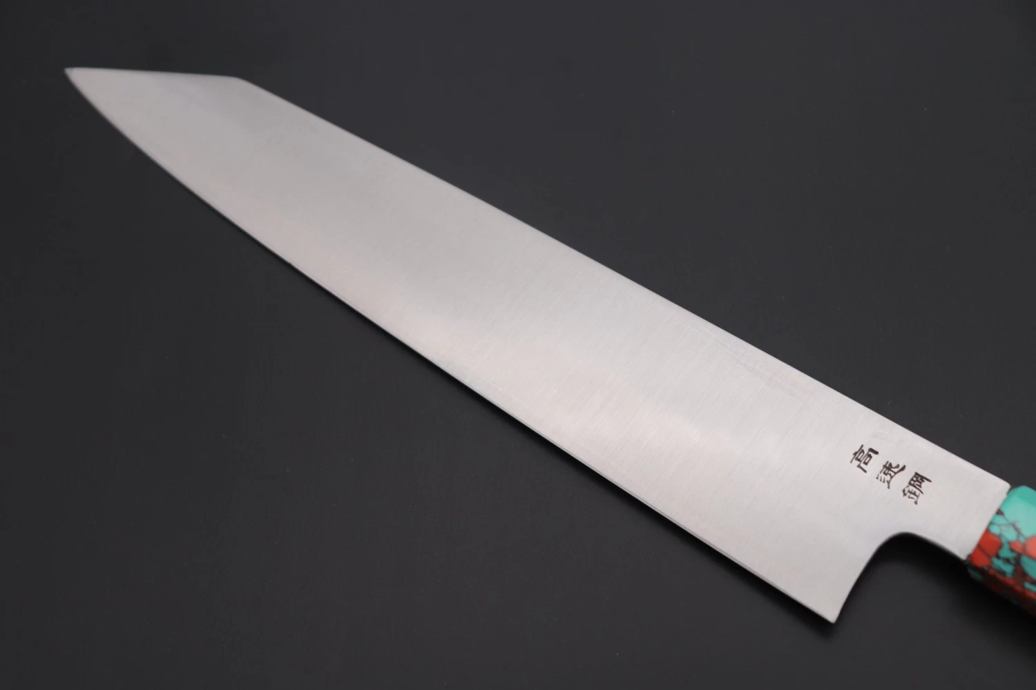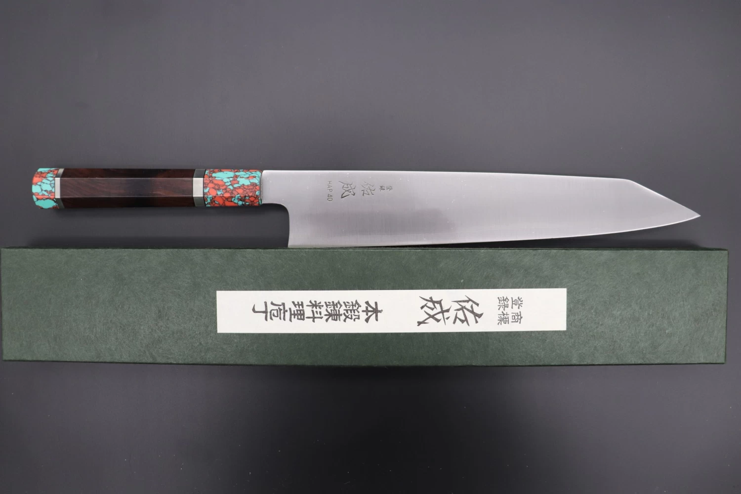 This Custom Limited Edition Sukenari HAP-40 Clad Kiritsuke Slicer knife is fitted with a Innovative Octagonal Ebonywood handle with a Fancy Green & Pink Turquoise Gem-Composite Stone Ferrule & Butt with Nickel Silver Spacers. A matching Magnolia wood Saya (Sheath) with a black pakkawood Saya pin is also included with the knife.
