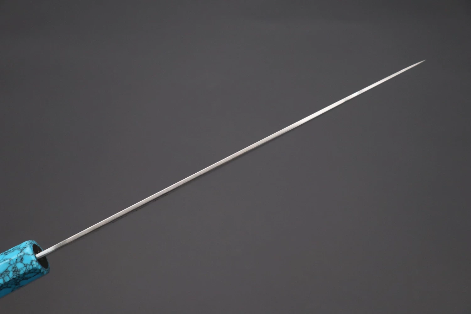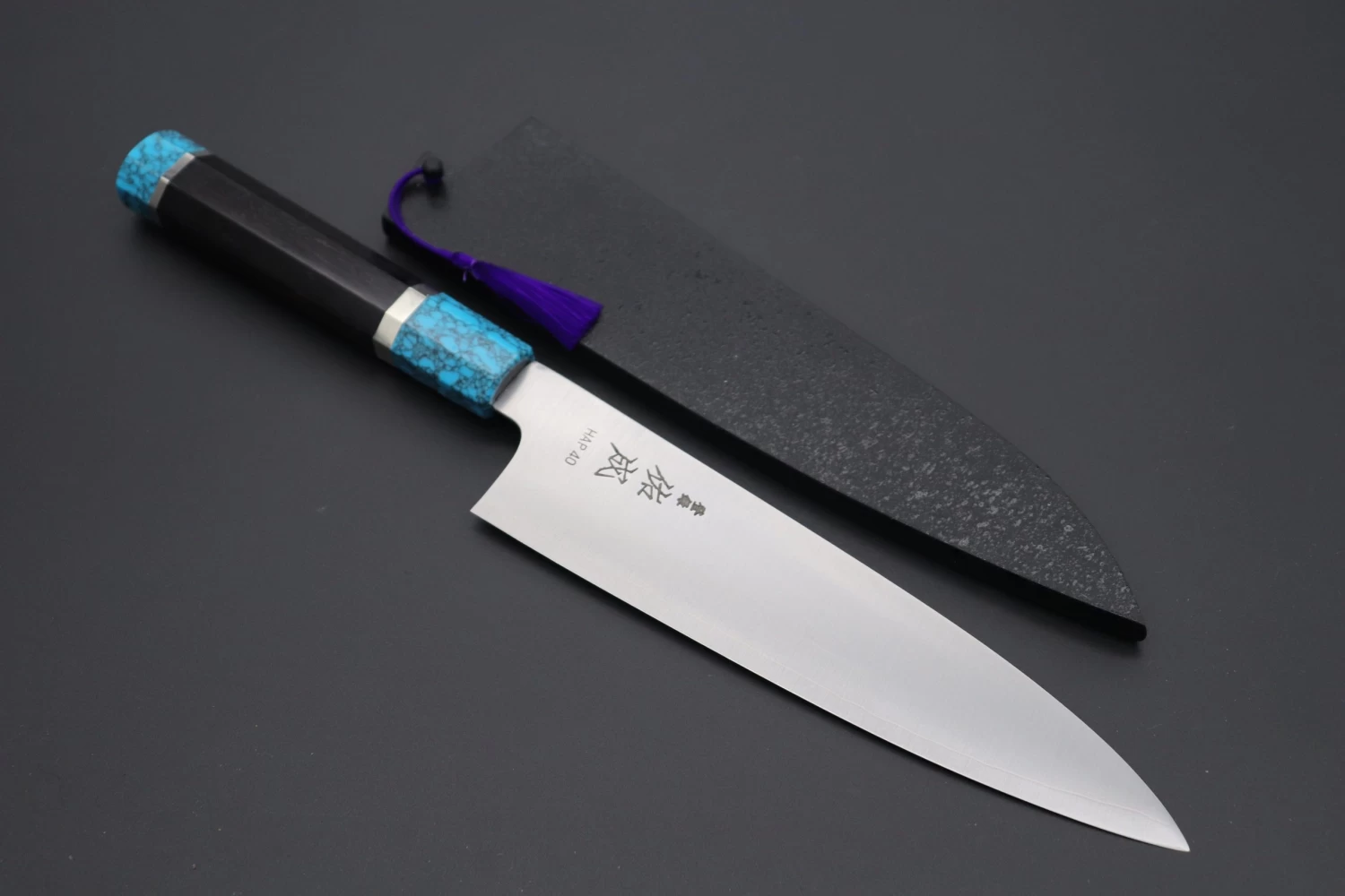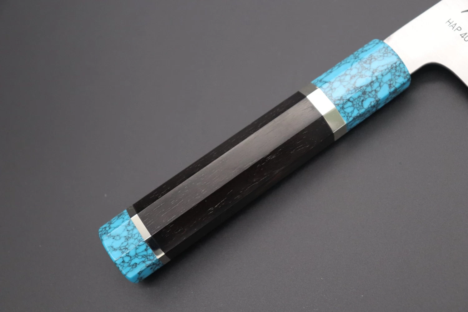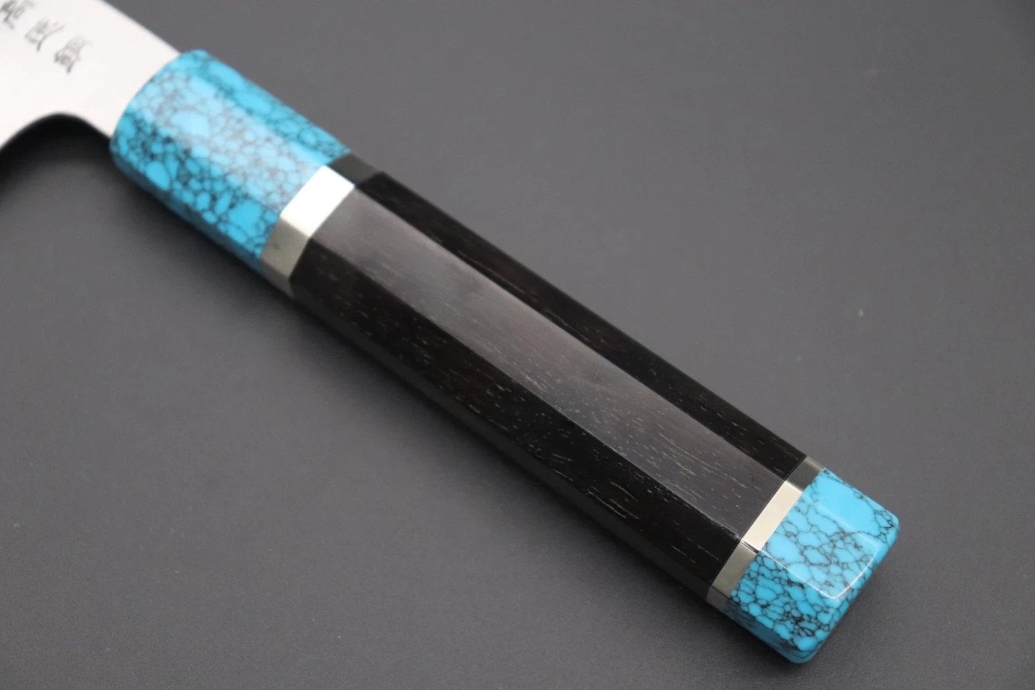 This Custom Limited Edition Sukenari HAP-40 Clad Wa Gyuto knife is fitted with a Innovative Octagonal Ebonywood Handle with Nickel Silver Spacers and a Turquoise Composite Stone Ferrule & Butt. A matching Black Lacquered wood Saya (Sheath) with a black pakkawood Saya pin is also included with the knife.