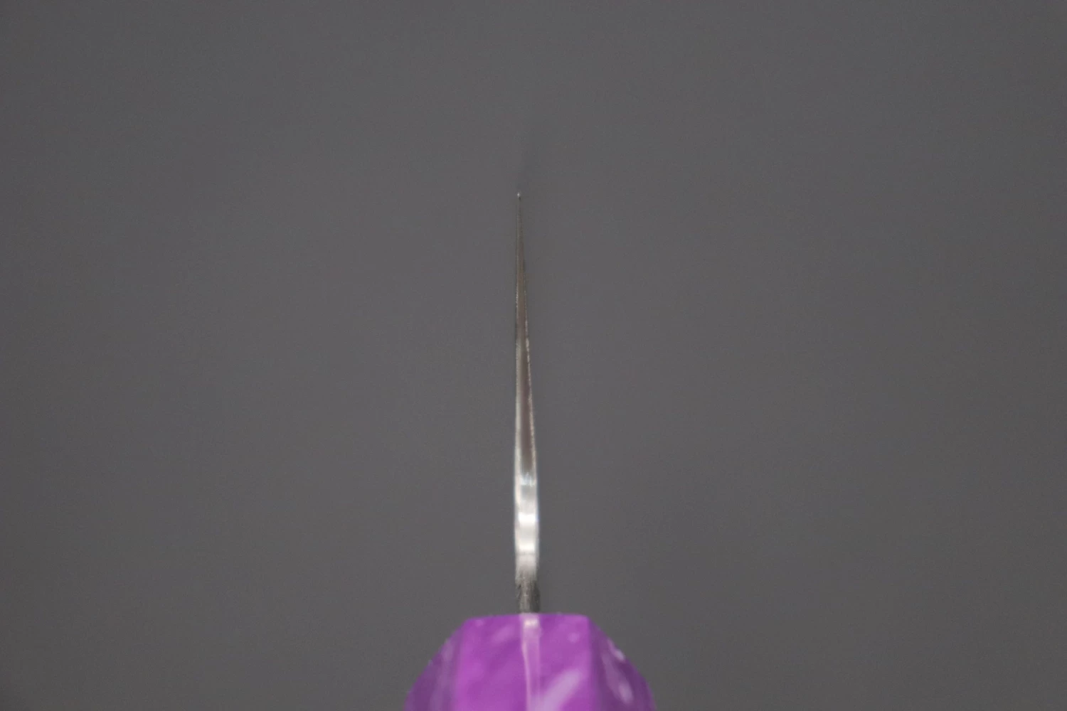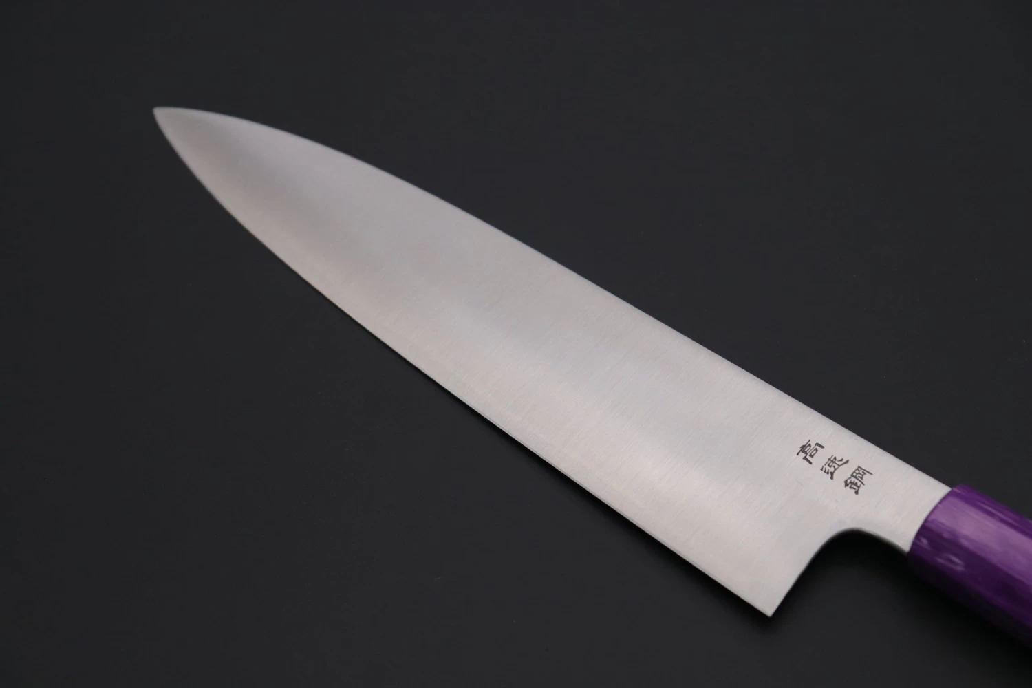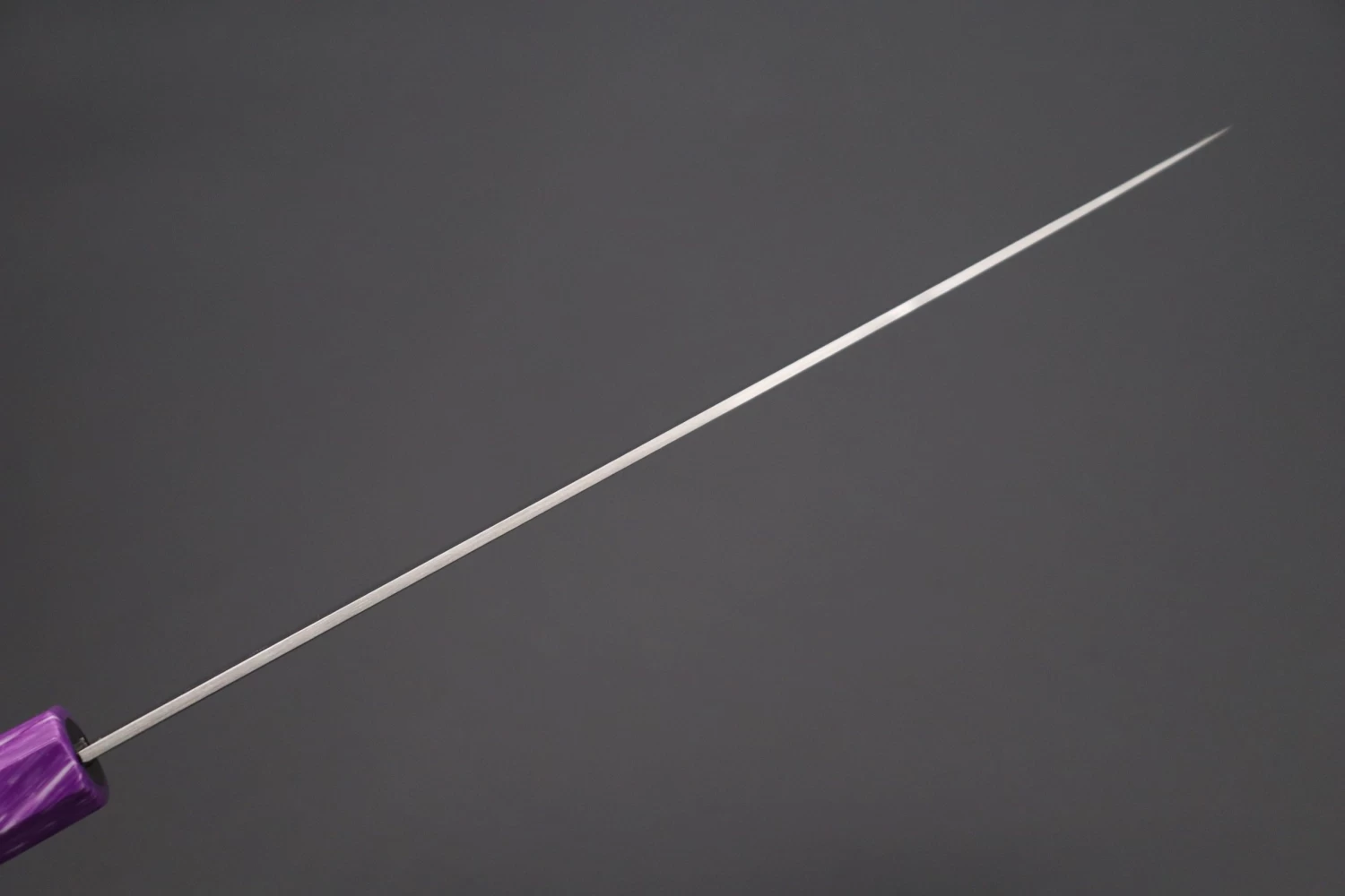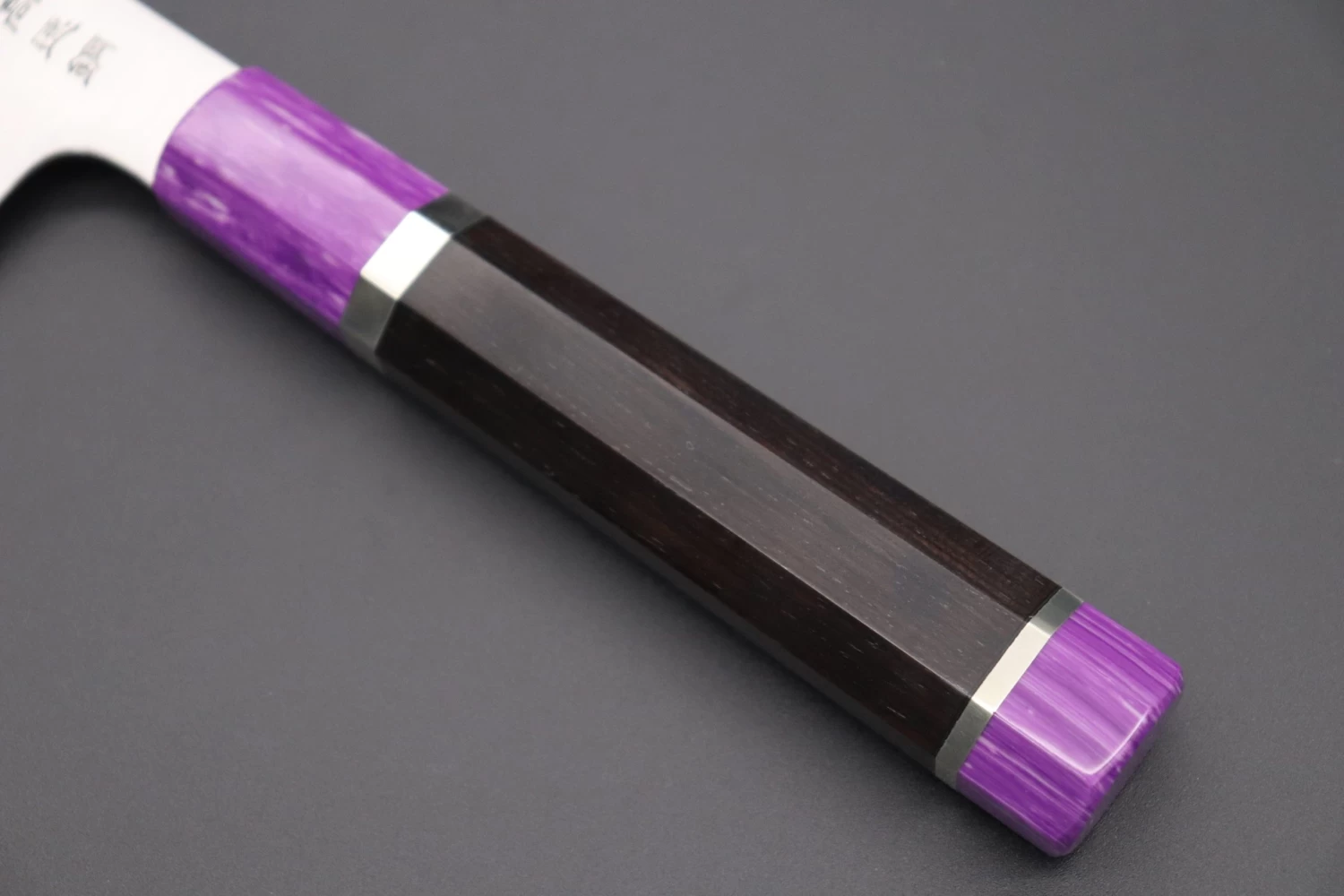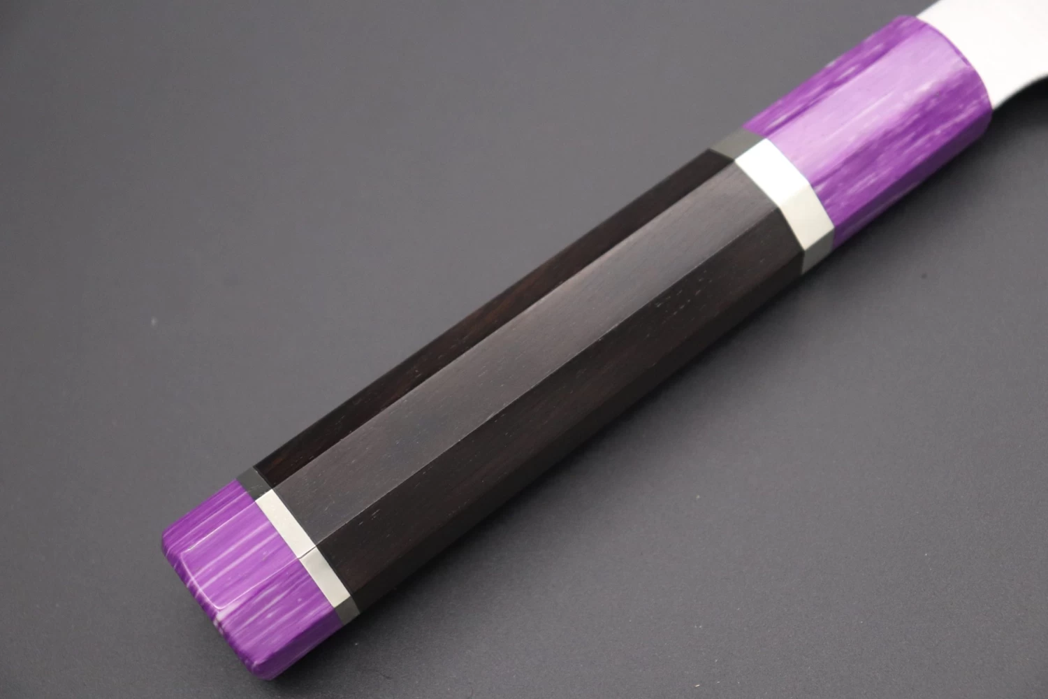 This Custom Limited Edition Sukenari HAP-40 Clad Wa Gyuto knife is fitted with a Innovative Octagonal Ebonywood Handle with Nickel Silver Spacers and a Royal Purple Composite Stone Ferrule & Butt. A matching Black Lacquered wood Saya (Sheath) with a black pakkawood Saya pin is also included with the knife.