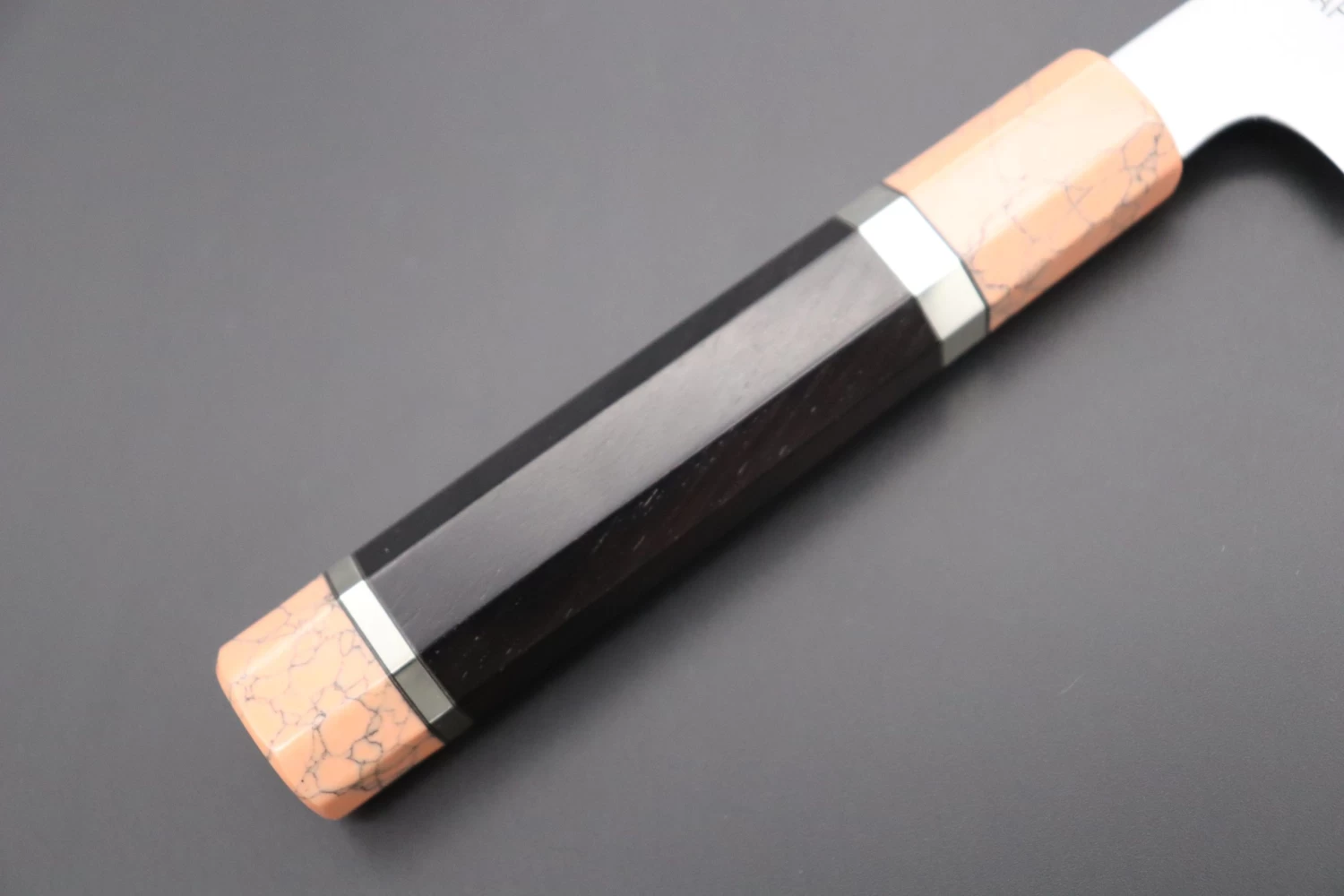This Custom Limited Edition Sukenari HAp-40 Clad Wa Petty knife is fitted with a Innovative Octagonal Ebonywood Handle with a Soft Pink Turquoise Composite Stone Ferrule & Butt with Nickel Silver Spacers. A matching Magnolia wood Saya (Sheath) with a black pakkawood Saya pin is also included with the knife.